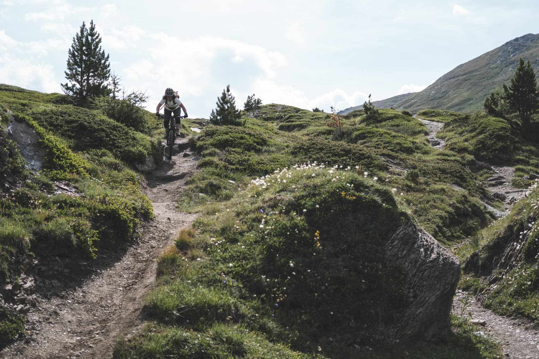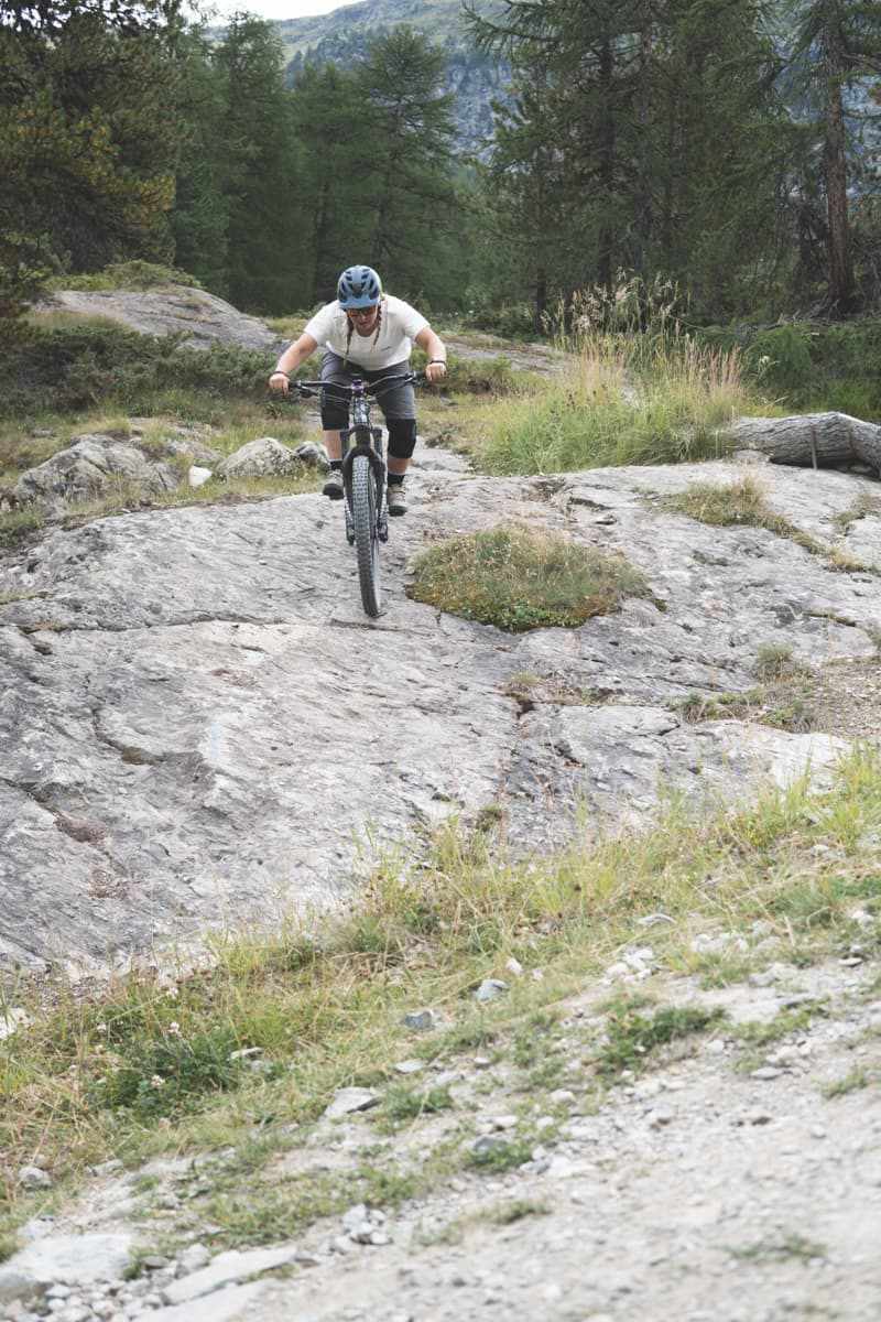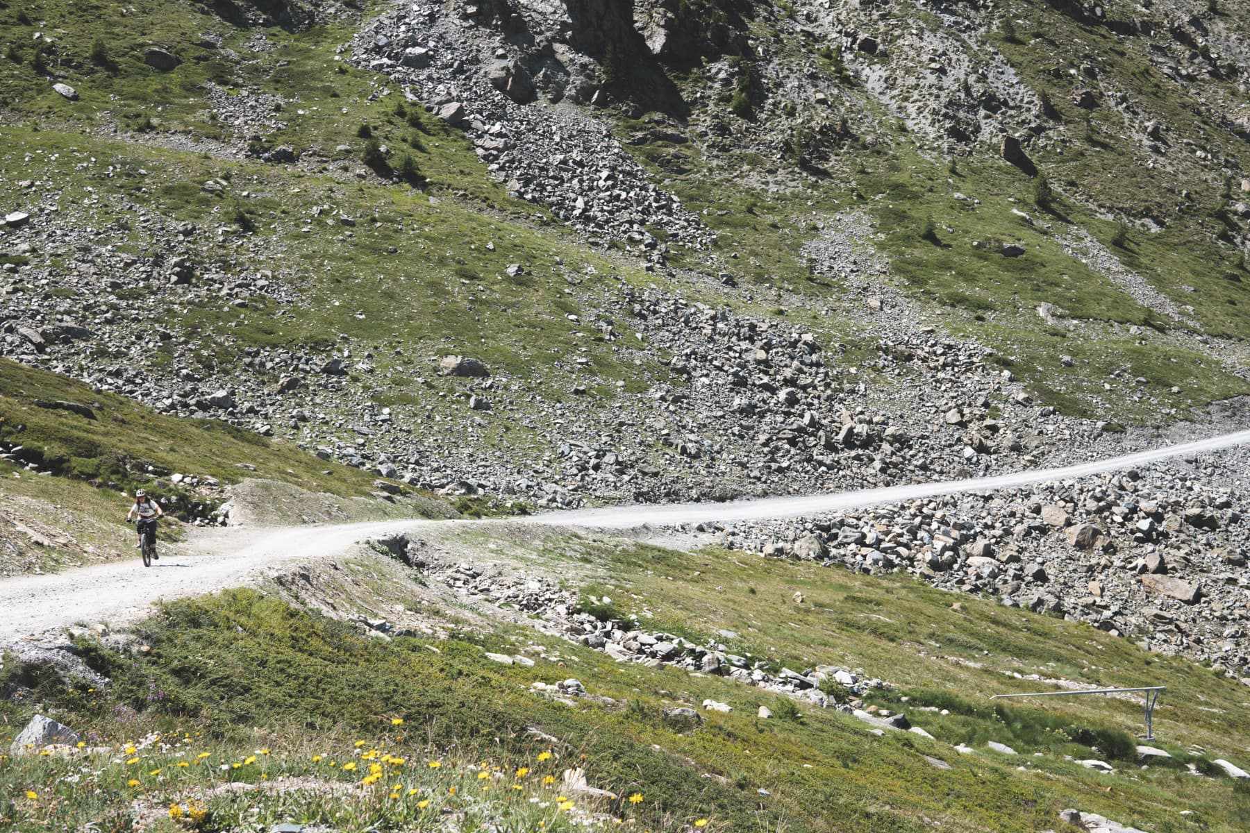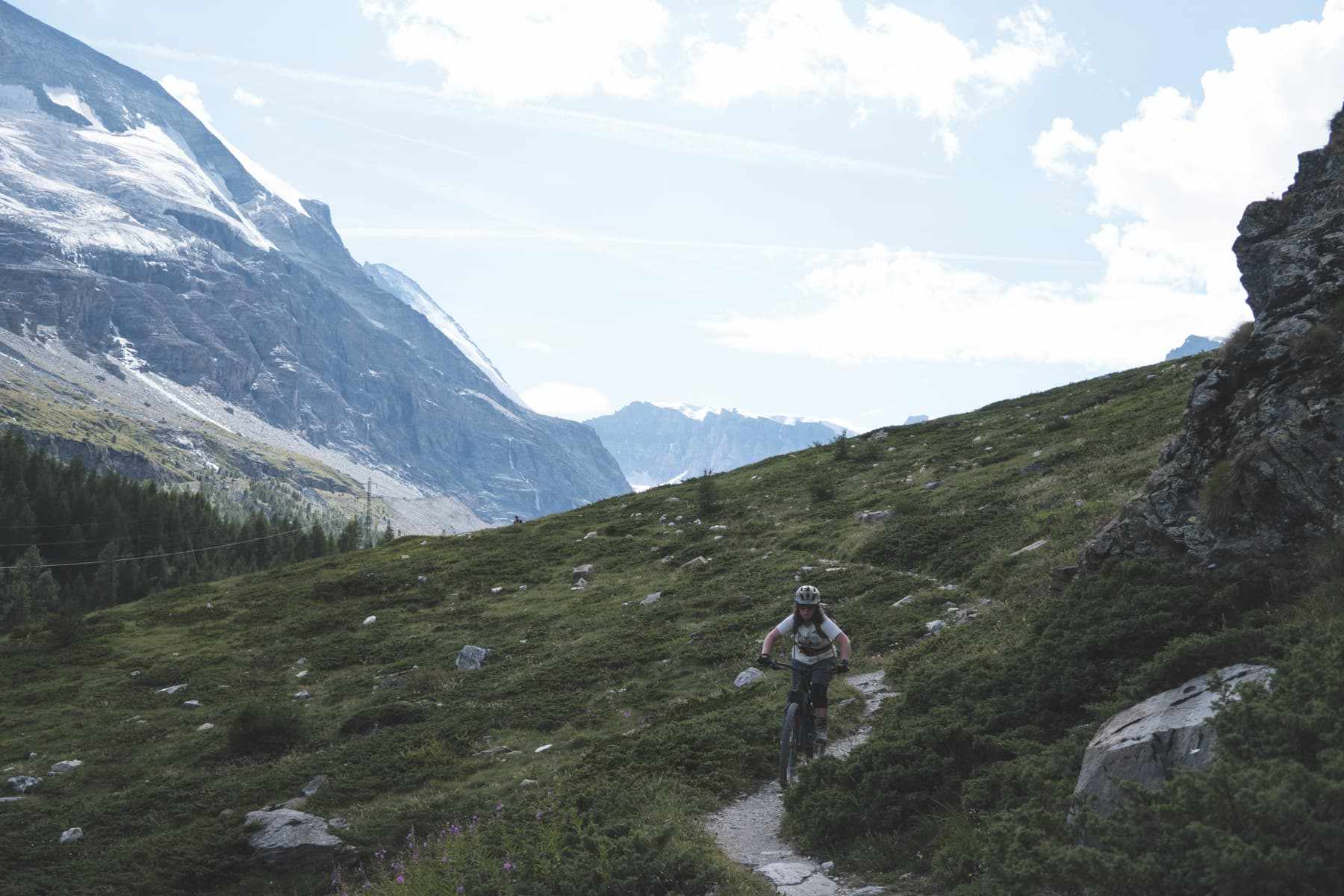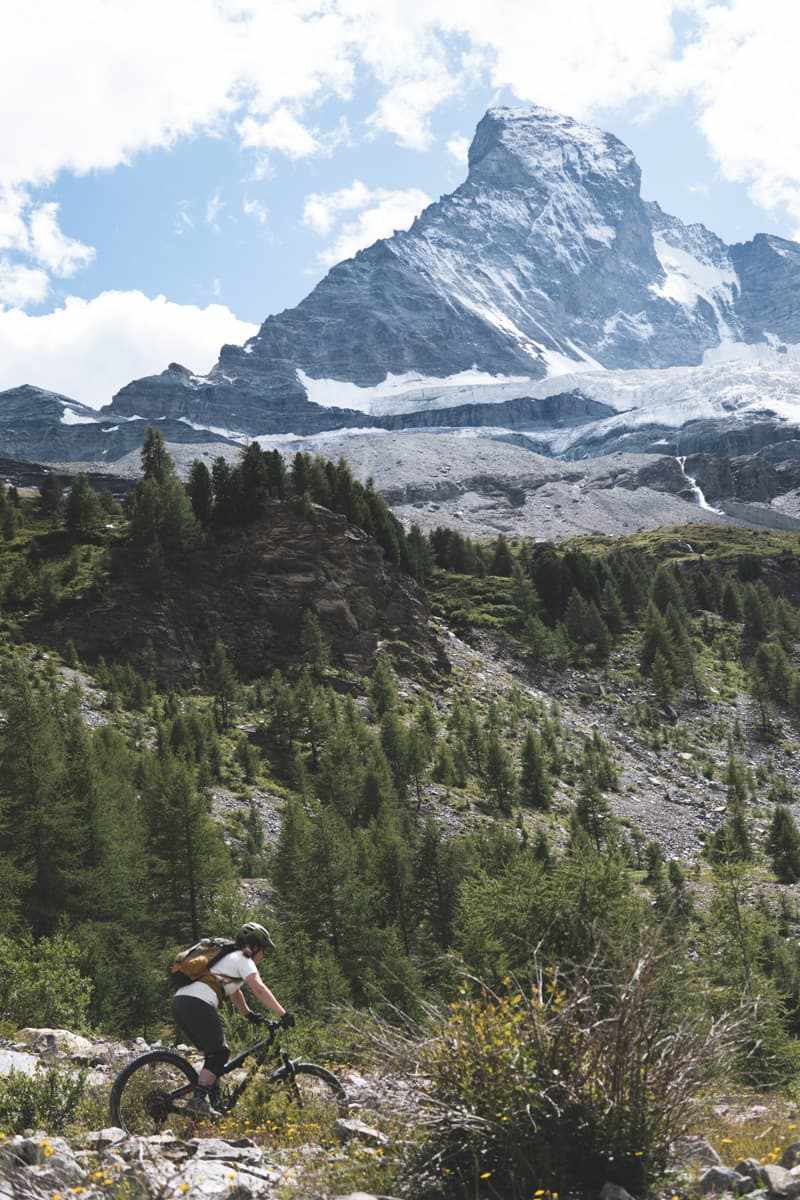 After fighting to get off the platform through over-excited tourists and one emergency pee later, we were on the bikes and heading down a fire road. It’s worth noting this kind of fire road isn’t the same compact, trimmed stuff you find in the UK. Picture a landslide of razor-sharp shale, combined with a harsh sprinkling of boulders the size of The Hulk’s left foot. It’s desert-level dry, feels like it hasn’t rained since the Matterhorn first sprouted, and we’re slipping and sliding down a trail shared with a double-decker coach-load of folk, who grind to a halt with a moment’s notice to claim their obligatory picture with the Matterhorn. We’re quickly led off the fire road and onto a much more familiar berm-filled, loamy section. It was at this point that Emma wet her pants. A marmot poked its head out of its hole, gave its little marmot scream and disappeared back into its muddy home. Emma has this thing about marmots – if she were given the choice between meeting Trump to ruffle his ‘hair’ and meeting a marmot, Trump would prevail over the scary marmot. It’s weird; we’re working on it.