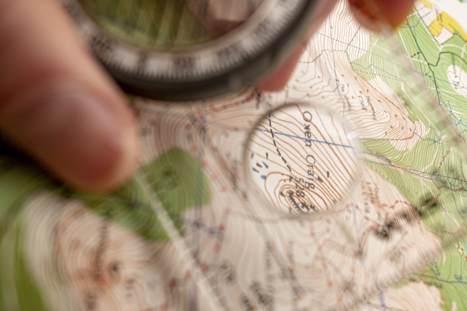 Turning our back on Oxen Craig, we ride bedrock at first, the trail using the natural ridgeline, but before long we’re on a built trail. It’s brutal. Rock steps just the wrong distance apart. This is a full-body workout just to keep on the bike, but soon the steps ease enough that features can be hopped or jumped, rather than bulldozed. This is classic Bennachie riding now; we keep the pace going across the plateau, skirting Craigshannoch, to our final climb of the day. Looking towards Mither Tap, its little sister, Nether Maiden, sits proud beneath. A vague trail leads off east under its gaze, taking us directly towards our marker post.