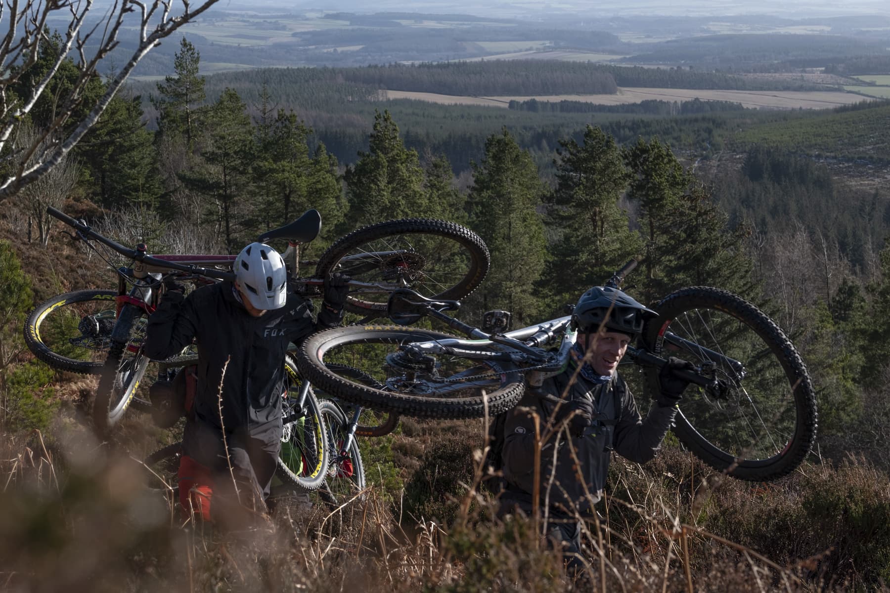 Threading its way down through the forest, it’s time to acclimatise to the style of riding here. The trail feels narrow and demands every bit of focus to keep the wheels rolling smoothly. The trees are close. Concentrate! Pedals bash off roots, then rocks. Ruts appear. Up ahead I can see Clark’s bike fishtailing wildly. Is he schralping or just skidding? It’s a great opener, and after the whoops have subsided, it’s time to pop saddles back up and wind our way across to the outlier of Bennachie – Millstone Hill.