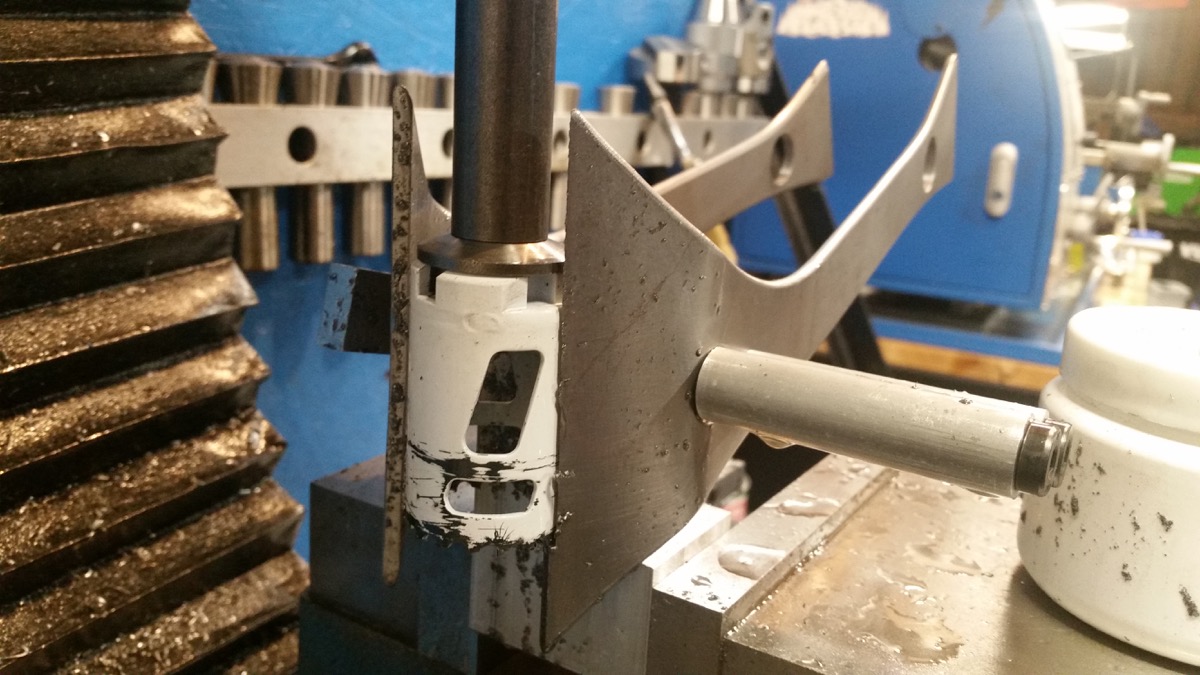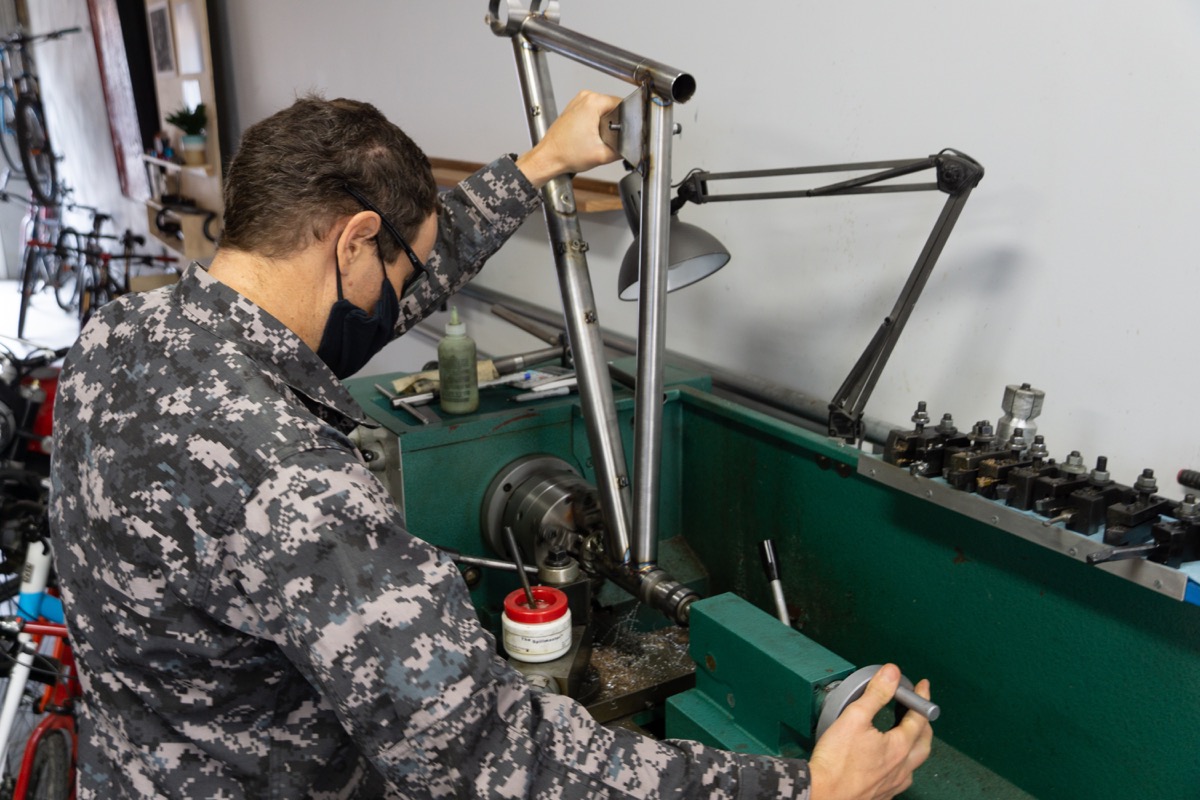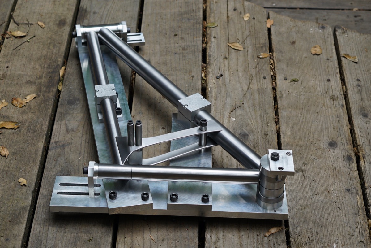 ‘I did all the mitering myself and fabricated all of the bearing housings, pivot hardware, concentric bottom bracket shell, concentric bottom bracket axle, head tube gusset, shock to main pivot struts, and swingarm brace all by hand and on a manual mill and lathe. The uprights connecting the main pivot to the shock mounts took 5 days in total. They started as 4mm thick steel plate which I laid templates on top of and cut out using a jigsaw and a handful of blades. Then finished with a flap sander, files and emery cloth. Getting the precise bends required was difficult and machining the shock mount and pivot holes was even more difficult. I don’t really want to build those parts again, but they were necessary to have the frame be strong under hard bottom-out forces. Without them the frame would most likely bend!‘