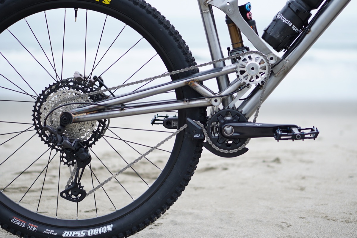 ‘It is custom. I designed it myself. I was unhappy with how most high-pivot bikes have a lot of drivetrain noise and drag that comes from the small idlers with inadequate bearings. A 22 tooth idler is the same size as the smallest front chainring used when triple chainrings were standard. The idler being larger than the 16 tooth on the Forbidden and 18 tooth on the Deviate allows it to last longer and run smoother. There is a larger surface area that the chain is in contact with which reduces the concentrated loads on the idler’s surface. The larger diameter also means that the angle change that each chain link has to make as it meshes onto and off of the idler is less meaning less friction. I also use a very big double-row bearing that is more than up to the loads seen from hard pedaling. I did the calculations and actually found that most idlers have bearings that aren’t properly up to the task. They actually get damaged from extreme pedaling forces! One other benefit of the forwards idler position is that it reduces the angle of your chain in the extremes of the cassette. Therefore in your climbing gears and descending gears there is less friction loss from the angle of the chain grinding teeth.‘