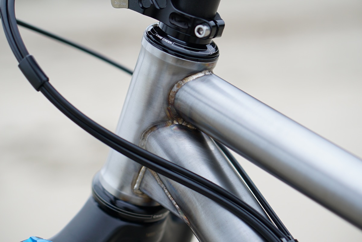 ‘It is a Paragon Machine Works seat tube sleeve welded to a 1-3/8″ diameter .035″ wall tube This effectively shims the thin walled tube down to 31.6mm to fit a dropper post. This is a common part used for custom frame builders. It saves 220 grams of weight out of the seat tube compared to using a straight wall tube of the same outer diameter that fits a 31.6mm dropper on the inside.‘