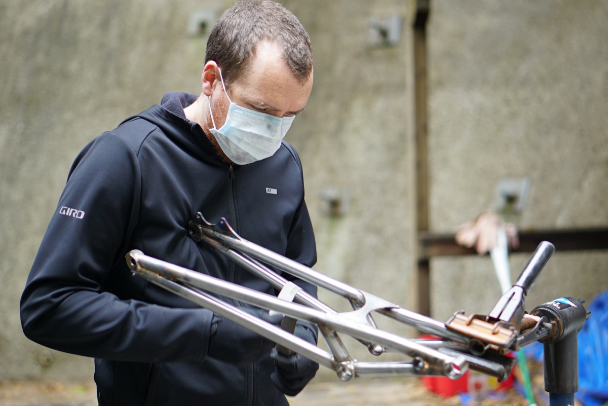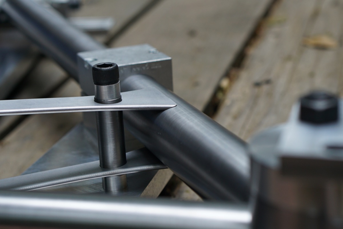 Oh my, what do we have here? It’s like all our nerd buttons are being pushed at once. Where shall we start? With the shiny steel aesthetics? The steam punk drive train? The what’s-going-on-there suspension platform? The beautiful mitres and construction process images? Choices choices. So much stimulation of the nerd nerves. Quell that quivering heart and just let your eyes roam over a few images.