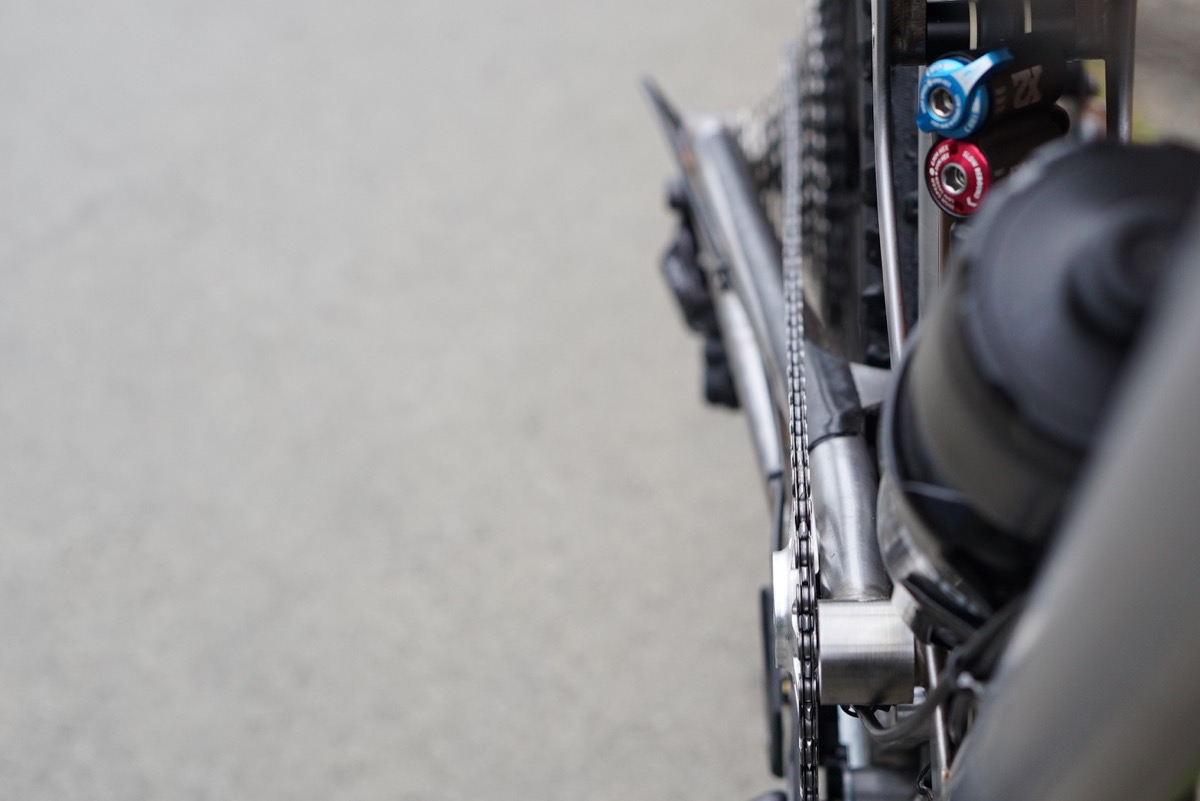 Let’s start with the drivetrain. By using an idler, Evan seeks to control the anti-squat and minimise pedal kick back. Idlers however can be noisy, have poor efficiency and poor durability. The idler sits just behind the pivot point and this particular one is custom machined with 22 teeth. I asked Evan whether this idler wheel was designed for form or function?
