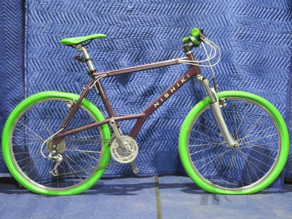 He says: The last year that Nishiki produced the Alien, this version of the original production elevated stay bike was an exercise in economy, welded out of simple large section aluminum tubes, rectangular for the top and downtube, this bike was accessible and purple. This example features an XT wheelset, brakes, rear derailleur and crap crank and SunTour fork and a bunch of BS lime green late model garbage parts. This bike might have been a mistake despite it being an elevated chain stay, rare, purple and my sizish, but I’ll revise it a bit with a proper fork (RS1?) and crank off of the Wicked Fat chance. Still, with all its garishness it will be the most looked at bike in the North Go-Ride store rafters while the frame and XT parts appreciate in value.