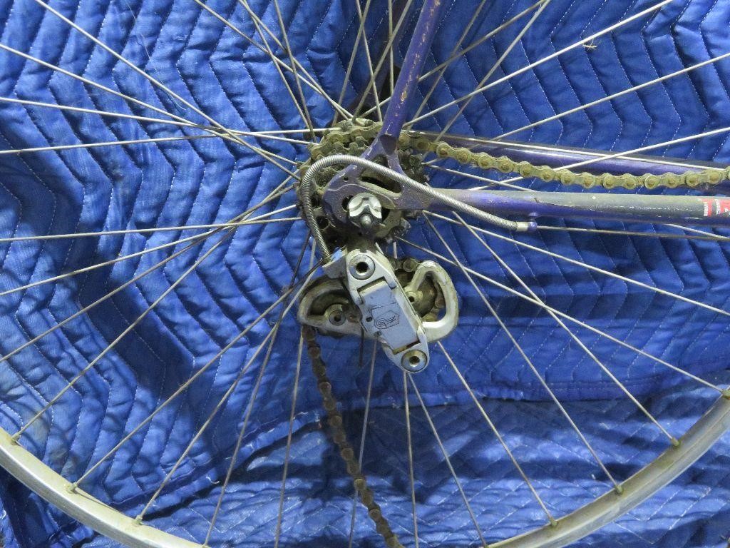 He says: Probably my best purchase besides the ’89 Alien and ’93 AMP B2 and significantly less expensive, These were the glory days for Western States Importers, with Diamond Back MTBs and BMX (note logo styles) and Centurion, their road brand, exhibiting the best of Japanese production, handmade lugged frames with Tange tubing. Pinstriped detailing and pre-indexing SunTour Superbe Tech with unique cable housing stop and guide tube frame braze-ons, large flange Suzue hubs, bull moose bar, flat crown original fork (these did not often last!). Original reflectors and pie plate. Amazing! Total show piece. Gets hung in North Go-Ride rafters for all to admire.