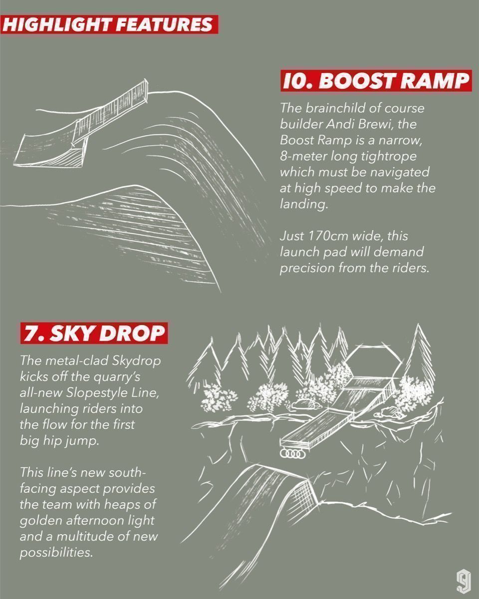 “This year some of the features will be a real testing ground to push limits and send it into some serious airtime,” says Clemens Kaudela. “The quarter-pipe in particular will be a lot of fun, since Sam and I battled it out for the highest jump back in 2017 at Nine Knights in Reschenpass. Expect some heavy sessions.”