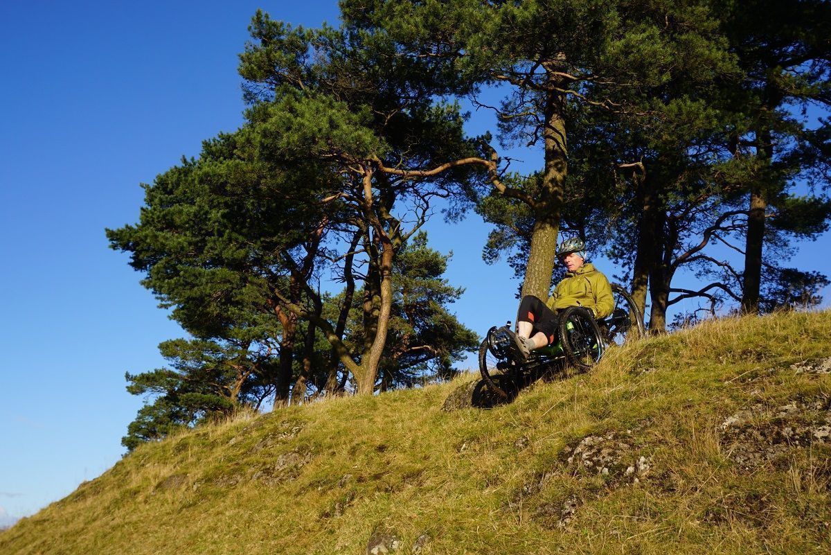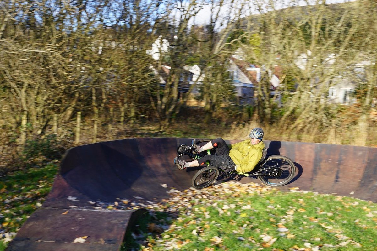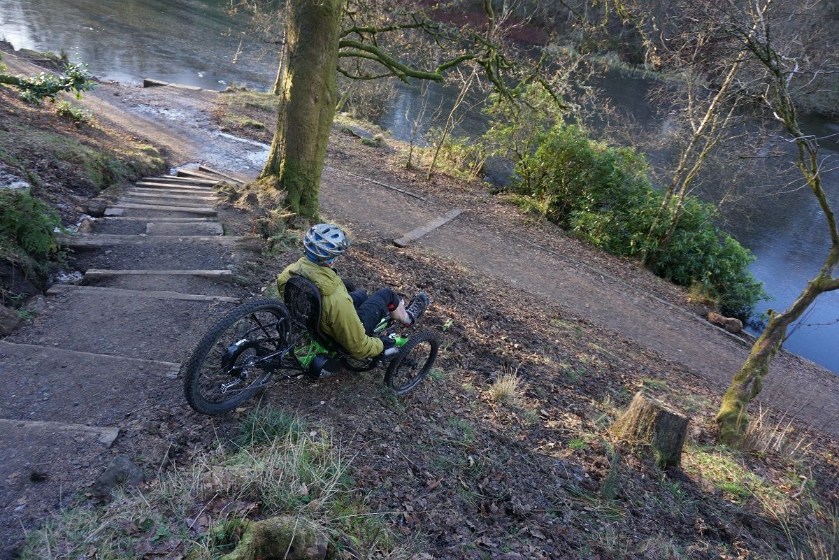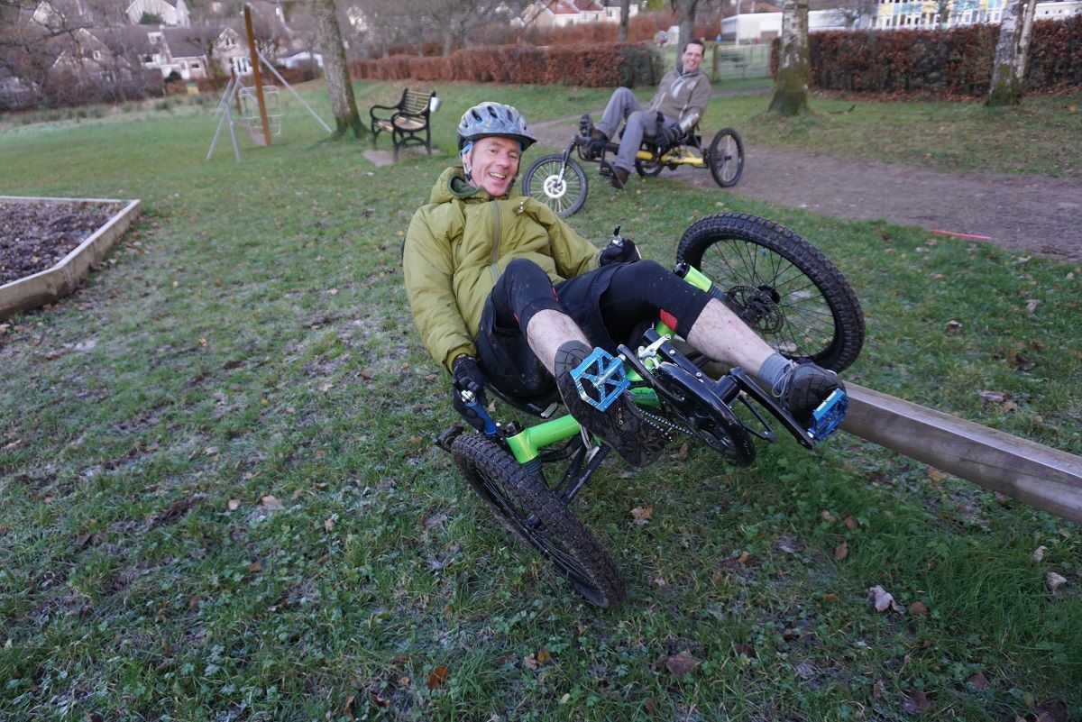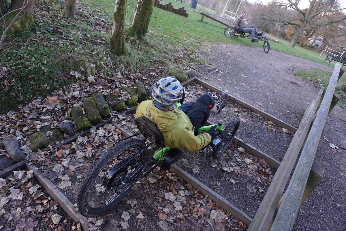 Trails I have ridden hundreds of times were taking on a fresh (and dare I say hugely enjoyable) new perspective. Rounding a corner, we came across what could have been the stairs to our Dalek – upright wooden granny stopper boards on the trail. Ostensibly designed to impede the progress of anyone on wheels, prams and pushchairs included, I watched with no small amount of being impressed as both Ben and Gary made short work of them. Slow down, control the power, up and bump down, repeat. Call it Recumbents one, Path Builders nil!