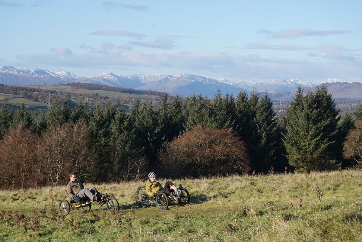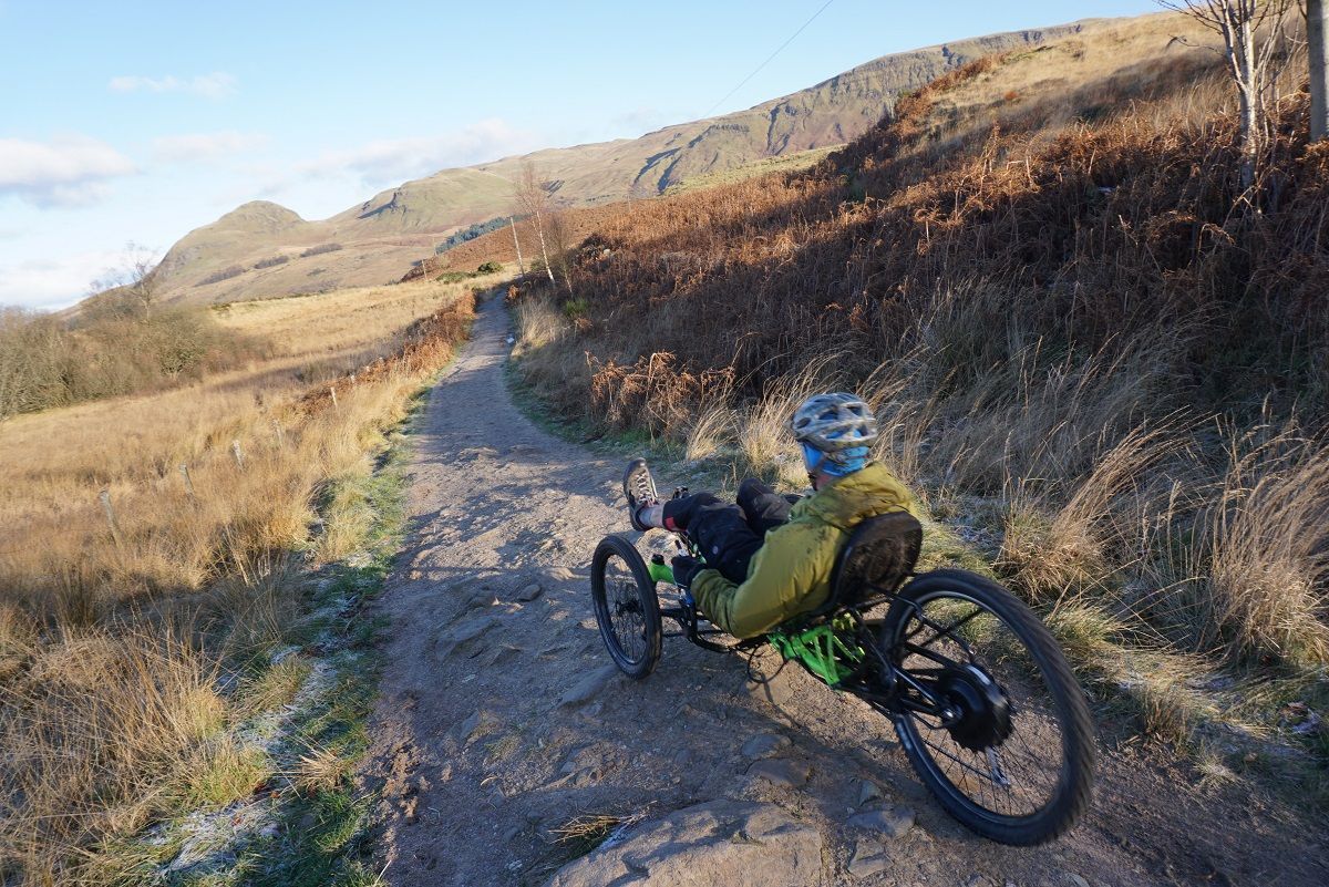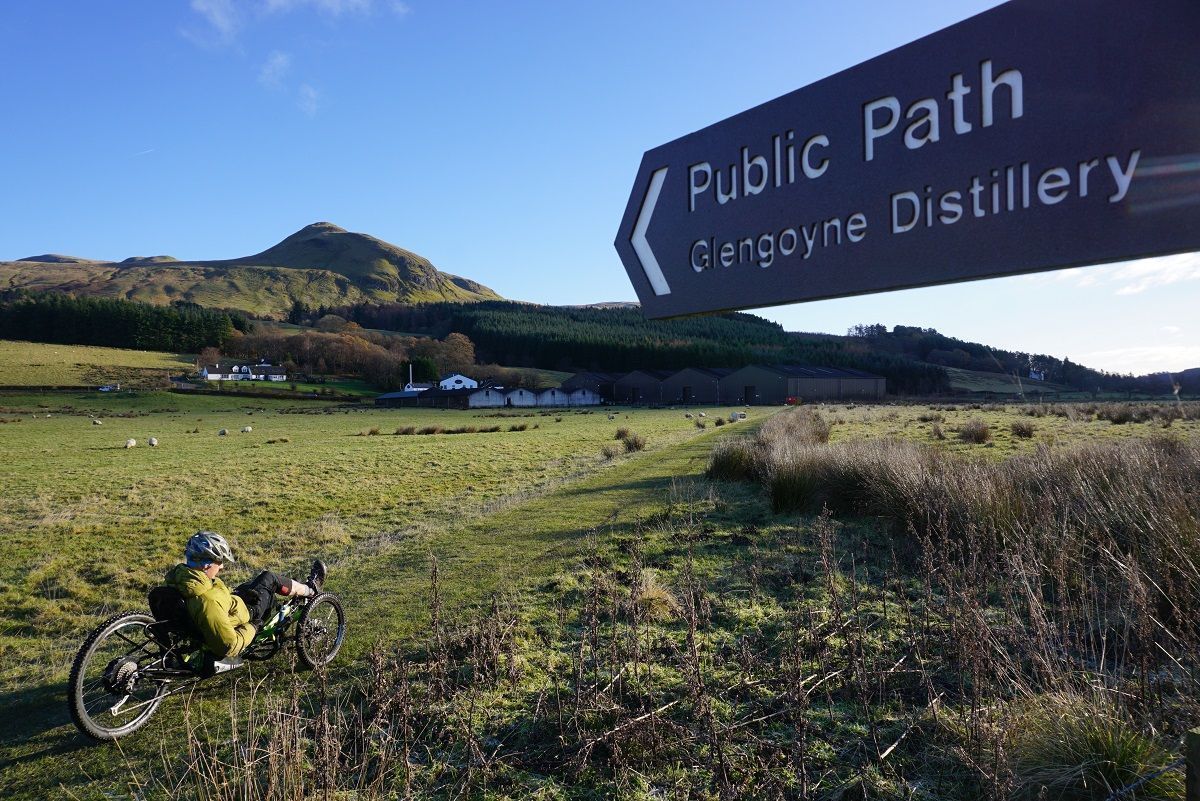 Passing the distillery, we faced a steep brute of a climb up onto a trail that follows the line of the aqueduct that feeds the water supply into Glasgow. A feat of Victorian engineering, it affords views along the length of the Blane Valley and is a bit of a favourite among the locals. Knowing we had the power of the motors at our disposal, the only thing on our minds was to see how fast we could get up the climb. As Ben raced ahead, Gary came to an unedifying and sudden stop. “I’ve lost all power!” he exclaimed. Quickly becoming apparent that an e recumbent without power and steep hills make for a “challenging” proposition, all three of us hummed and hawed over how to try and fix it. Switch off, switch on and repeat. Nothing. Zero. Zip. Nada. Things weren’t looking particularly promising as we set about removing the battery and checking all the cable connections. “It could be an early bath for you, Gary!” I thought out loud, rather unhelpfully.