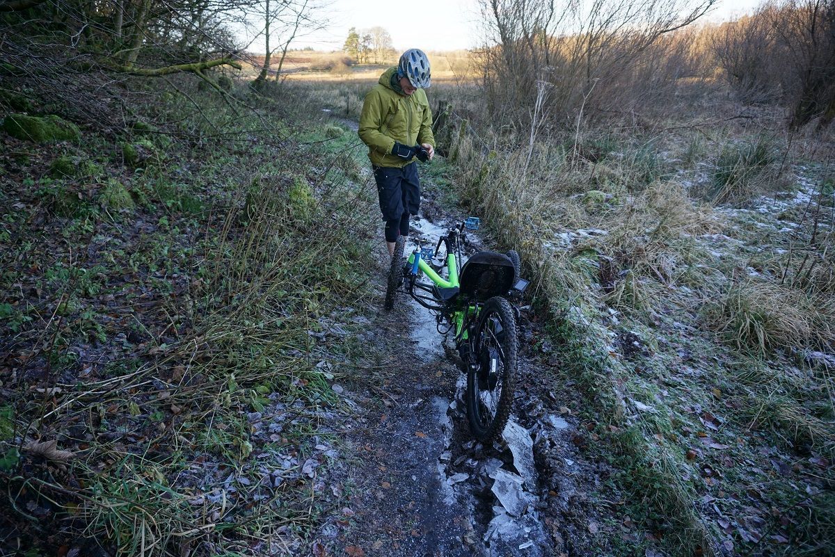 “This is brilliant!” shouted Dave, an enormous grin on his face, as he managed to make the rear wheel drift out. The combination of electrical assistance and a low centre of gravity meant that we felt like we were drifting legends as every corner was taken with relish. Of course, pushing the envelope in the way that only two middle aged men who should know better manner led to the inevitable tipping incident. As it transpires, it is a lot easier to flip a recumbent over than you might expect, especially when you are going full bore into an icy corner of off camber tarmac and turn hard on the bars. Who knew eh? Apparently everyone! Undaunted, we pressed on. The trail was calling.
