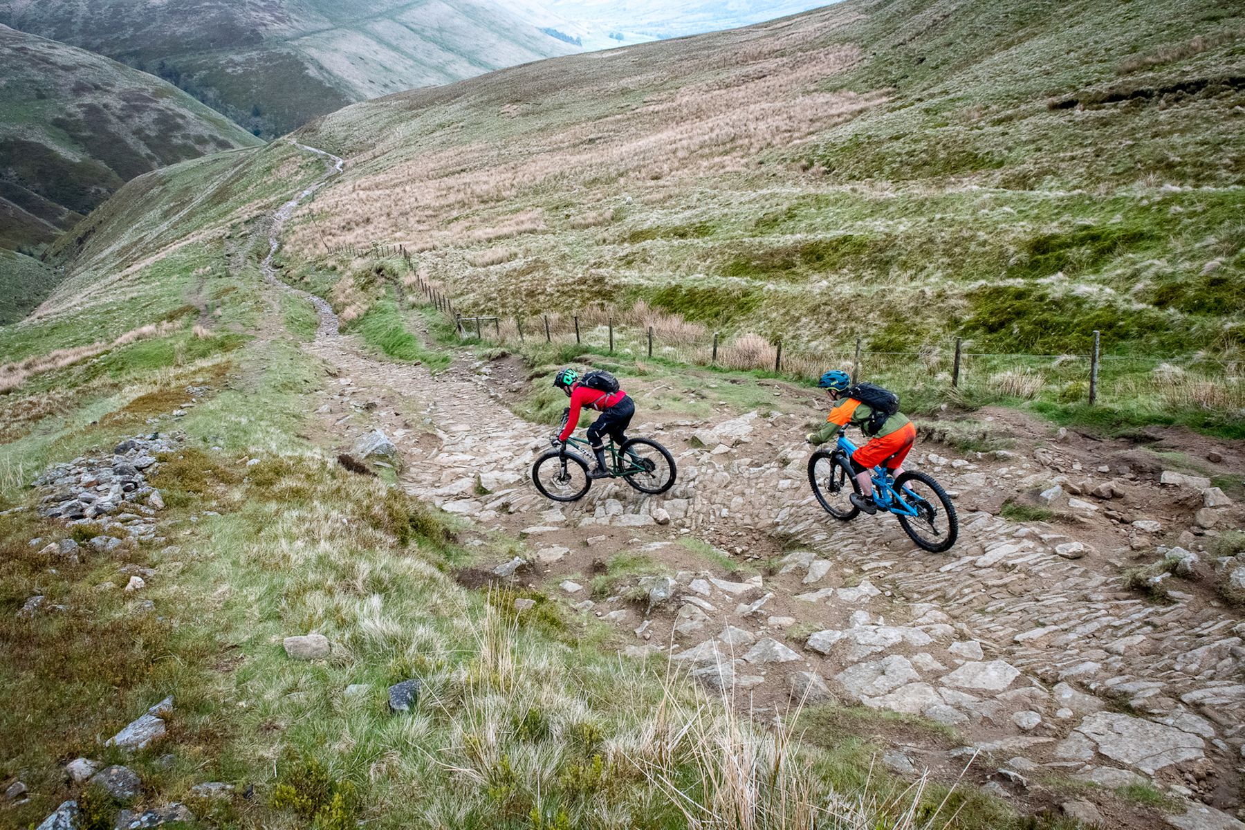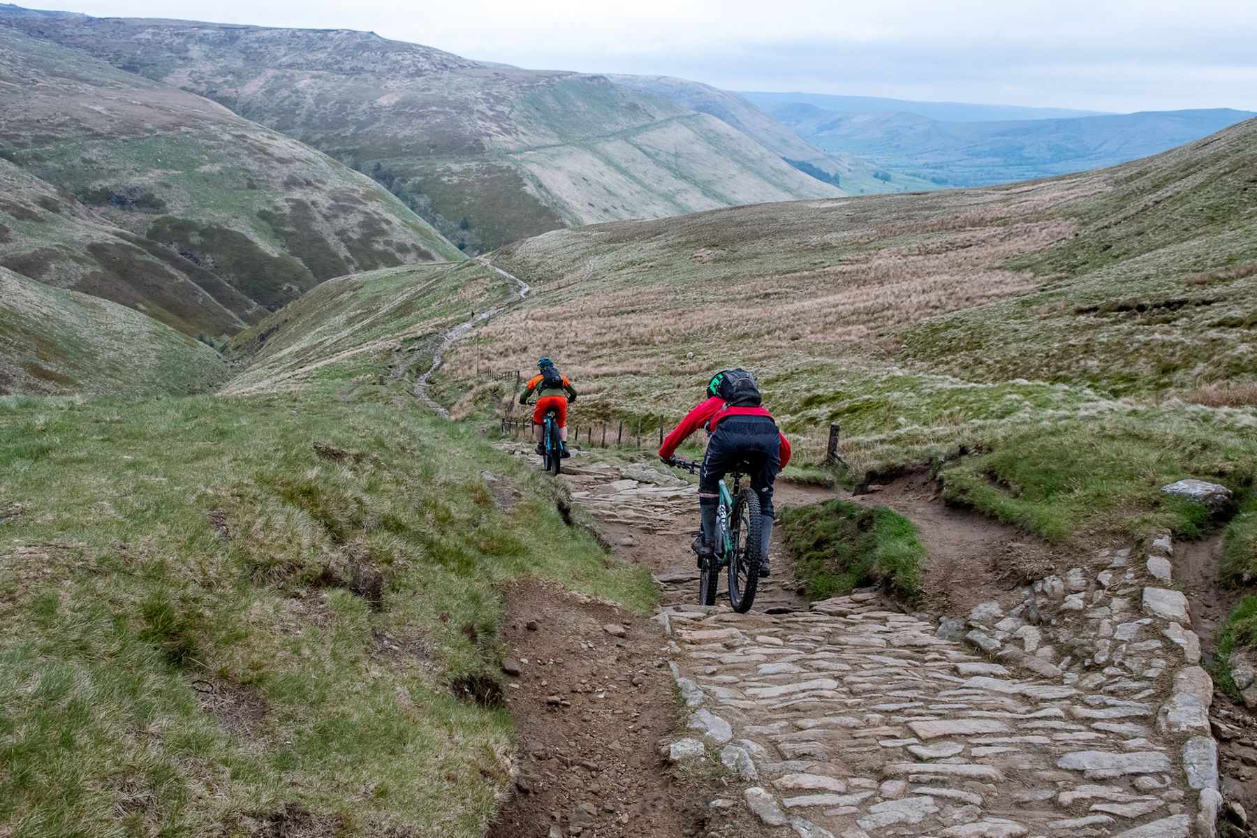 Derbyshire County Council, it’s fair to say, has form when it comes to – uh – creatively interpreting guidelines for the maintenance of some Peak District trails. This ancient thoroughfare is a case in point. It’s long been an entertainingly tricky thing to ride as a climb as well as a descent. Twenty years ago, scrabbly, rocky doubletrack gave frequent way to limestone bedrock slabs, requiring frequent thrutchy step-ups and no small amount of luck to clean. As a descent, then, any speed over the slabs would quickly give way to thin air, which could be entertaining if not anticipated. It was a lot of fun. While it’s certainly true that improvements needed to be made to enable easier access to folk who aren’t on mountain bikes, I’m not totally sure that concreting in a load of stone slabs, to make a sort of crazy-paved patio, is the best way to achieve this. It’s not without entertainment, but it does somewhat feel like a small corner of the Peak District is doing its best to emulate a garden centre.