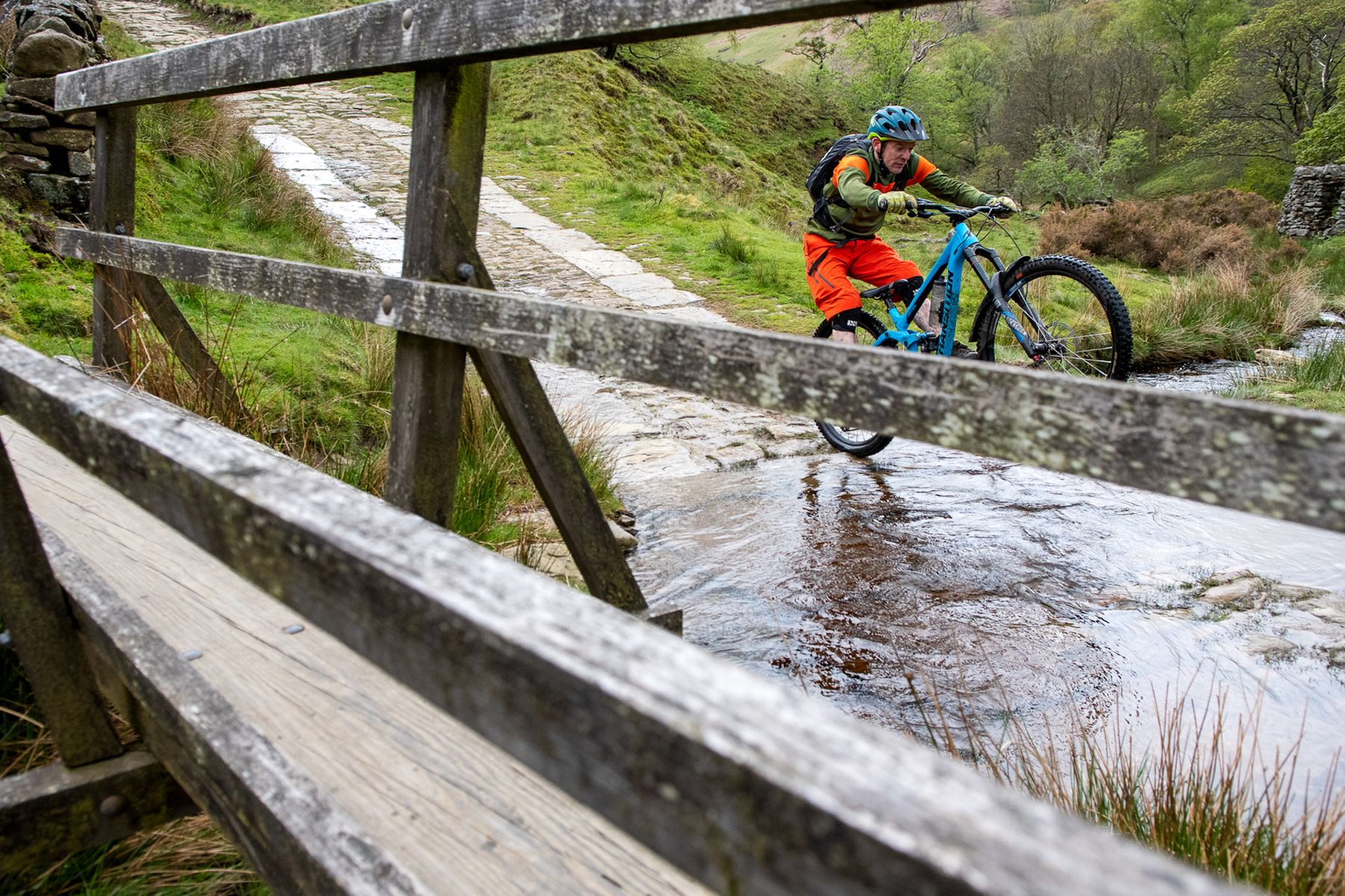 Ooop – a step-down. Another drop, there. And there. And then a long chute, which seemed simple compared to the stuff above it – until it wasn’t. A corner; more high-speed clattering. A quick dog-leg, and then a straight run to a ford at the bottom. Blimey. That was fun.