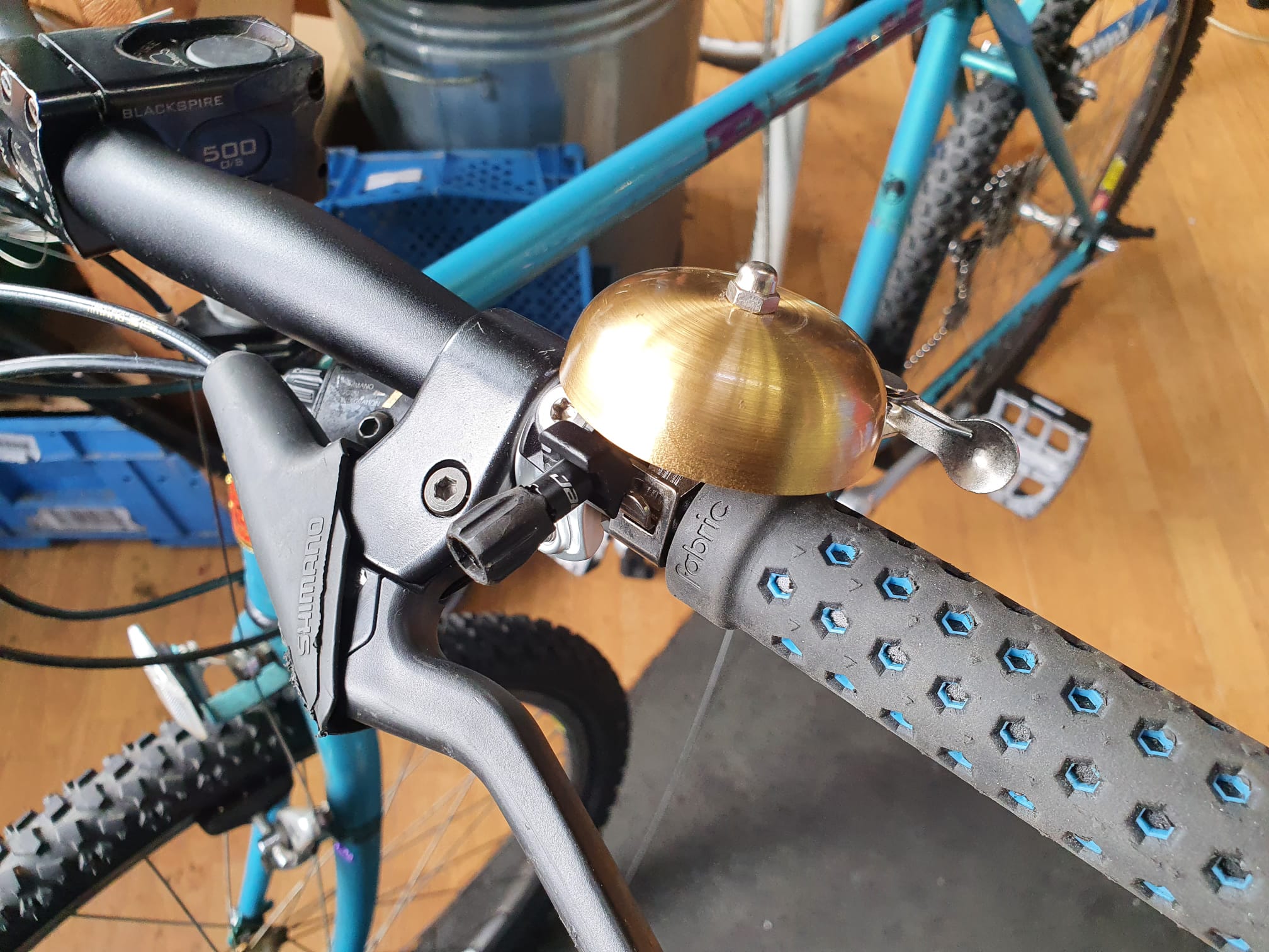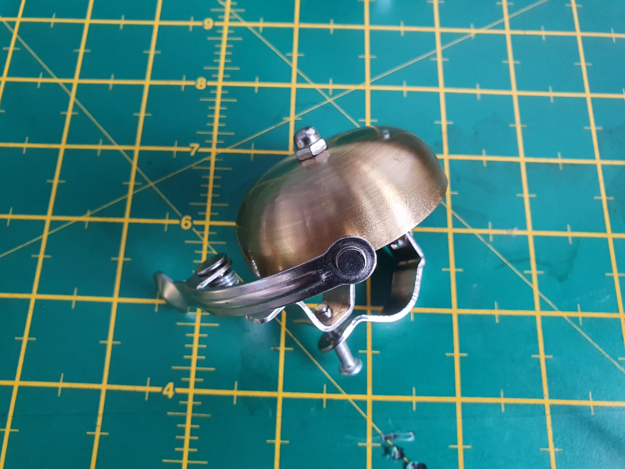 I had this very fancy looking bell on my workbench, it had a nice powerful spring with a lot of lever throw, all I’d need to do would be to attatch an outer cable stop and drill it to fit a cable end!