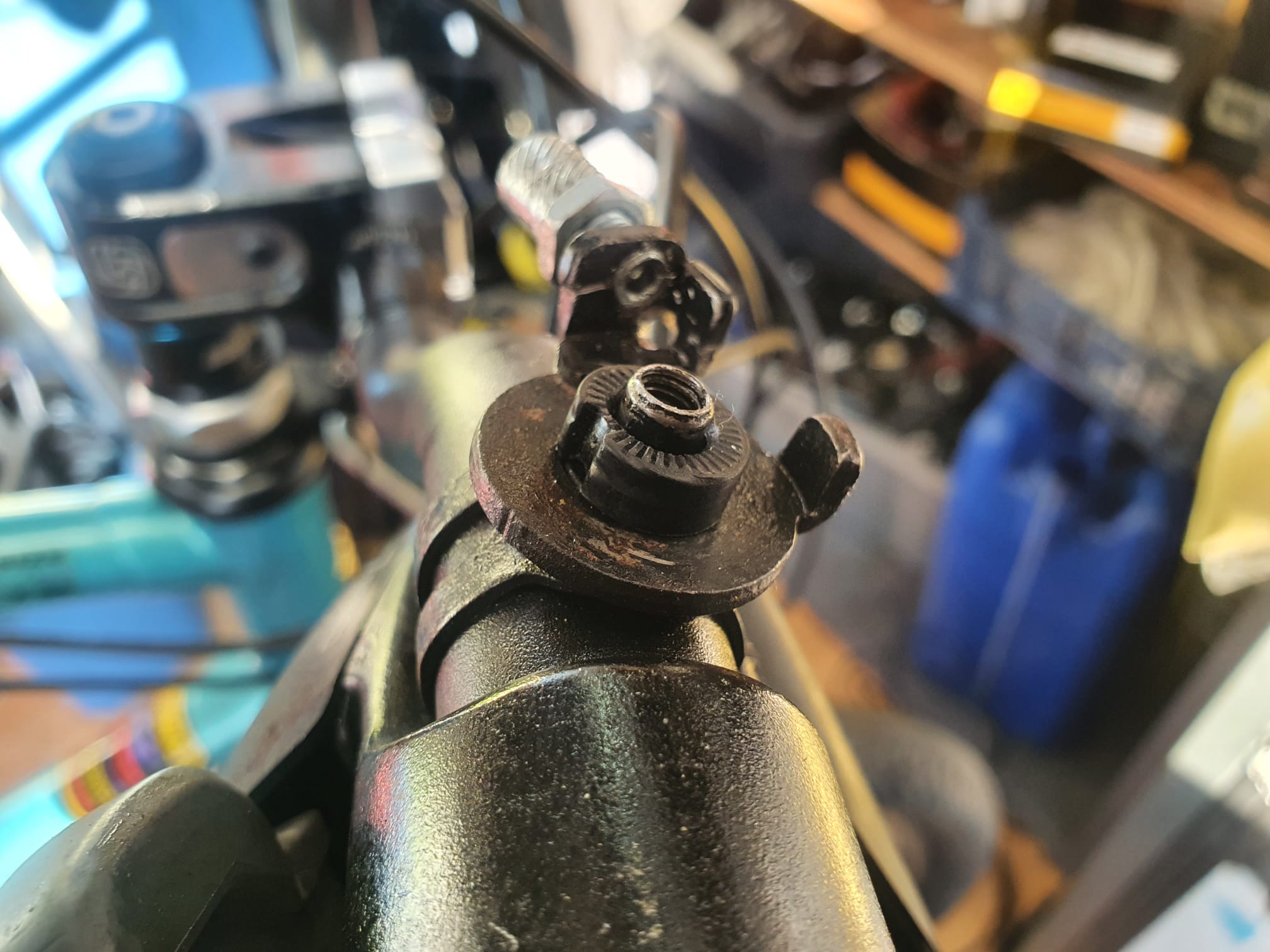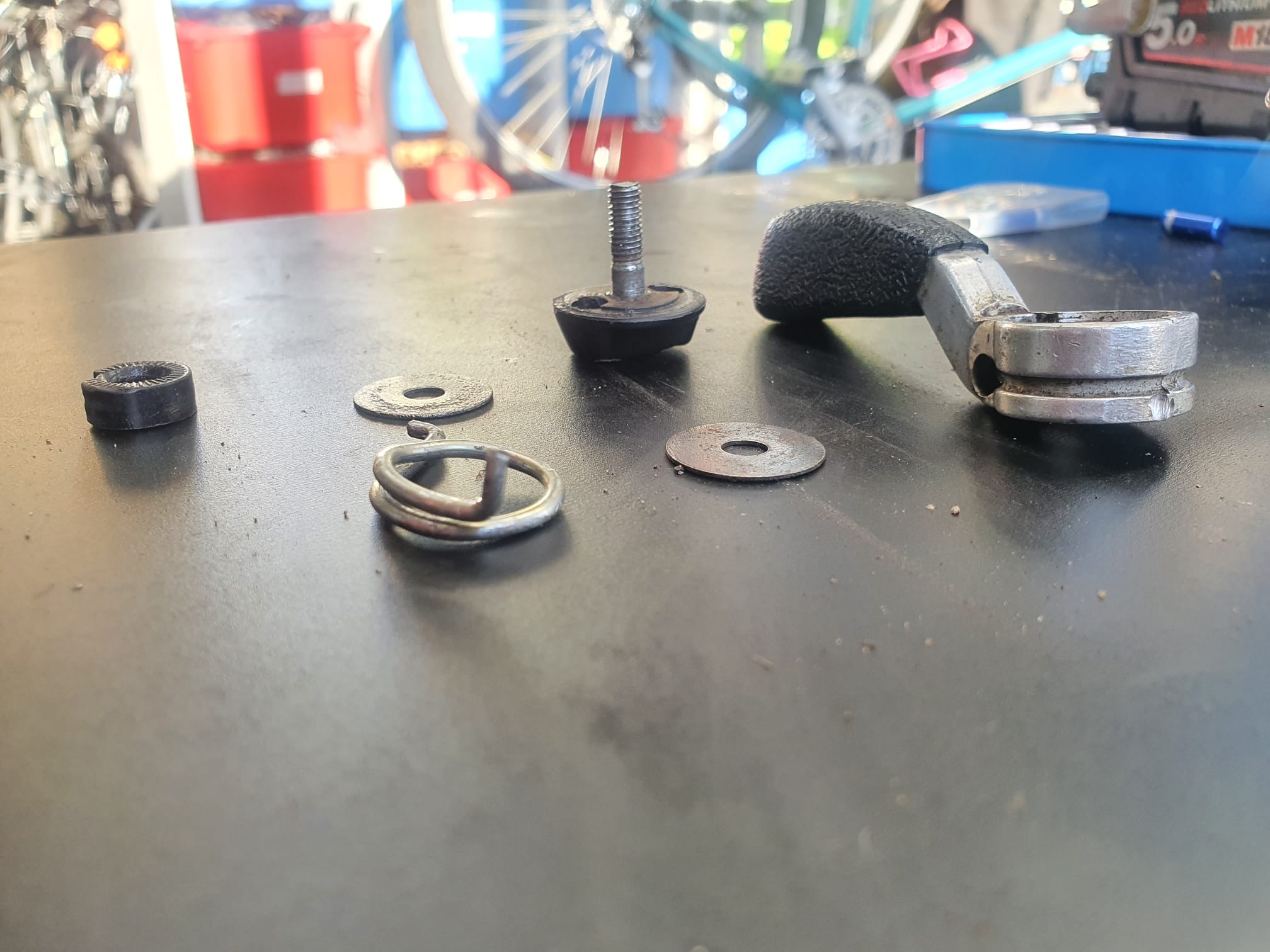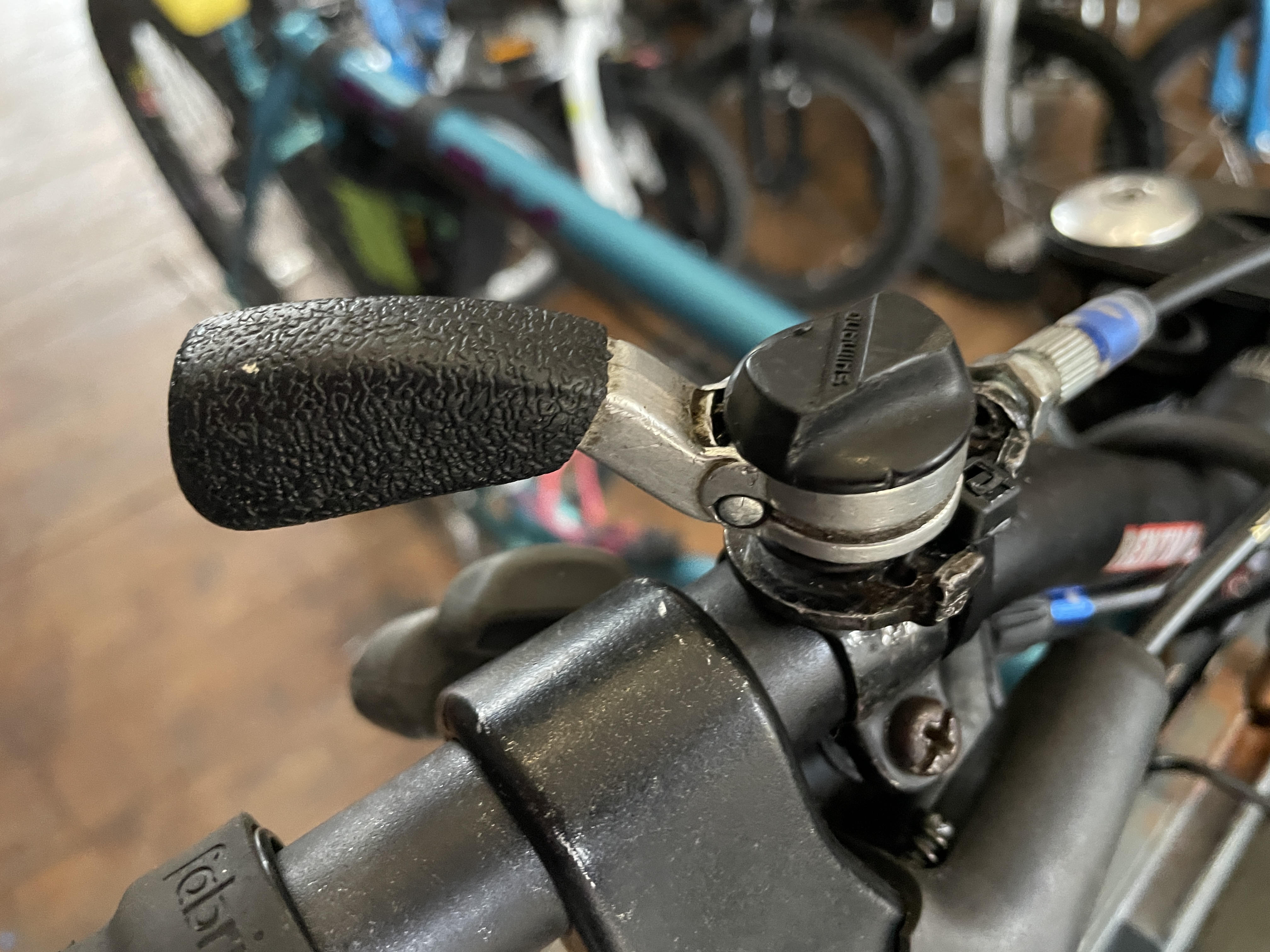 A few weeks later I was scraping through the bottom of our second hand shifter box at the shop and I found a few broken bits of old thumb shifters that, slotted together in the right order sort of looked like a dropper lever. But not any dropper lever you’ve seen before, it looked like the kind of remote dropper lever that would have come with this bike if droppers had been available when it was new. And yes, before the pedants write in I’m fully aware there was a remote for the Hite Rite but that wasn’t a dropper post as such.