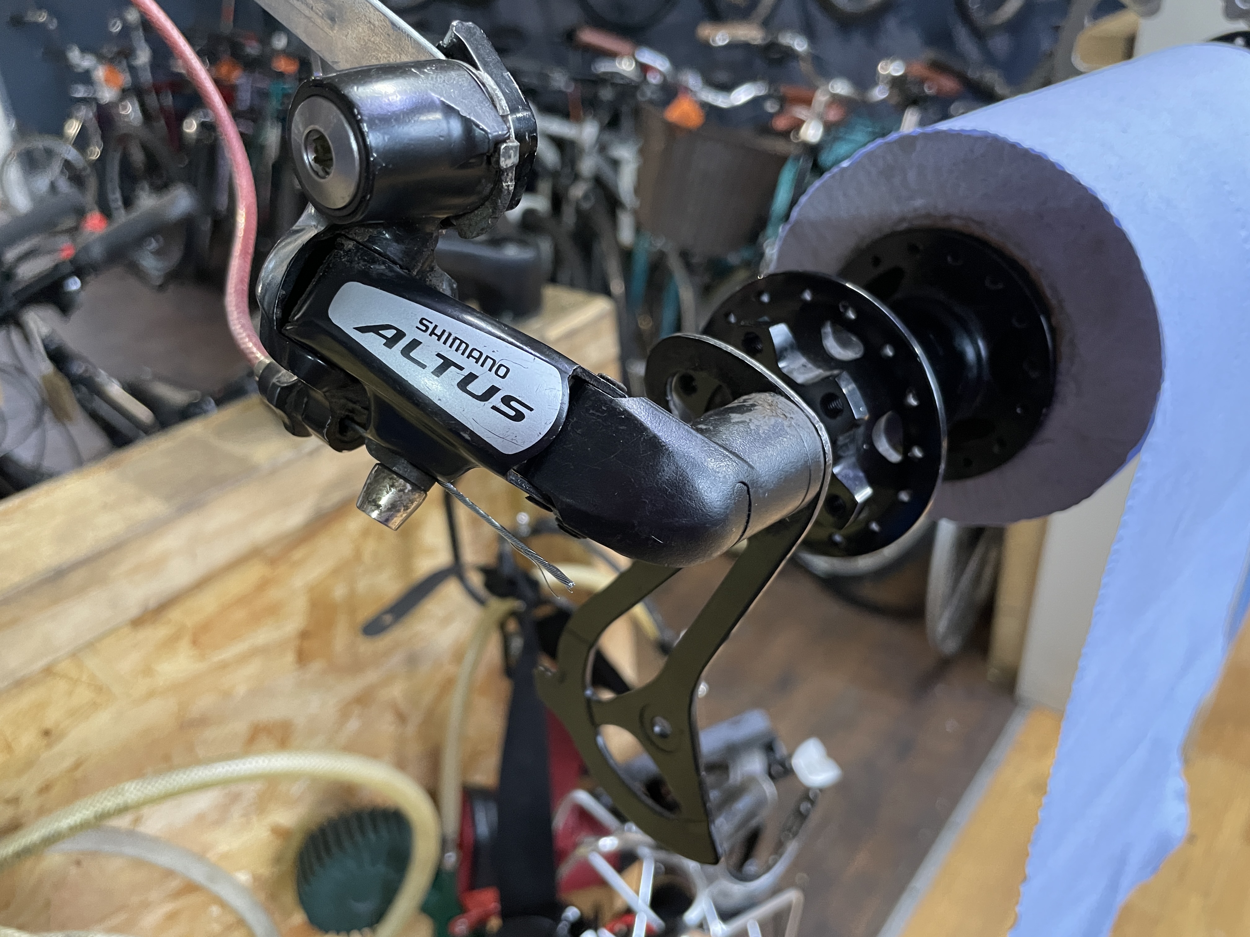 Considering it’s made out of scraps from two different shifters, a washer from a rack, one 6mm cable end with the closed end cut off and one V-brake caliper, it works remarkably well!