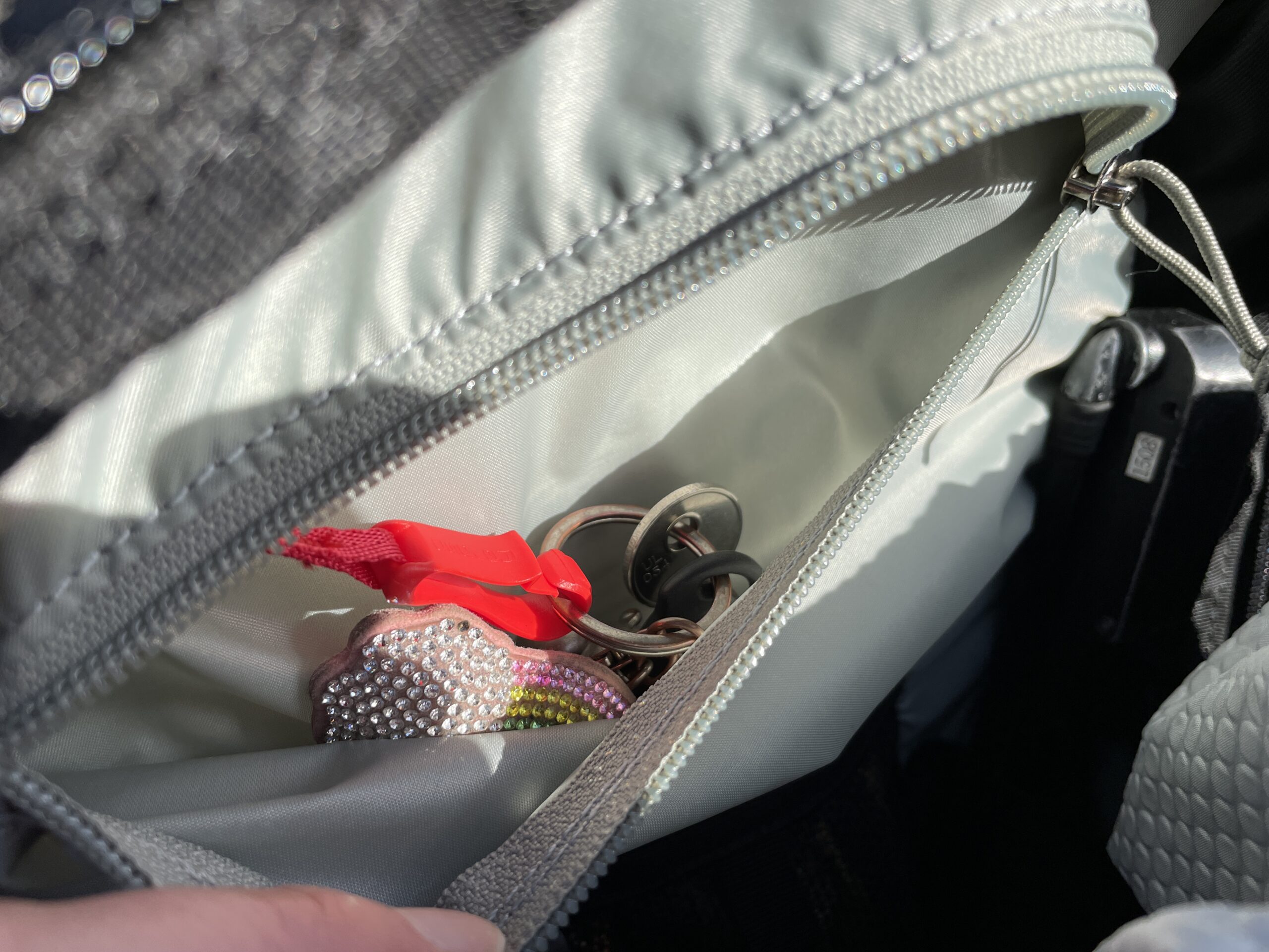 The upper section does have three small pouches inside it. The middle one doesn’t extend the full length of the pack, so was too shallow for my shock pump, while the side ones go all the way down, but don’t come up as far as the middle pouch, making them too short for my shock pump too. But maybe it’s only bike journey that carry shock pumps? The side pouches were the perfect size for my (tyre) pump – which should really be in the bottom tool section, or maybe strapped to my frame. In any case, I think you’ll likely want to use these pouches for any snack bars, because if you just chuck them in the main section they’ll work their way right down so they’re tucked in that lower part of the main section that hides behind the lower tool compartment. There is also a zippered pouch in the top of the main section with handy key clip, so there’s no digging around at the end of a ride for them. I think it’s also worth noting that before you can really get into that main section, you’ll have to unclip the full face holder/compression straps, because they clip over the top of the zip to the main section.