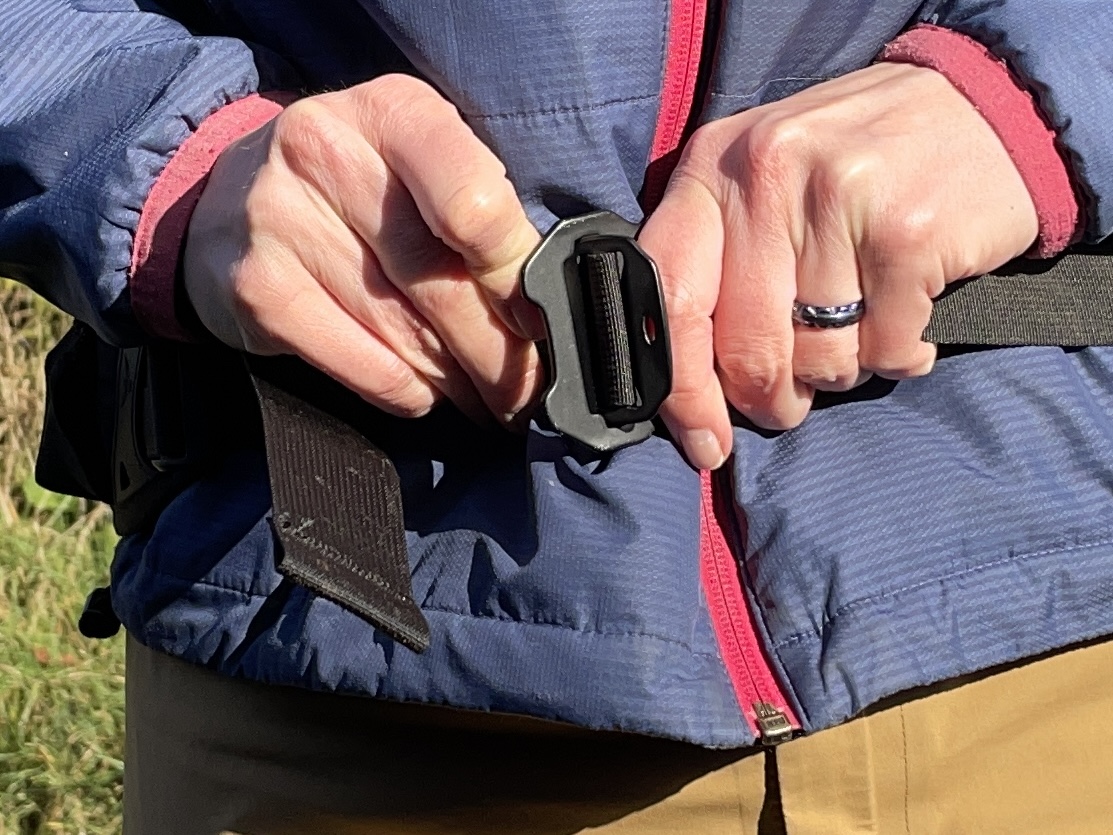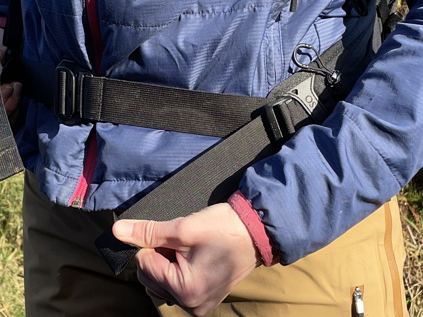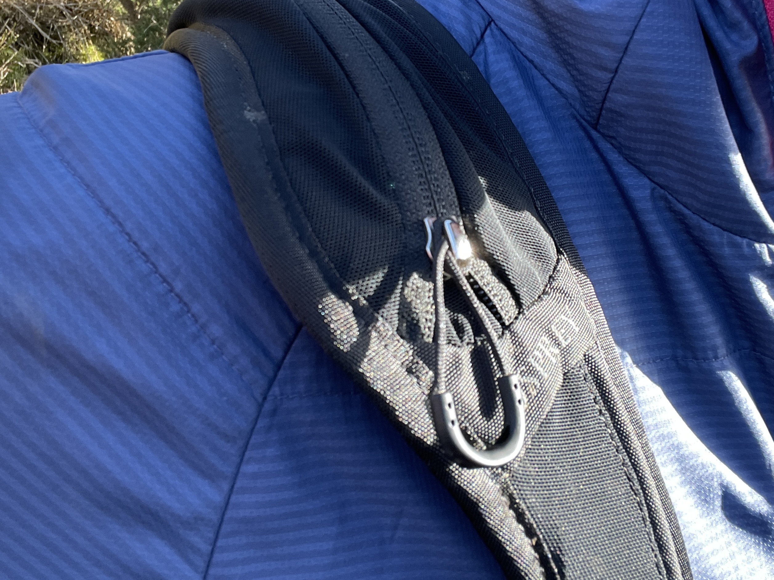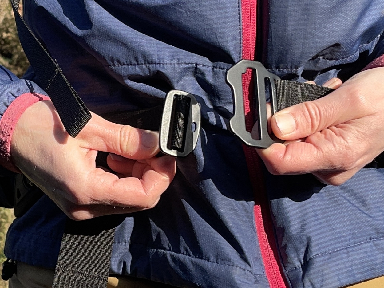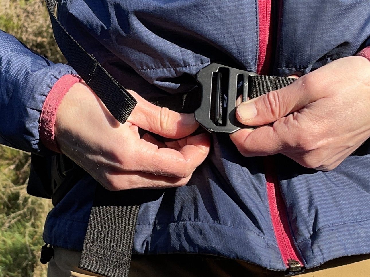 The metal waist strap fastener is fiddly and difficult to operate, especially in winter gloves. It does offer plenty of adjustment, since you can loosen or tighten the strap from either the left or right hip, however actually threading the metal clasps through one another requires close attention – you can’t do it by feel like you can a standard clip. Also, if you tighten it up so it’s really holding the bag firm, you need to loosen it to undo the clip and remove the pack. So, it holds everything down nicely, but it’s a bit like putting on a Duke of Edinburgh expedition pack – once it’s on, you don’t want to remember you still need to add your keys to the pack.