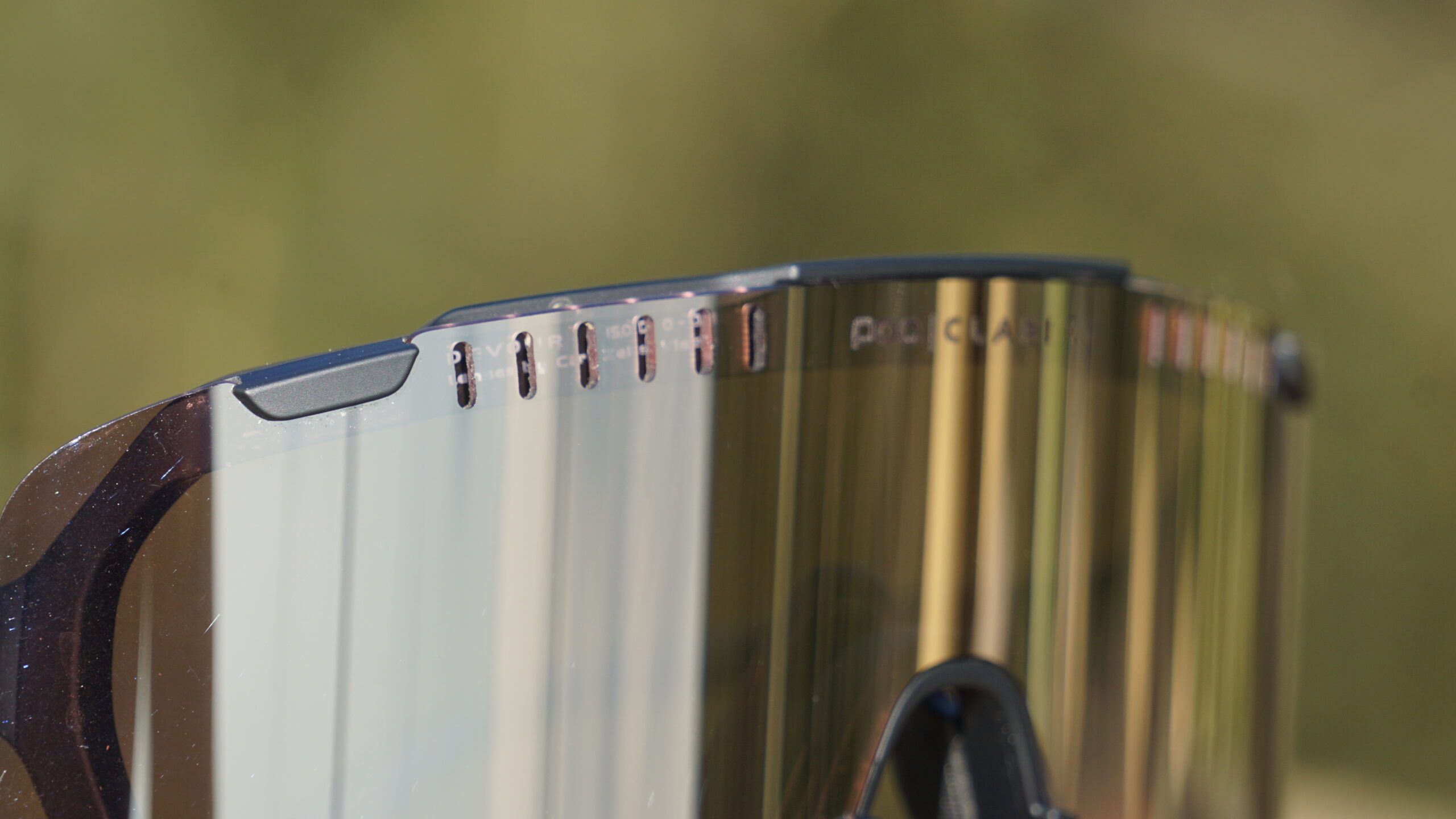 The lenses are heavily curved to increase the field of view yet are fairly ‘flat’ on the vertical axis. Across the top of the lens is a series of vents to keep the glasses from fogging up, and behind vents the frames sits away from the lens itself to aid airflow.Â