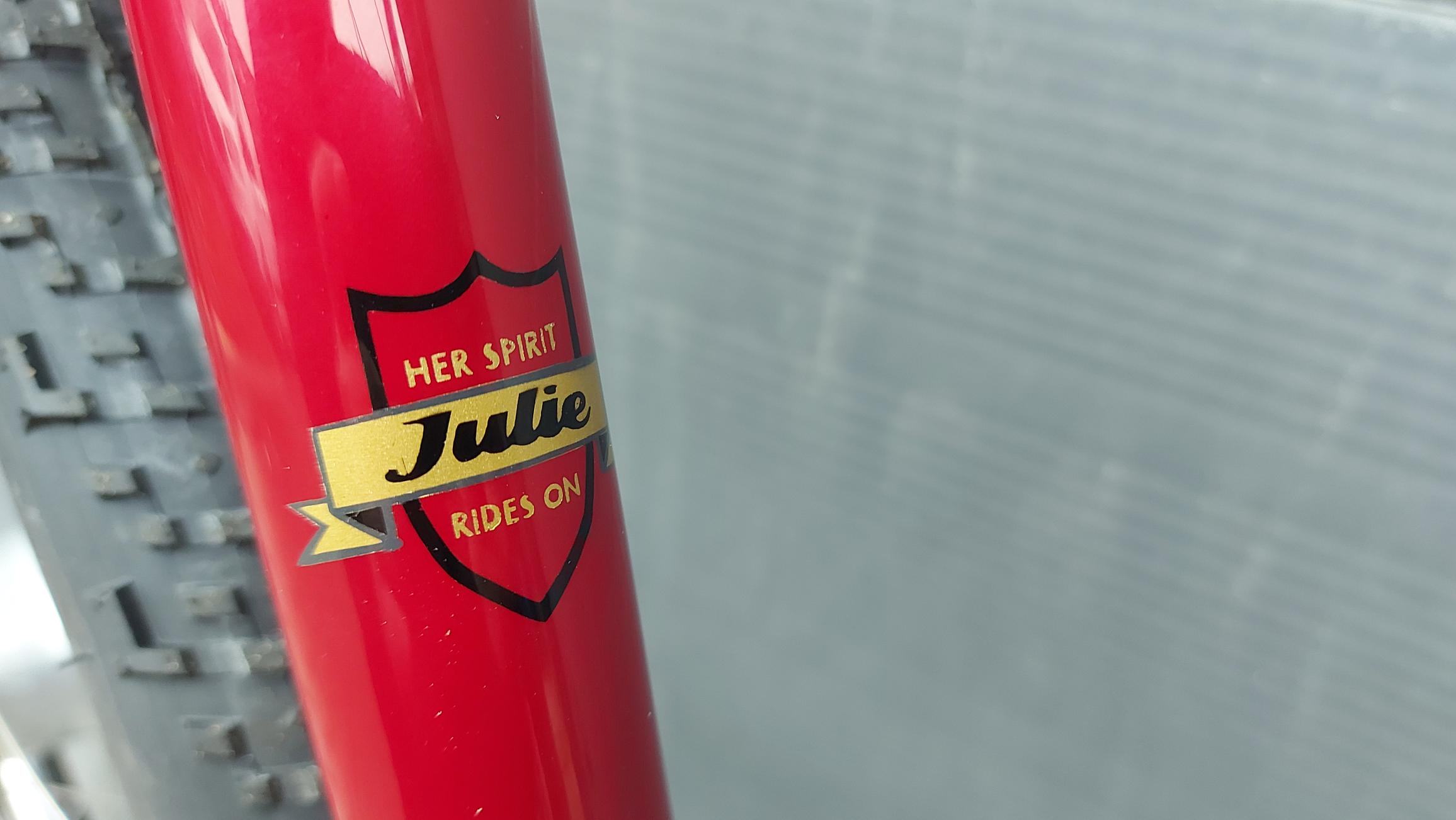 The final thing was I wanted a subtle dedication to my deceased partner, Julie. She was a woman of no nonsense and no fuss so nothing garish or mawkish or in your face. I decided I wanted something that at first glance looked like a wee sticker on the seat tube and after a lot of discussions and variations and driving the painter mad, decided upon a scroll and shield with the wording “Julie – her spirit rides on” using the fonts that Shand uses for the bikes.