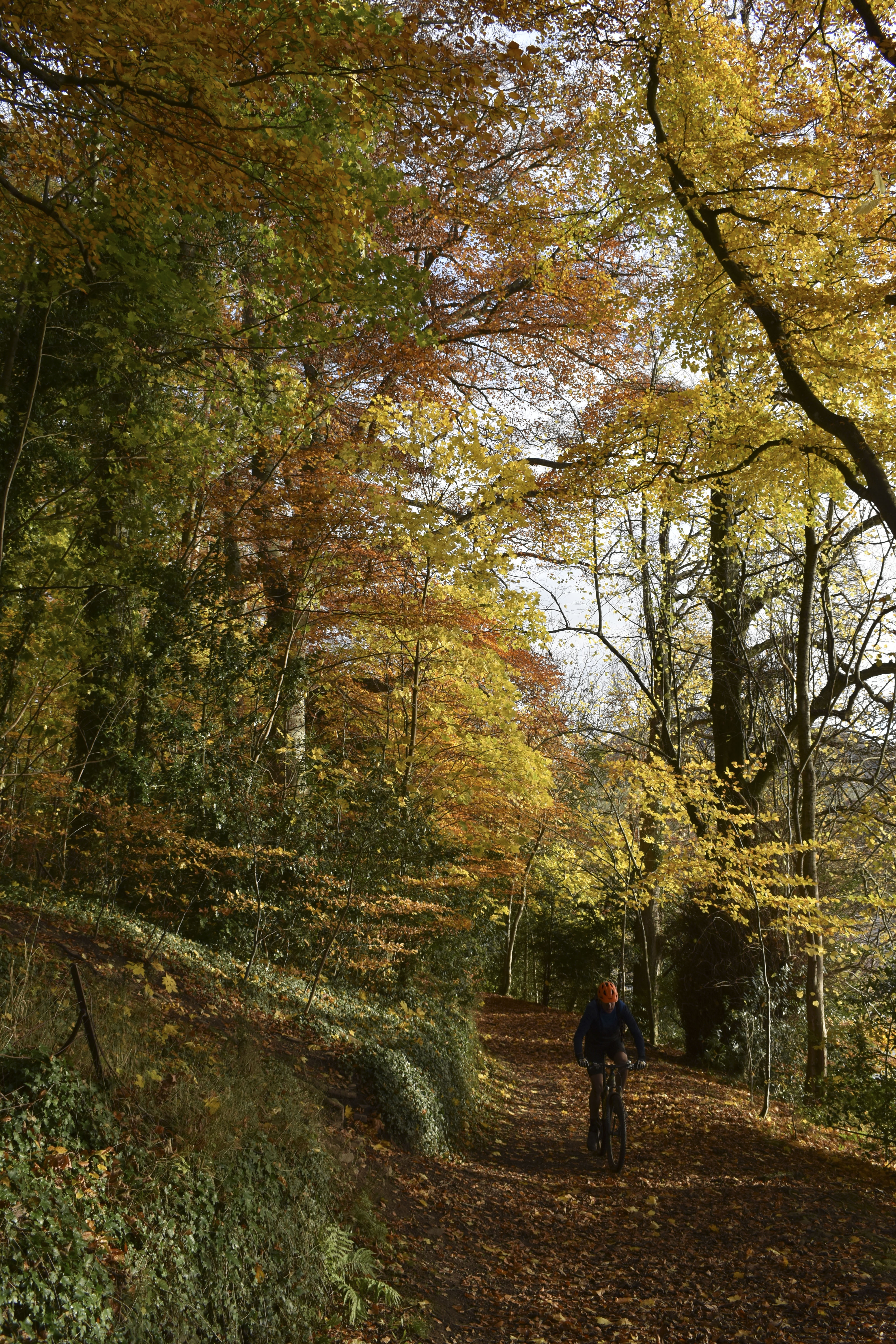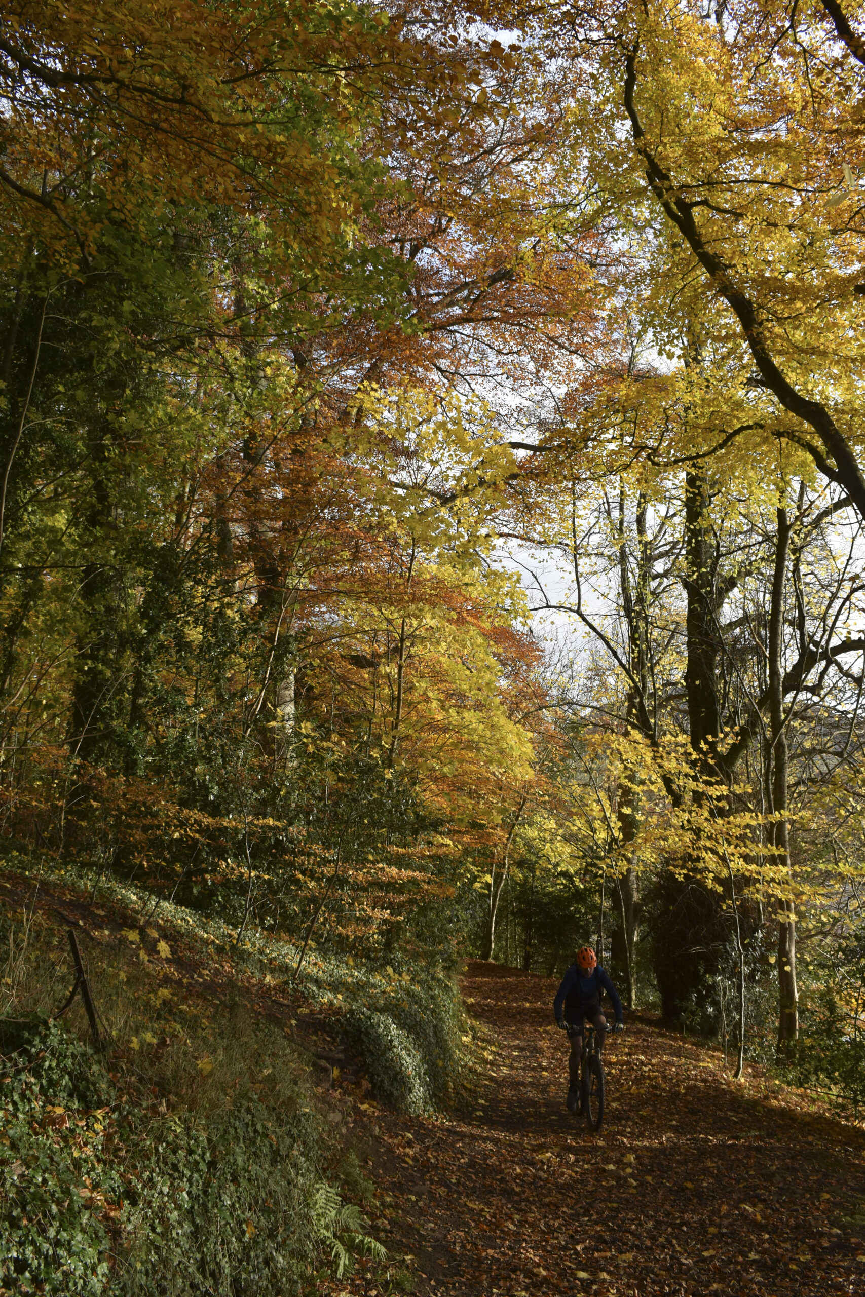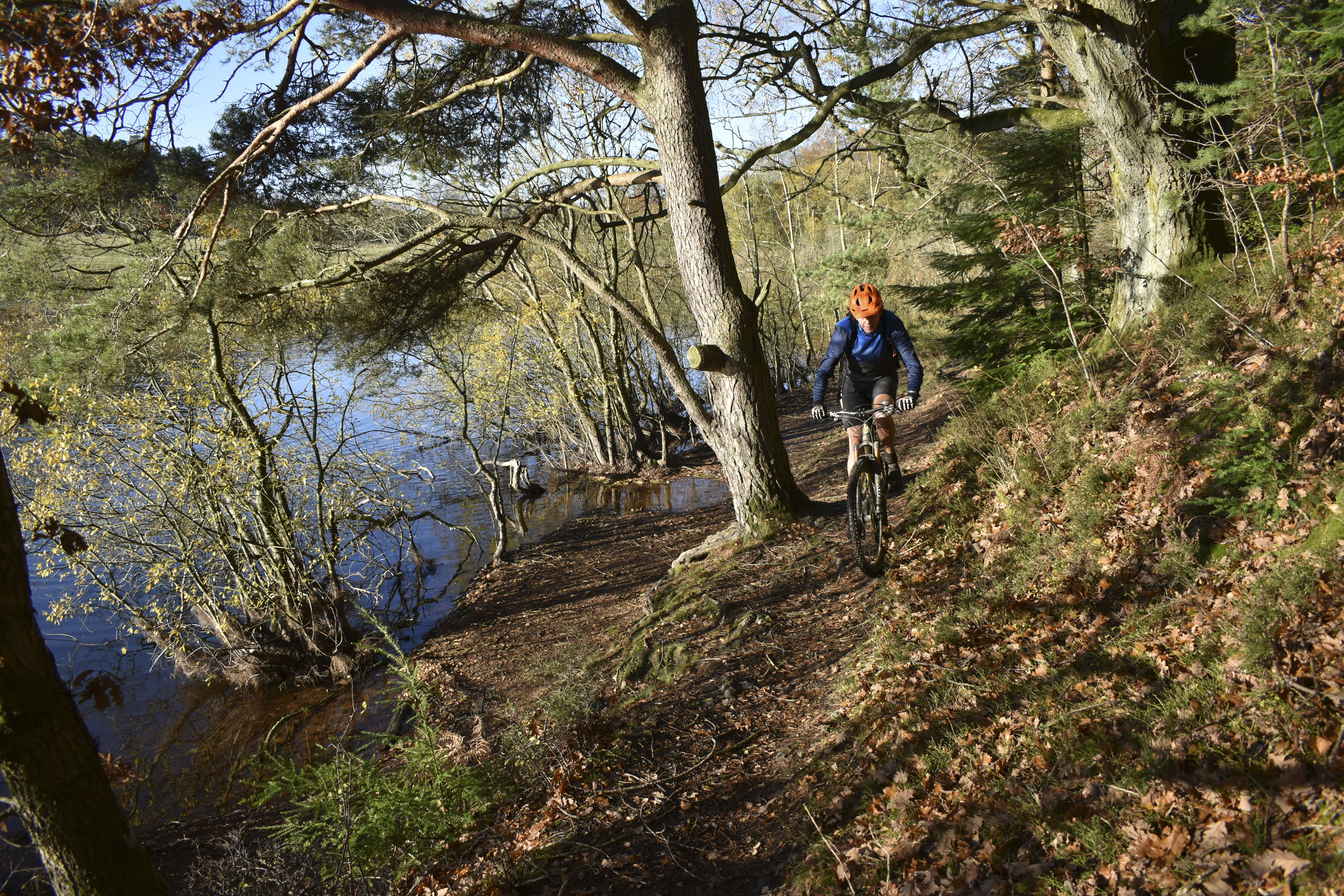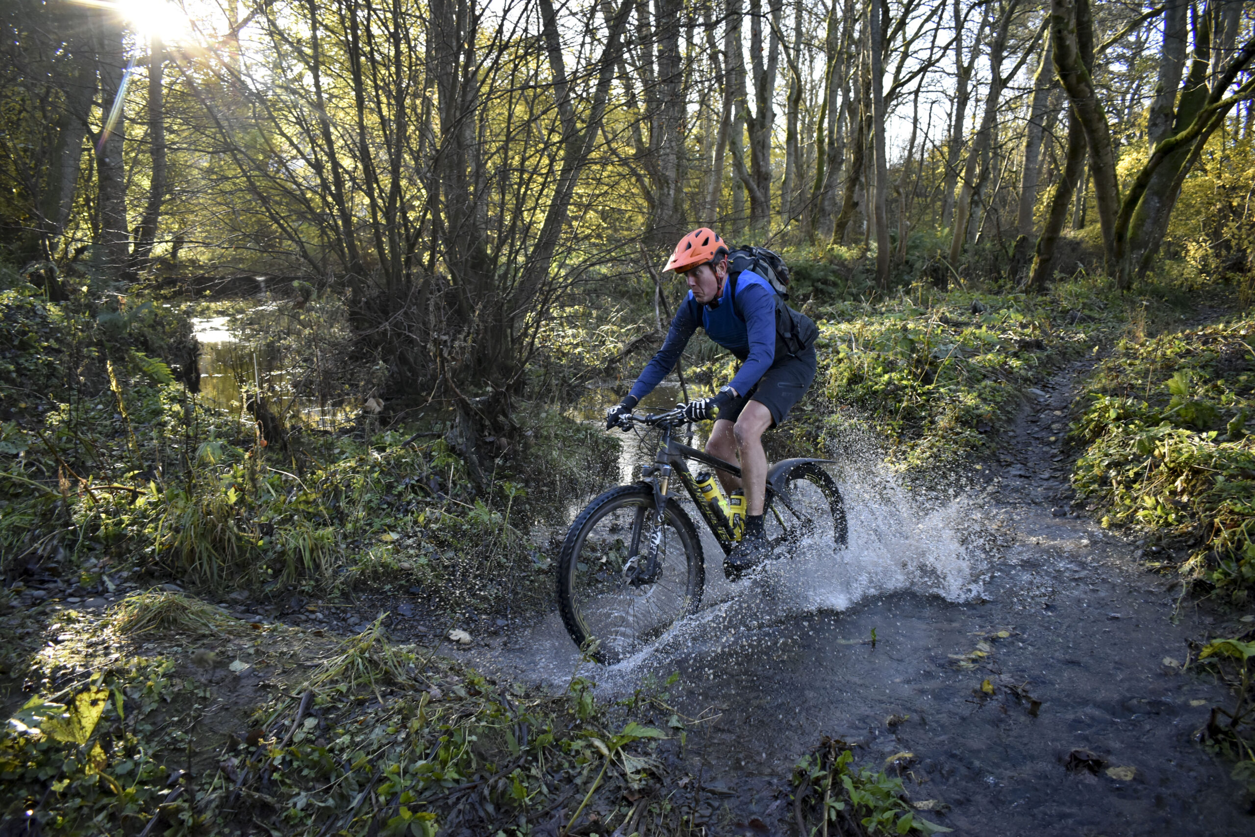 Weaving through the tree-lined trails, the low sun painting a beguiling picture of light and shade on a green and russet canvas, we both knew we were onto a winner. At the height of summer, these trails can be a case study in nettle/bare leg interfaces but jump forward to autumn and the only dangers lurking are the hidden roots and polished rocks from where the river has inevitably burst its banks. Feeling my front end slide on a concealed root that was slippier than Boris at PMQs, I shouted back a warning to Dave that coincided perfectly with him hitting it square on. Turning round to see Dave and his bike in a tangled heap in a hollow off the trail, I helpfully stated the bleedin’ obvious. “You found it then?” No harm done save for a skew-whiff bell, we pressed on. Despite recent rains, the trails were remarkably dry with the sandy soil making for a reasonably weatherproof surface. Crossing through a small stream and over a North Shore-style plank, I was heartened to discover that the trails had weathered many winter storms and were easily as good as I remembered them.