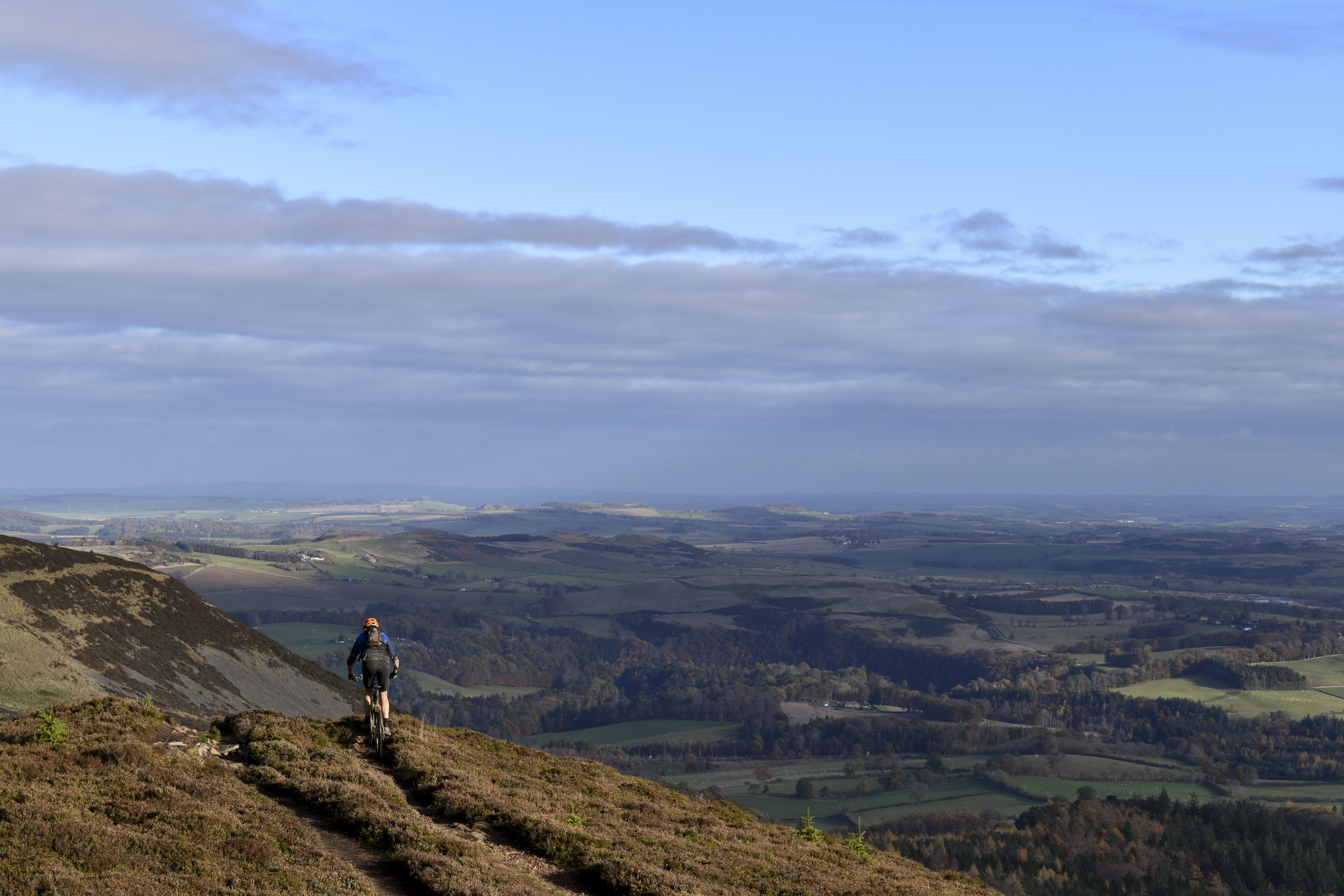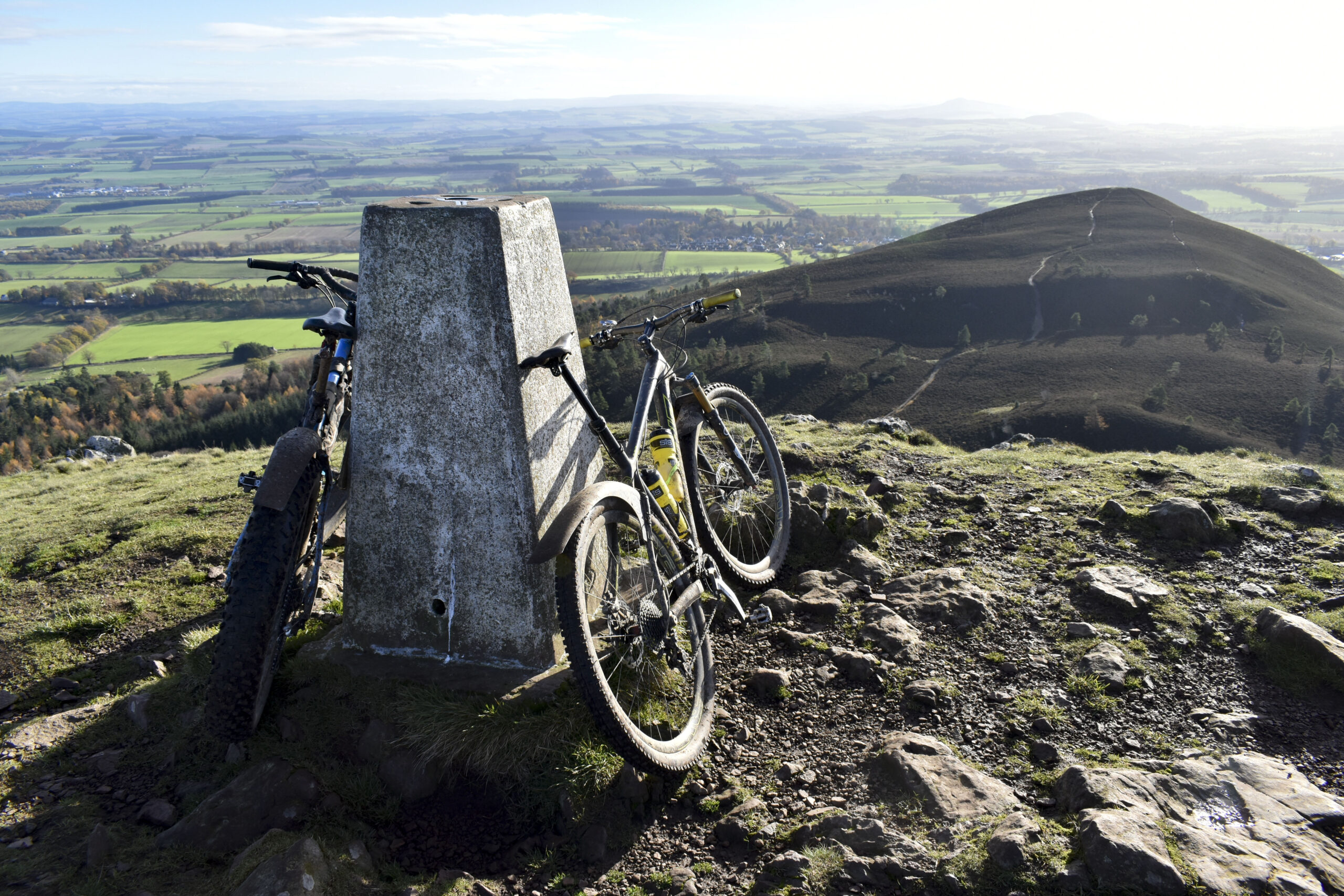 Skirting round a fishing loch at the road’s high point, we hit the open hillside and made our way up through a cleft between the southern and higher middle summit on a perfectly shorn grassy path. “This is like riding on a bowling green,” Dave exclaimed. It was hard not to agree although the steep slope would make for an interesting game of Crown Green as the Jack speeds off into the distance, never to be seen again. Never having ridden anything but the most northerly peak, we headed south. A gentle rise up saw us gain the summit quickly. Our reward was one of expansive views that practically begged us to plan future riding adventures. In the far distance, we could see the Cheviot while to the north east, Dave reckoned he could make out the distinctive shape of the hills above Glasgow, some 60 miles away as the crow flies or, indeed, any other bird for that matter. Except an ostrich. To be blunt, we had cracked it. Within only a couple of hours of leaving Selkirk, we were atop an iconic hill soaking in the beautiful surroundings. So far, so good.