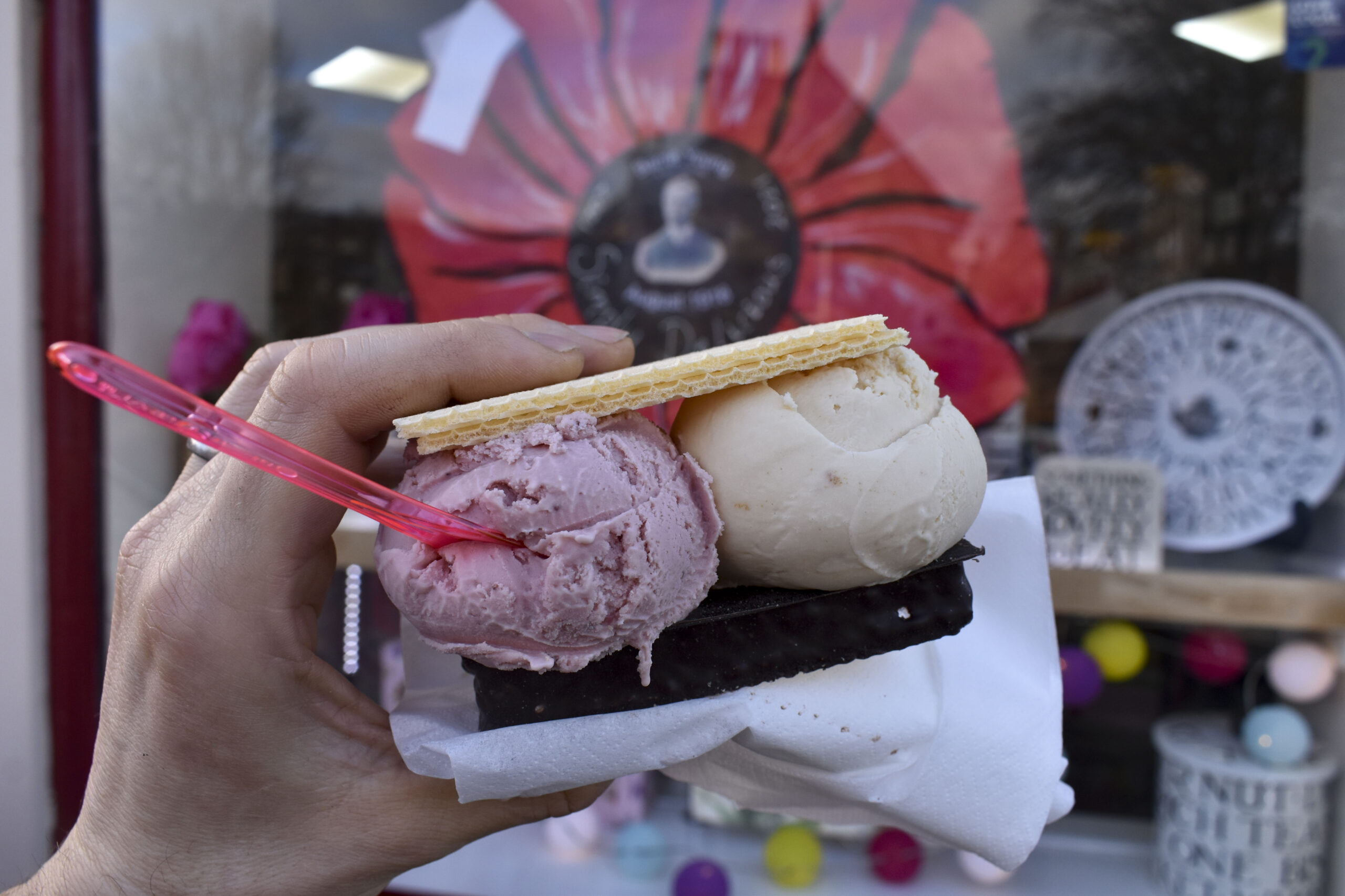 Like Selkirk, Melrose is a prosperous and thriving small town and, as luck would have it, is home to Hardies Bikes. Although they were just closing up and about to head out for a ride, the guys in there were happy to help Dave reinstall his granny ring. As they did so, we chatted about the thriving local riding scene and how it compares to further up the valley. Fair to say they weren’t backward about singing its praises and on this showing, it was hard to disagree. Ring issue resolved, we managed to ride all of ten yards before having to stop at the confidently named ‘Simply Delicious’ ice cream parlour. Now I don’t know about you, but when I see such names my instantly lowered expectations are rarely met. Why not just call them ‘Pret-a-bit-mangey’ or ‘Not so bright a star-bucks?’ Thankfully, this case was the exception. A single nugget of strawberry and biscoff ice cream hit the spot while Dave followed it up by proffering a curiously named, but utterly delicious Jammy Joey. Sporting the kind of food colouring that is probably banned in several European states and which would give Jay Rayner conniptions, it made for the perfect mid-ride comestible.
