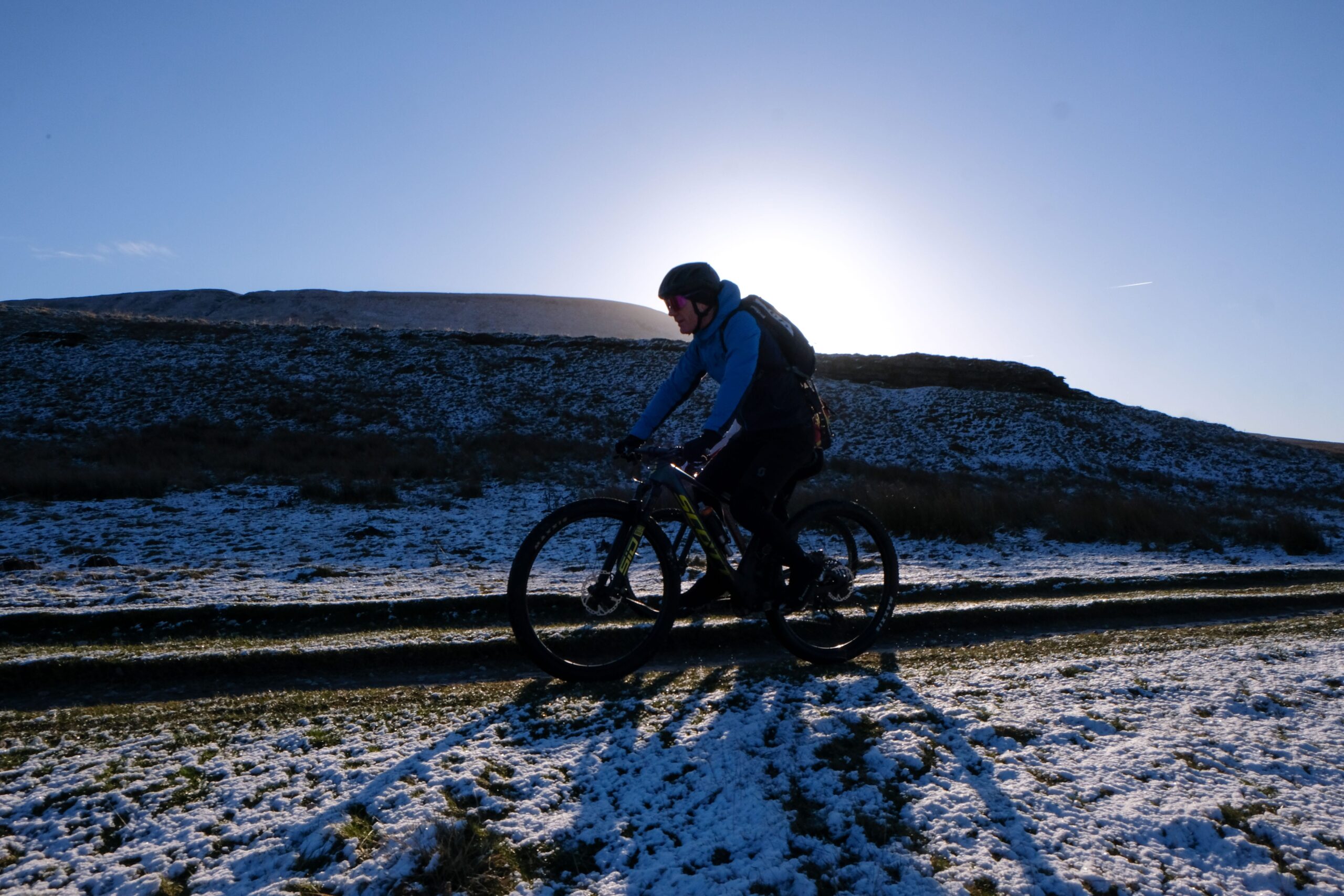 With the main mass of Pen-y-Ghent behind us, we still had to head back over the ‘tail’ of the hill, but first it was time for some snacks. Once again, I realised I was in the company of ‘proper’ cyclists, as there was none of that energy gel business here; it was sandwiches and pies, proper-style, before starting our traverse of the back of the hill over towards Foxup Moor. Starting with a very off-and-on the bike climb, even for Nick, thanks to contours and icy conditions, we were soon enough on a more level trail that contours round the back of the hill. As we rounded the corner, another of the legends of the Three Peaks came into view, dead ahead: Ingleborough, and specifically the climb of Simon Fell. Nothing strikes fear into newcomers to the race more than this seemingly vertical slab of tufty grass. There is no trail and the race just shoots a straight line up, slicing through the tightest of contours. It’s a strain on legs, tight calf muscles and hands as you grip onto the tussocks to stay upright.