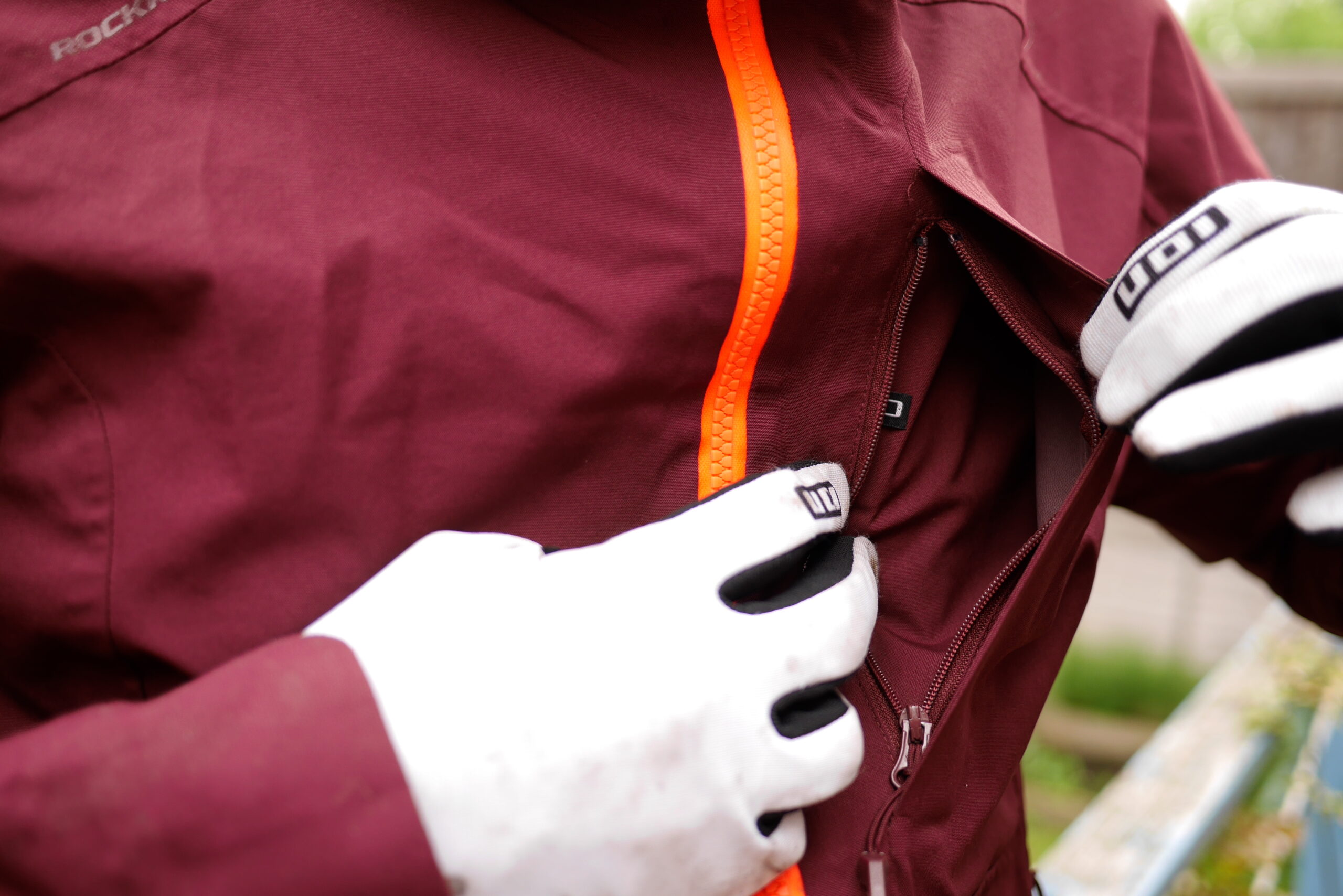 The hood on the Rockrider ST 700 Rain Jacket has a most excellent trick up its… er, sleeve. It pulls over the front lip of your helmet peak; it’s held in place by an integrated flap of fabric. What a great feature. It really does help keep the hood in place when riding in blustery winds.