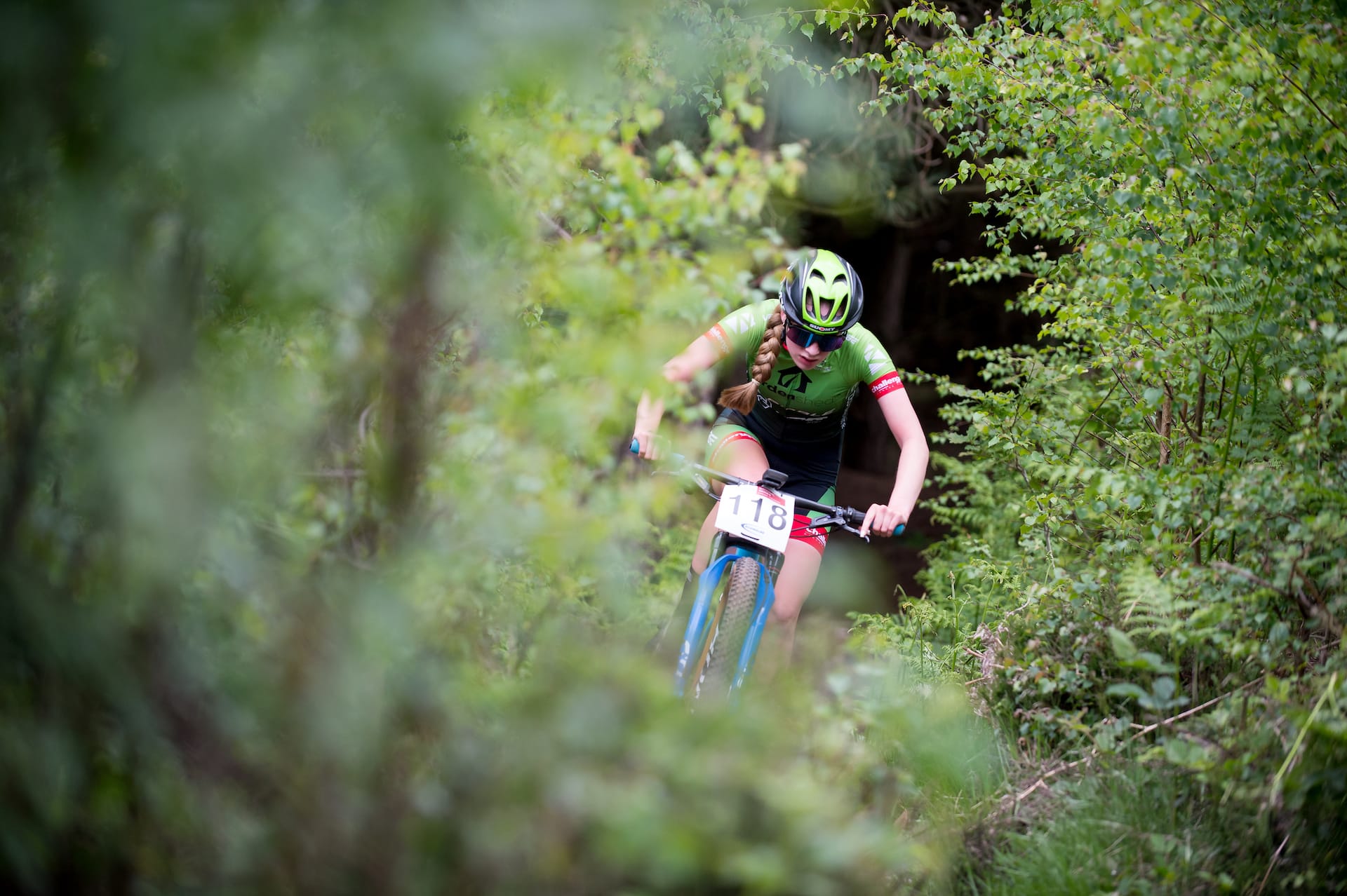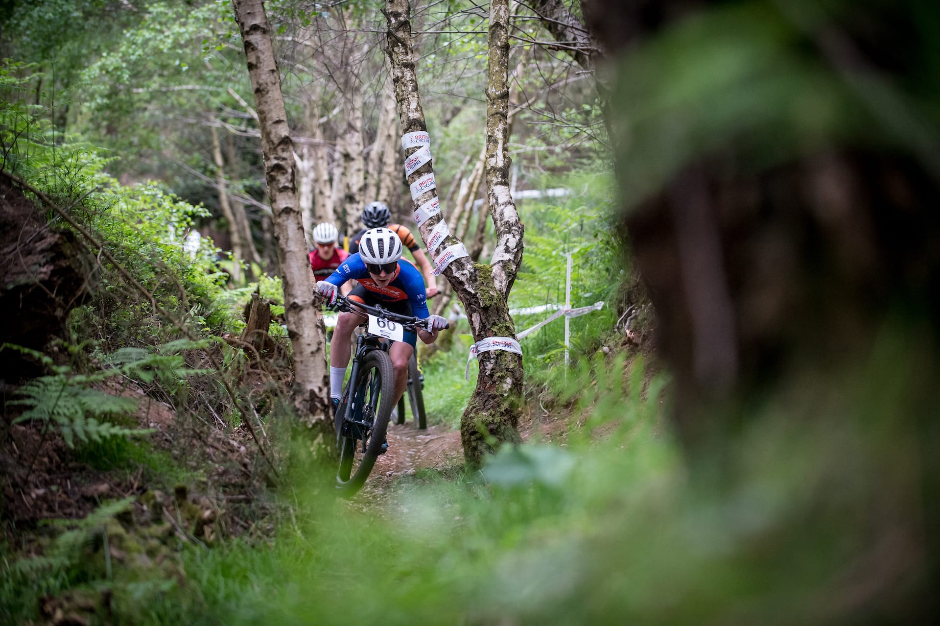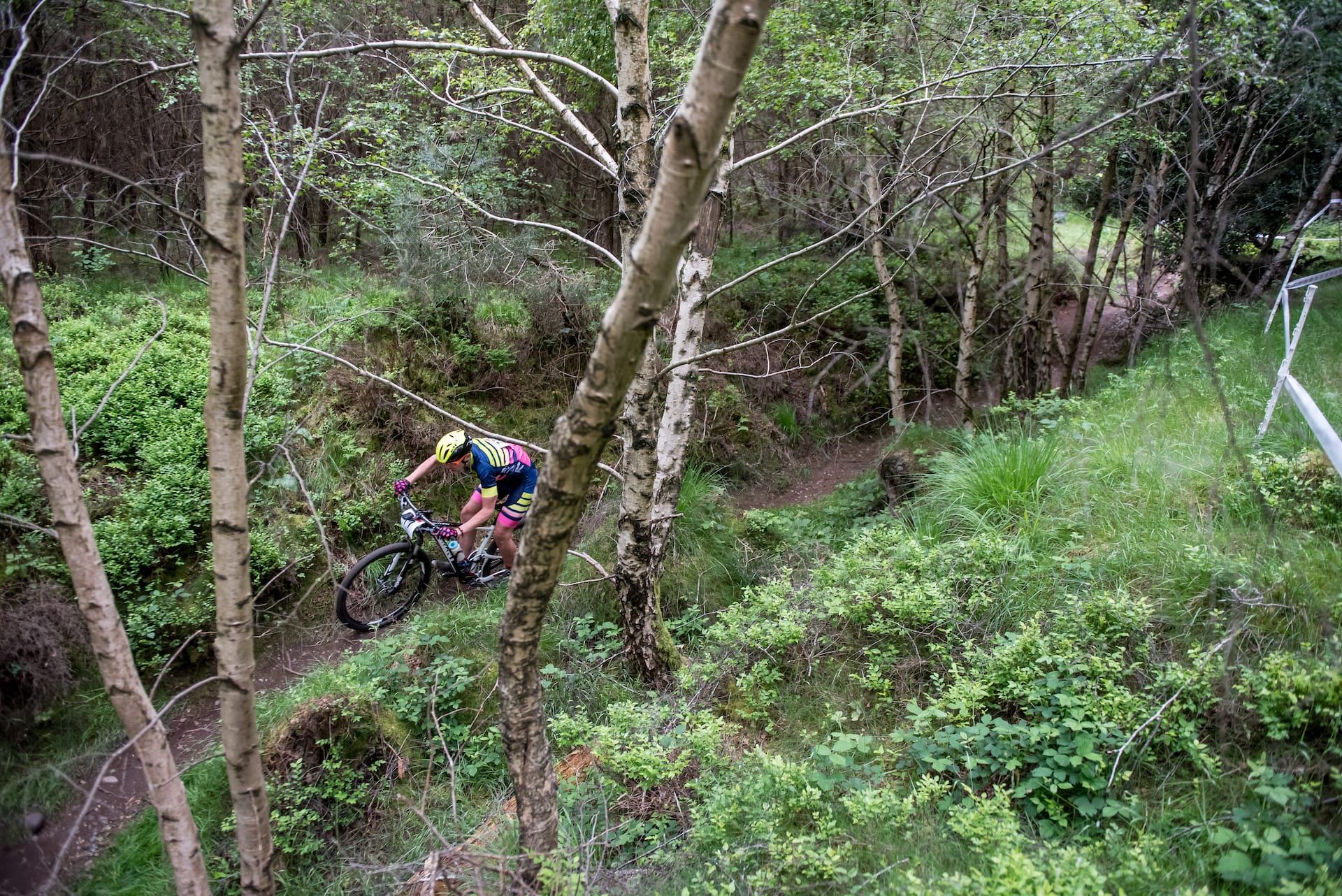 There wasn’t a descent in yesterday’s course as steep as the one in the old image here – another reason to think it was a different part of the forest. Don’t think the riders minded though, as the downhill bits looked as swoopy and fun as could be had on a mountain bike. A couple of drop-offs and a sweet twisty gulley kept the riders honest.