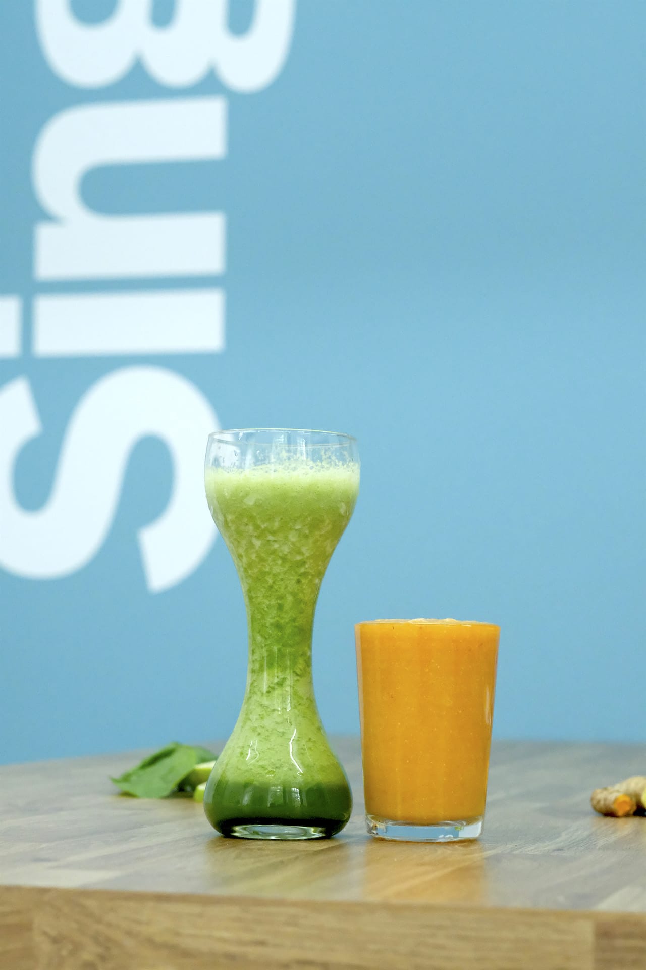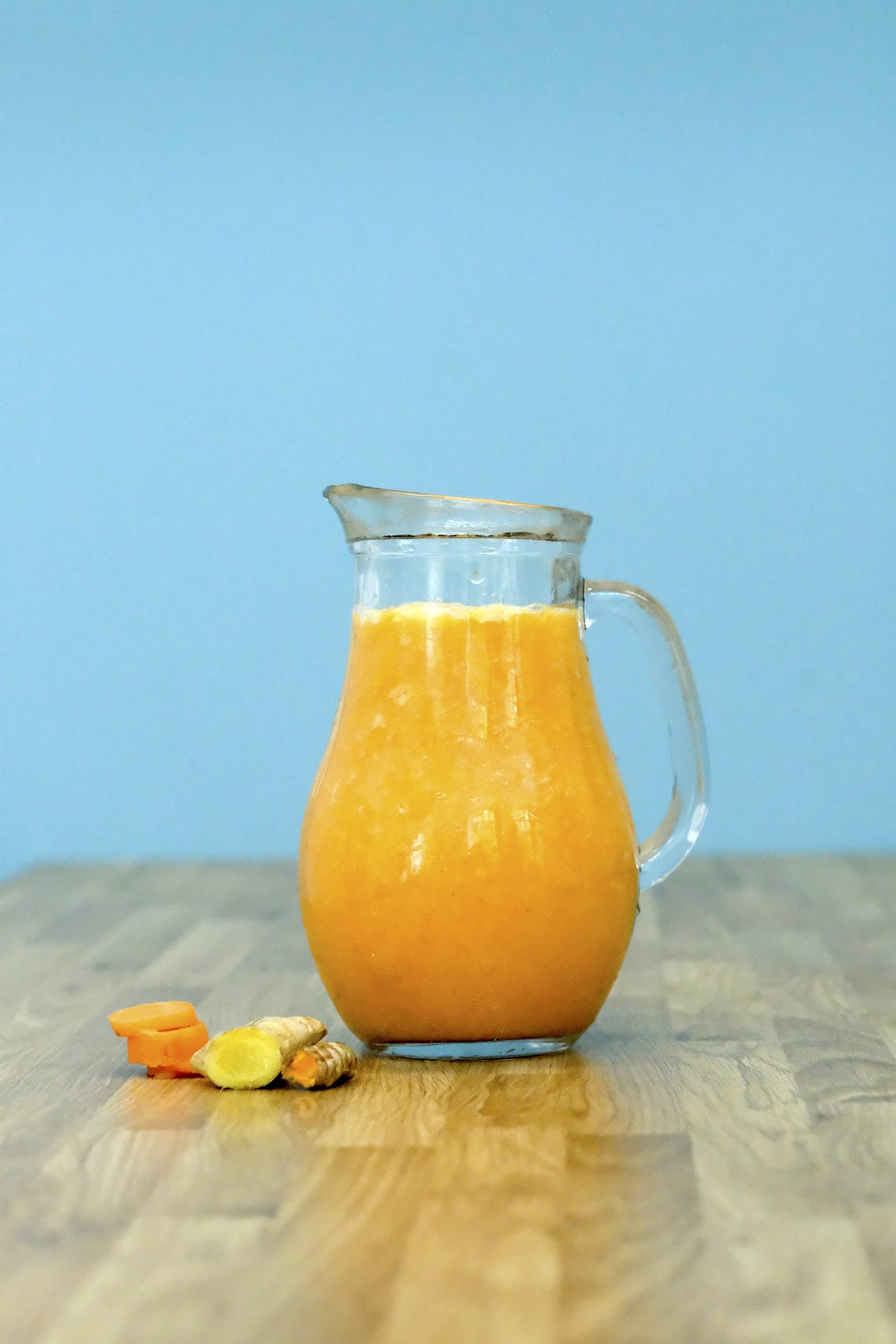 Refreshing, looks like thick orange juice, but with a feisty hot cayenne and ginger kick. Turmeric and ginger are both anti-inflammatory and antioxidant and can improve heart health, your digestive system and help with colds and flu.
