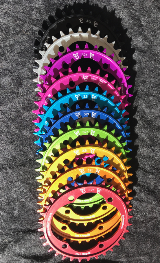 Moving forward, We get to the chainrings, and a myriad of different options. Cinch & SRAM 3 bolt direct mount rings, 110BCD, 104BCD, 96CD, 64BCD, narrow wide, odd numbered tooth counts in All. The. Colours, as shown here.