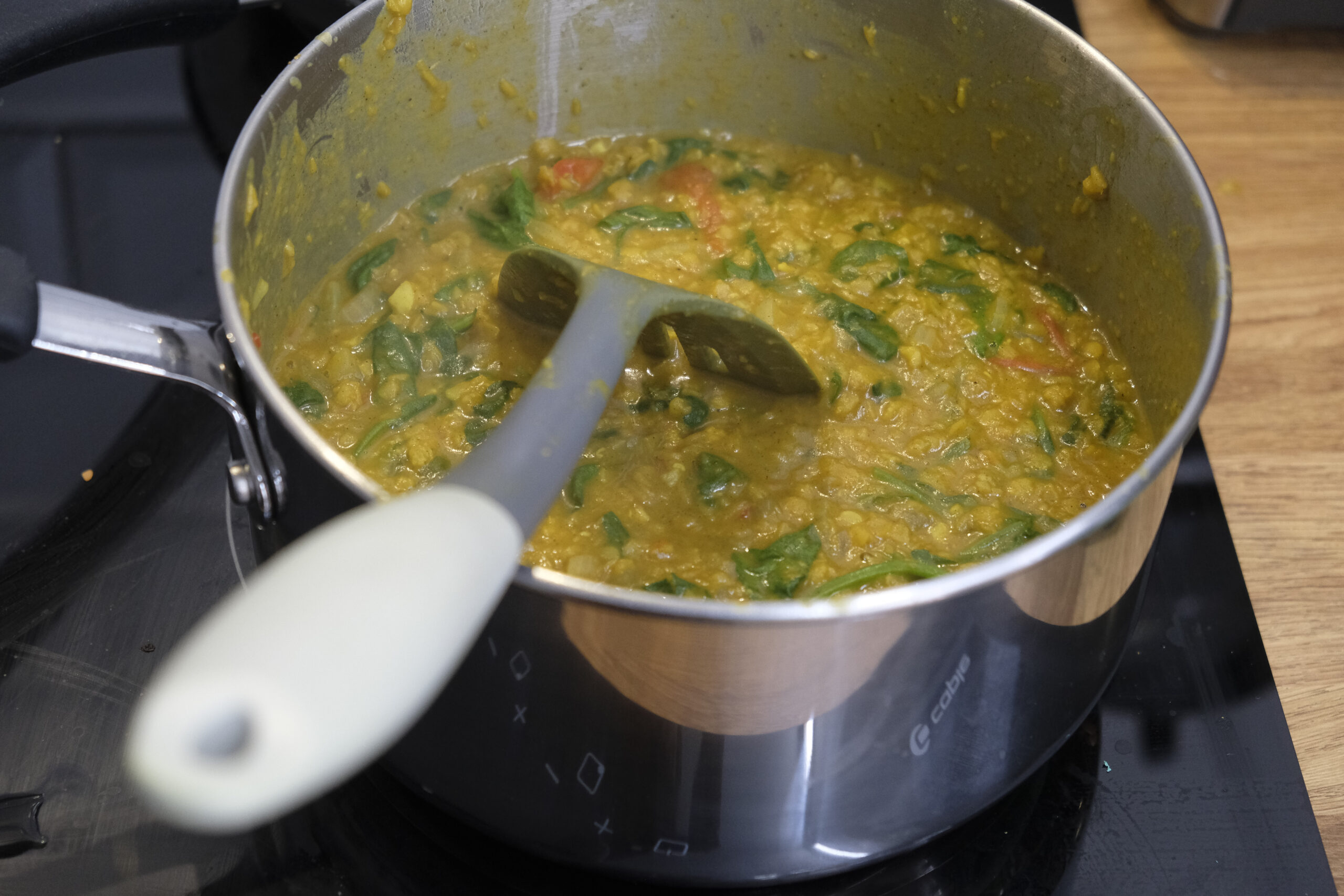 - Great, now half a can of coconut milk and the spinach goes in for the last 5 minutes