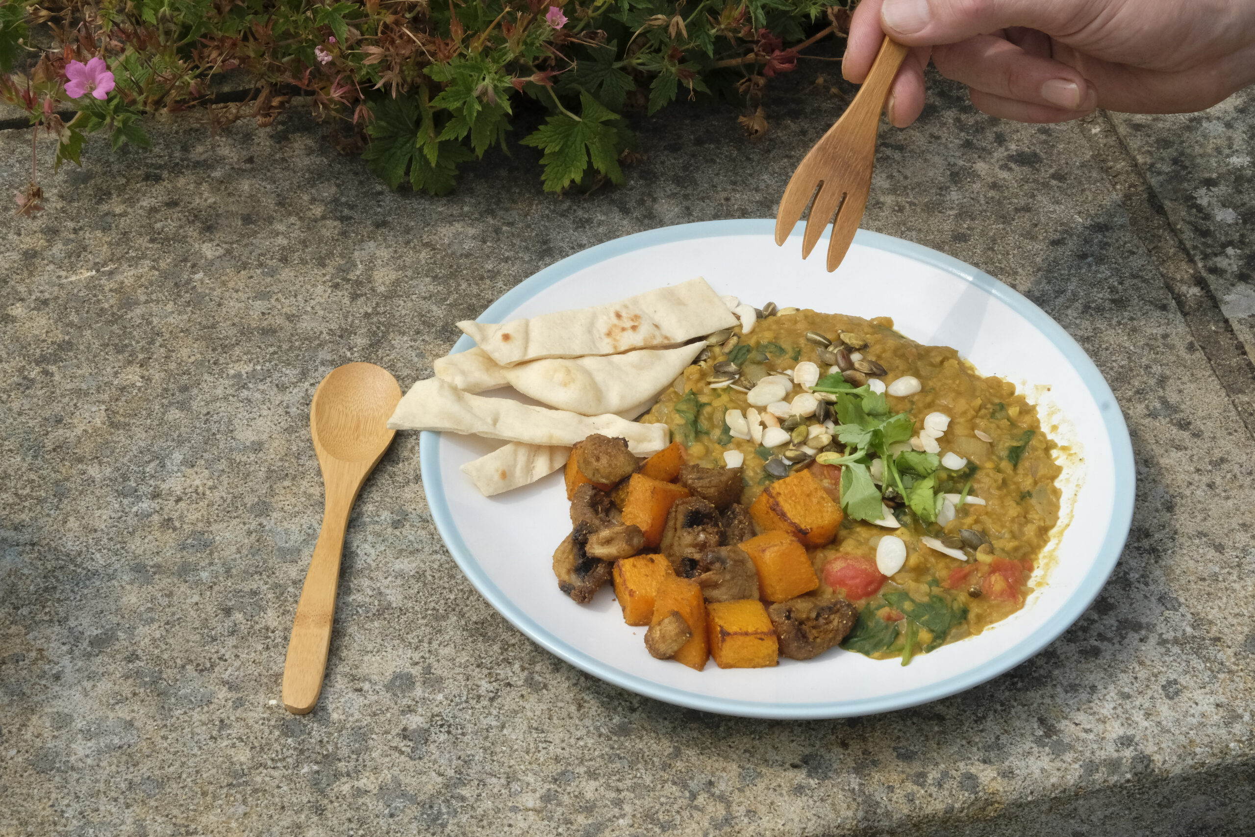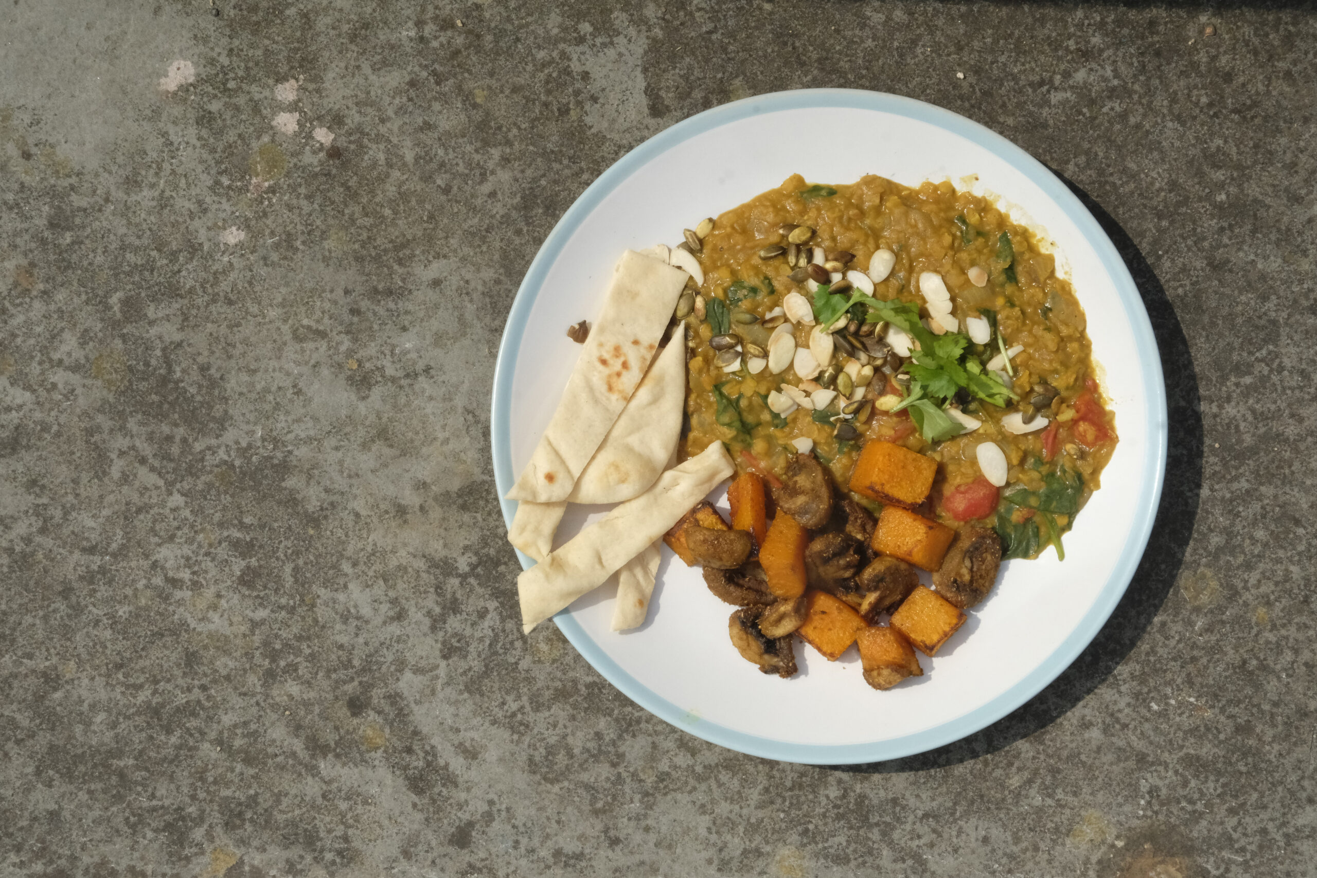 Serve with the dahl on the bottom, then the veg and then sprinkle fresh coriander leaves over the top with the seeds and almonds. You will want a naan bread for scooping this up and cleaning the plate.