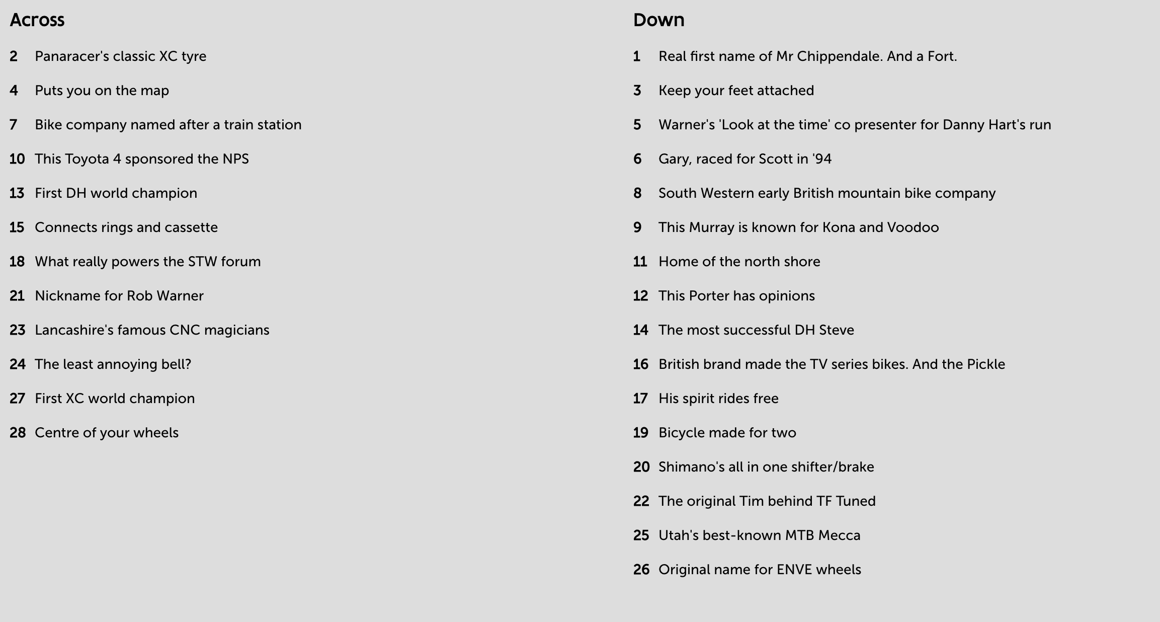 Don’t forget there are prizes for two of you who manage to complete our crossword and if it’s all too tricky there are some just for fun puzzles further down the page. Oh, and the solution to Singletrack Crossword #3 is down there along with all the names of those that successfully completed it.