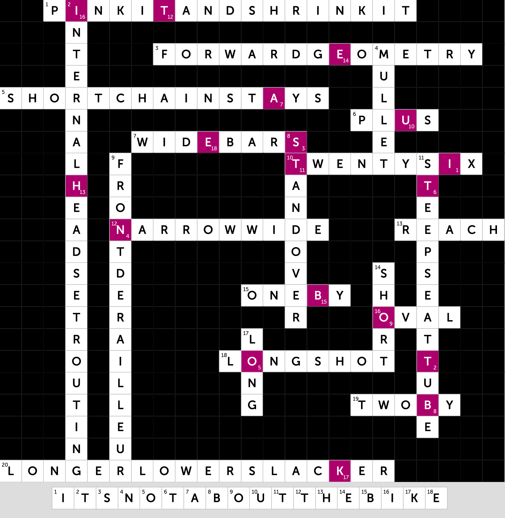 This week’s crossword theme is UK bike stuff. The sunlit uplands, if you will. If you get stuck, go for a ride and behold the green and pleasant land, pick up some rubbish on your way home, and then perhaps inspiration of the Ol’ Blighty style will strike.