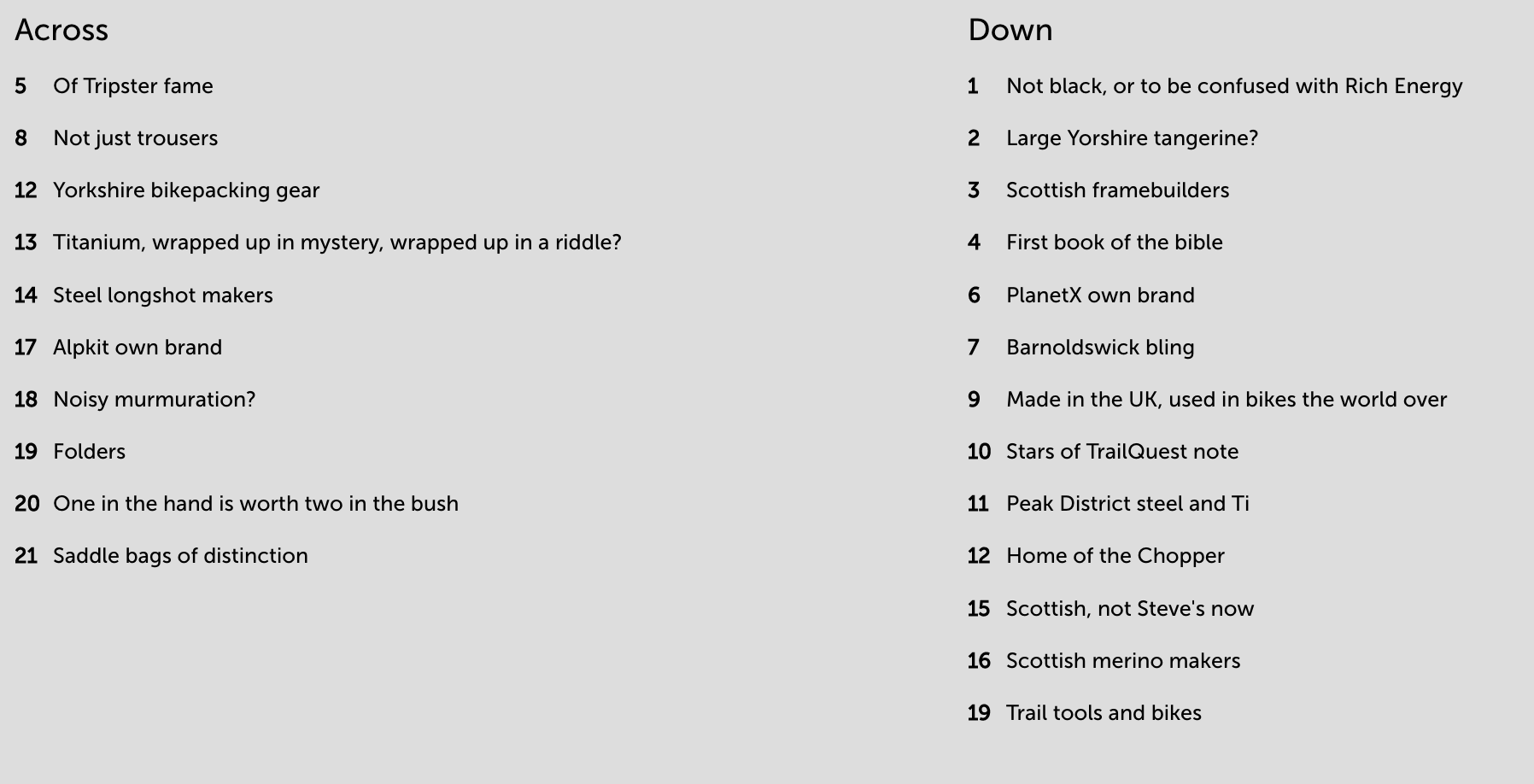 Fancy getting out and about? Got itchy feet and want to head over the horizon to a new location? This week’s crossword theme is UK riding locations, with a bike park bias. Maybe it’ll have you looking at the map and planning a trip to some new to you trails.