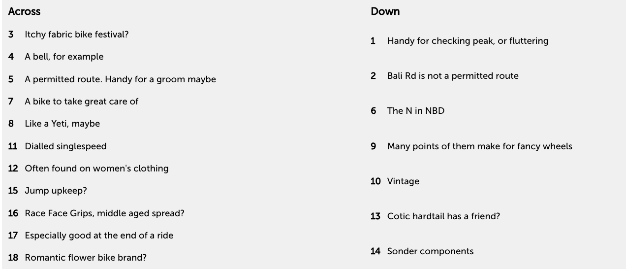 Oops! There\’s something to see here that only our full members get to see. Join us today for instant access to this content and more.Solution to Singletrack Crossword #14