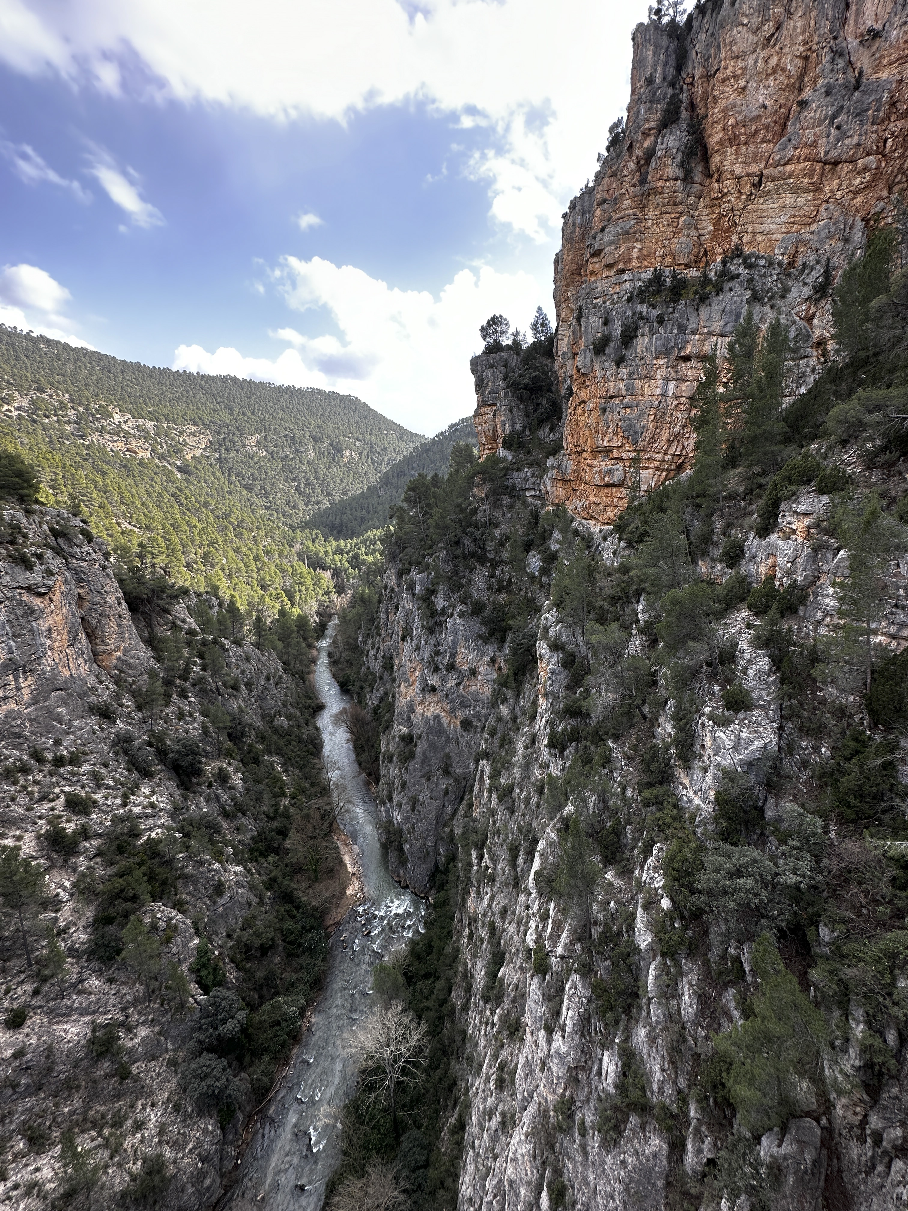 We’ve been climbing for a while. The road is gravelly and falling down the hillside in places, and it’s one of the most jungle-esque areas we’ve been so far. Huge trees overhanging, creating cooling pockets of shade, and gorse bushes sprouting up through cracks in the road. It’s wild, and it’s suspiciously quiet. Come to think of it, we haven’t seen a single car, hiker, cyclist or caterpillar on this road. This wouldn’t be such a surprise if it weren’t for the sheer beauty of the place. There’s a viaduct up ahead and we’re currently at 800m altitude, so it must be close to 1,000m above sea level with the most mind boggling drop to the turquoise river below.