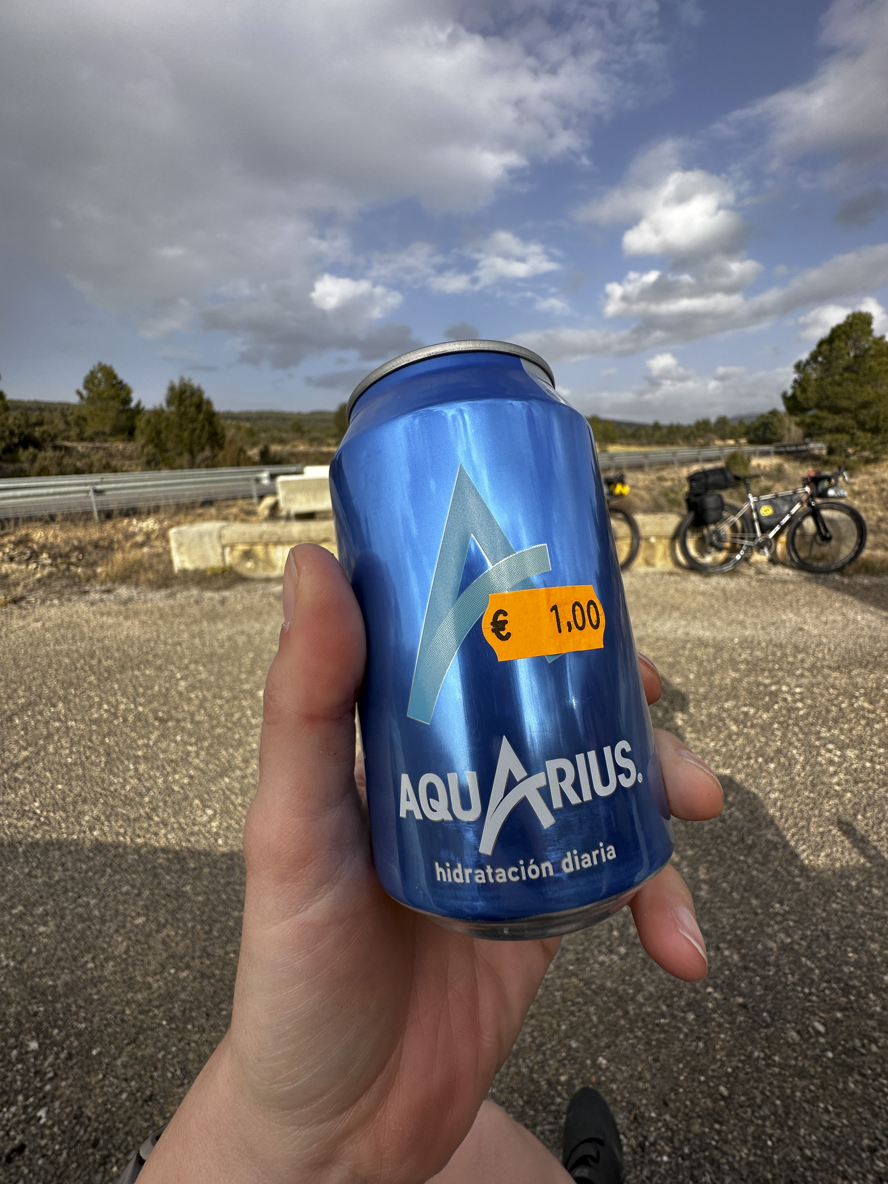 I’ve been aimlessly noodling through the tiled streets of Camarena de la Sierra looking for a shop for what feels like an hour thanks to the heat, my exhaustion, and the absence of Rhys to tell me I’m wasting time. I’ve ridden past a bloke with a souped-up Ford Ranger one too many times, and he’s taken my navigational errors as a keen interest in his obnoxious truck, so he’s now revving the engine and giving me a smarmy look. I decide to scoot down a narrow street to swiftly get away from him, and lo and behold, there’s a shop at the end of it. What looks, from the outside, to be a disappointing newspaper and tobacco shop is more like a tuckshop. Racks of pick ‘n’ mix, fridges full of sugary drinks, and Double Stuffed Oreos! I take my picnic to a bench in a quiet courtyard in the centre of town and wait for Rhys.