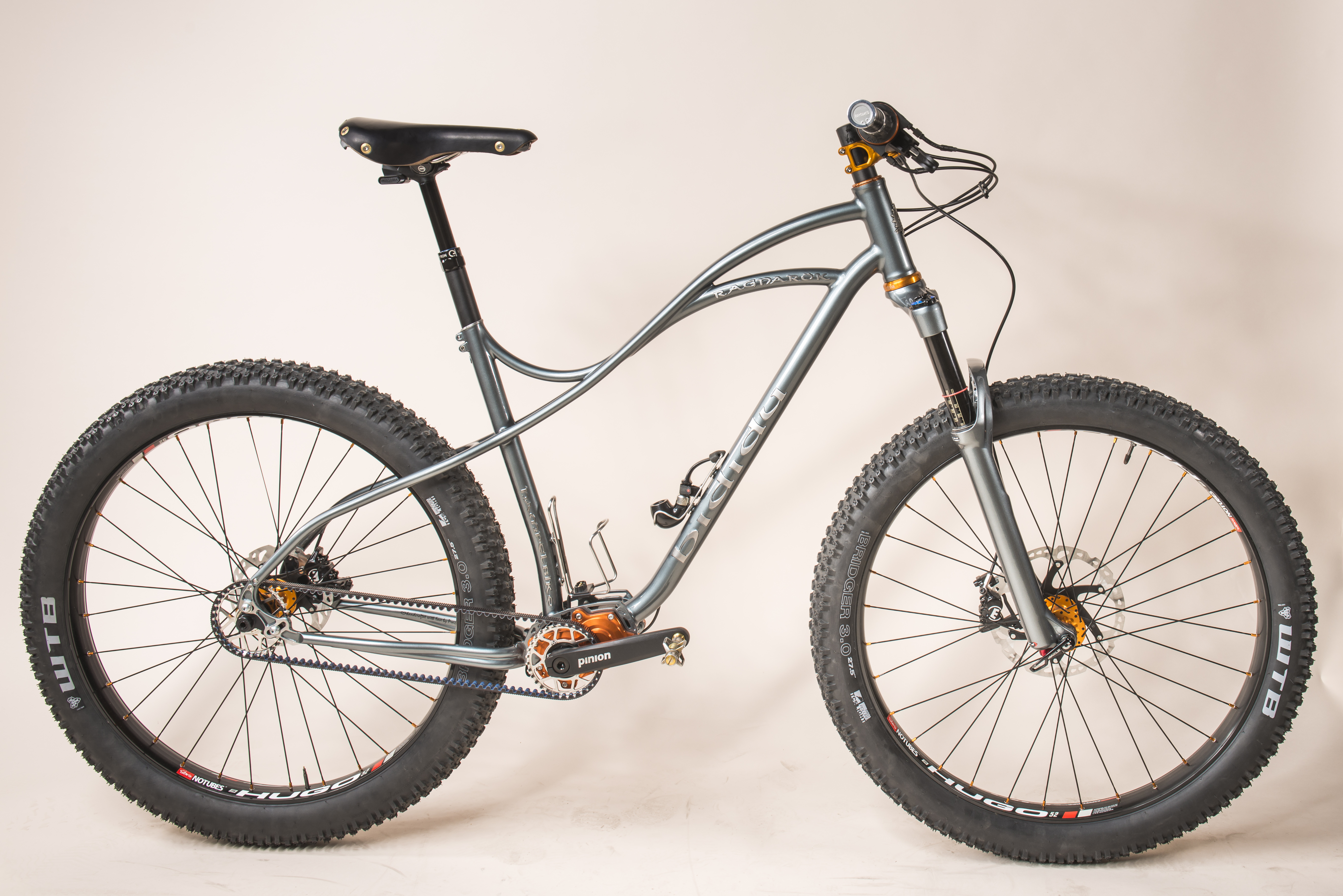 All tube-bends flow into one another. The top tube consists of 4 different dia-tubes. The seat stays are 3-dimensionally shaped. The Pinion bracket is self-designed and laser-cut from Hardox steel. A sensor for using an additional electric drive “add-e” is integrated into the chainstay and it also has a pipe holder 😉