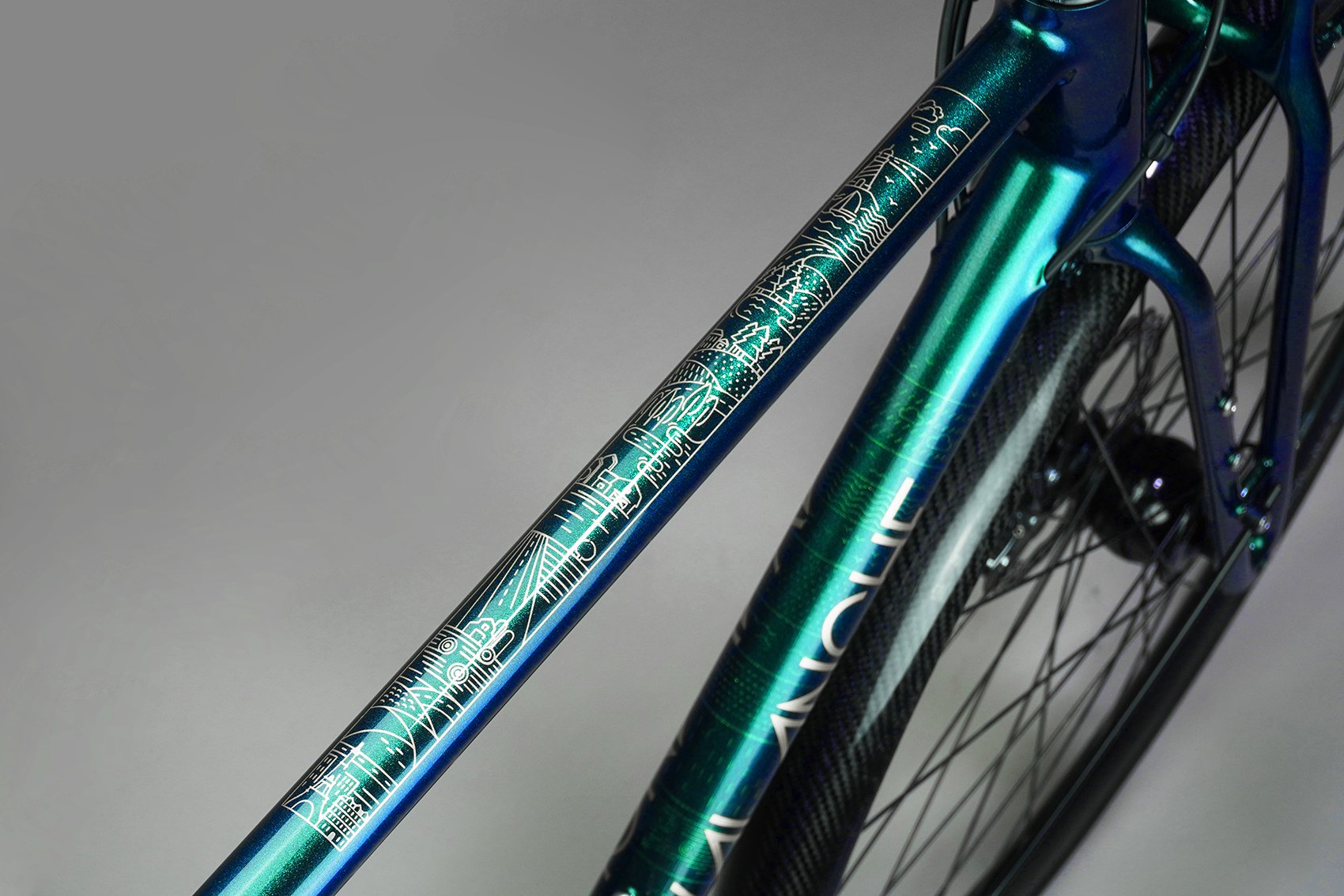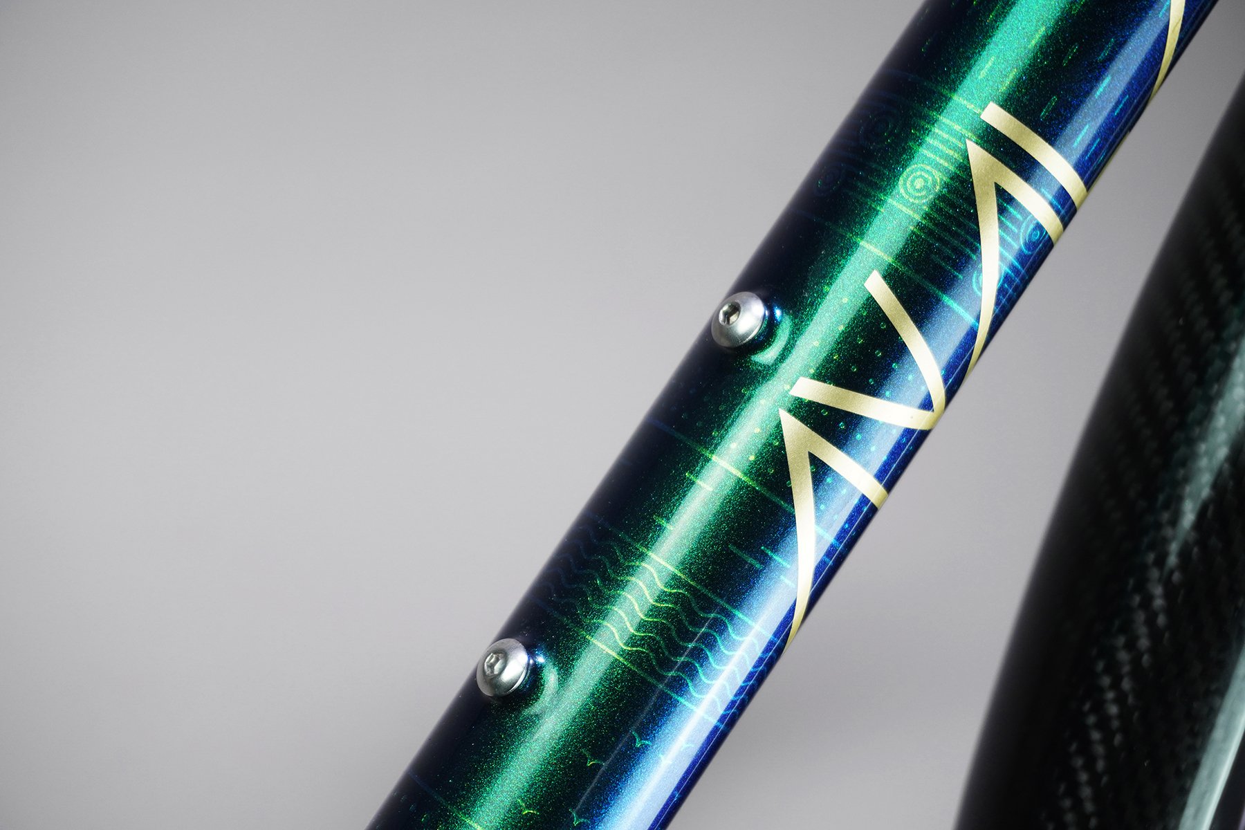 We suggested that he work around a main graphic, clearly visible, on the frame, but not covering the entire bike. A landscape graphic was imagined, drawn and applied to the top of the top tube, in a nod to the Paris-Brest route. The idea is then to illustrate the journey, the crossing of different landscapes, while making a subtle nod to the departure and arrival at the sea. Finally, the formal language of drawn landscape has been taken up to create a series of patterns, covering a large part of the frame, but in a subtle way, in tone on tone.
