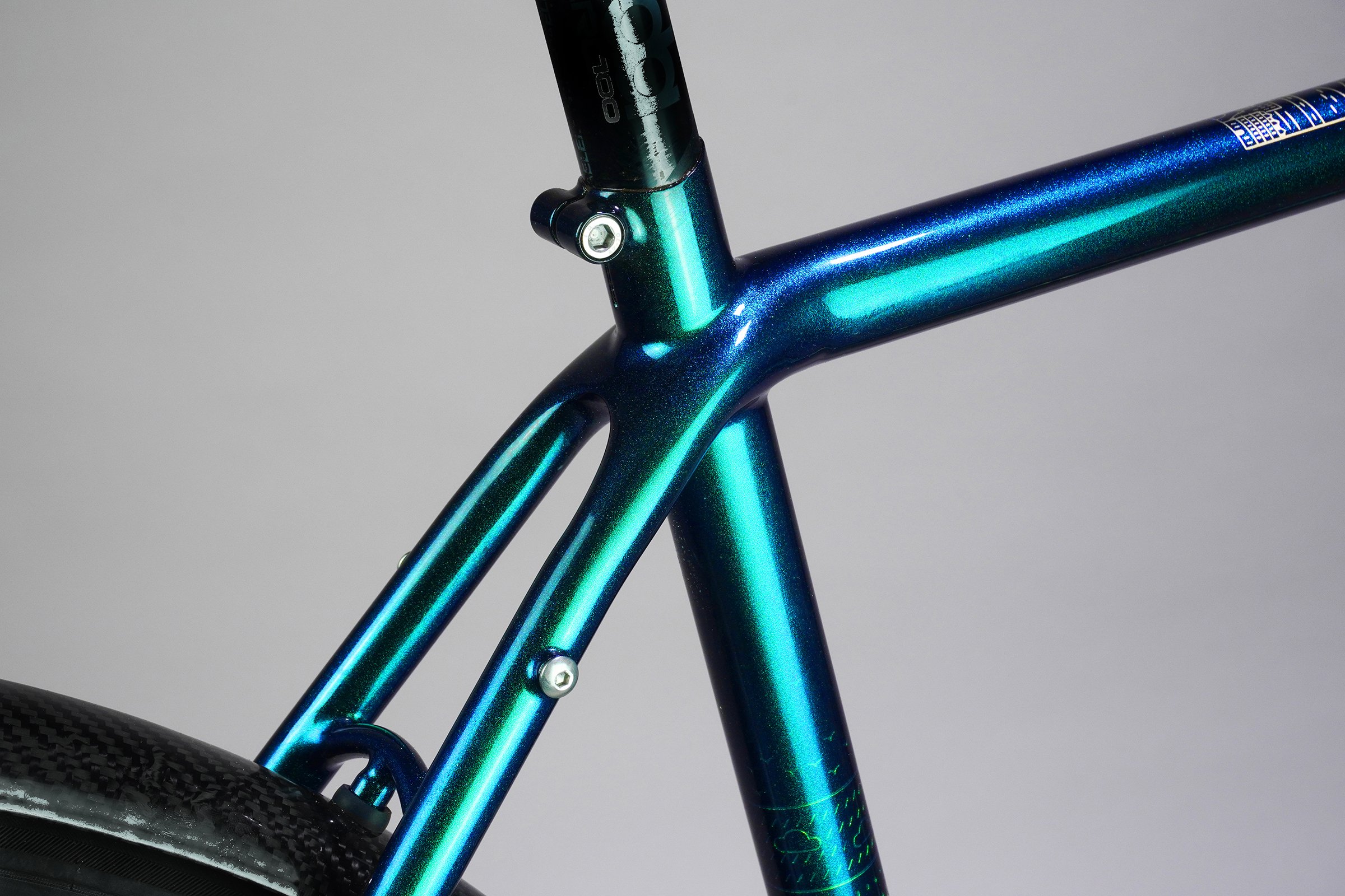 This bike is made from brazed Columbus Spirit steel tubes, and stainless steel 3D printed assembly by TIG welding / Liquid painting. It was designed for the 2023 Concours des Machines, which was held during the Paris-Brest-Paris race. ‘The competition specifications this year required that the bike could be adapted to PBP, but not only that. We therefore designed a versatile road bike, which can also be used for gravel, but also for travel.‘ The maximum tyre clearance is 700x45C.