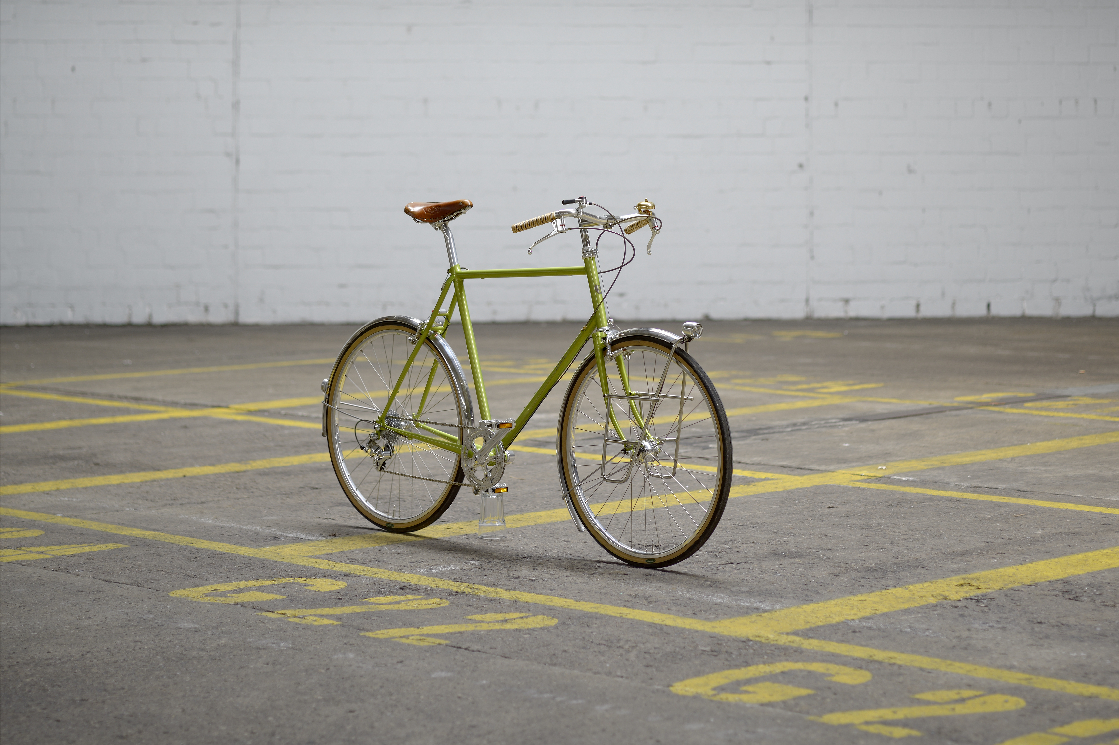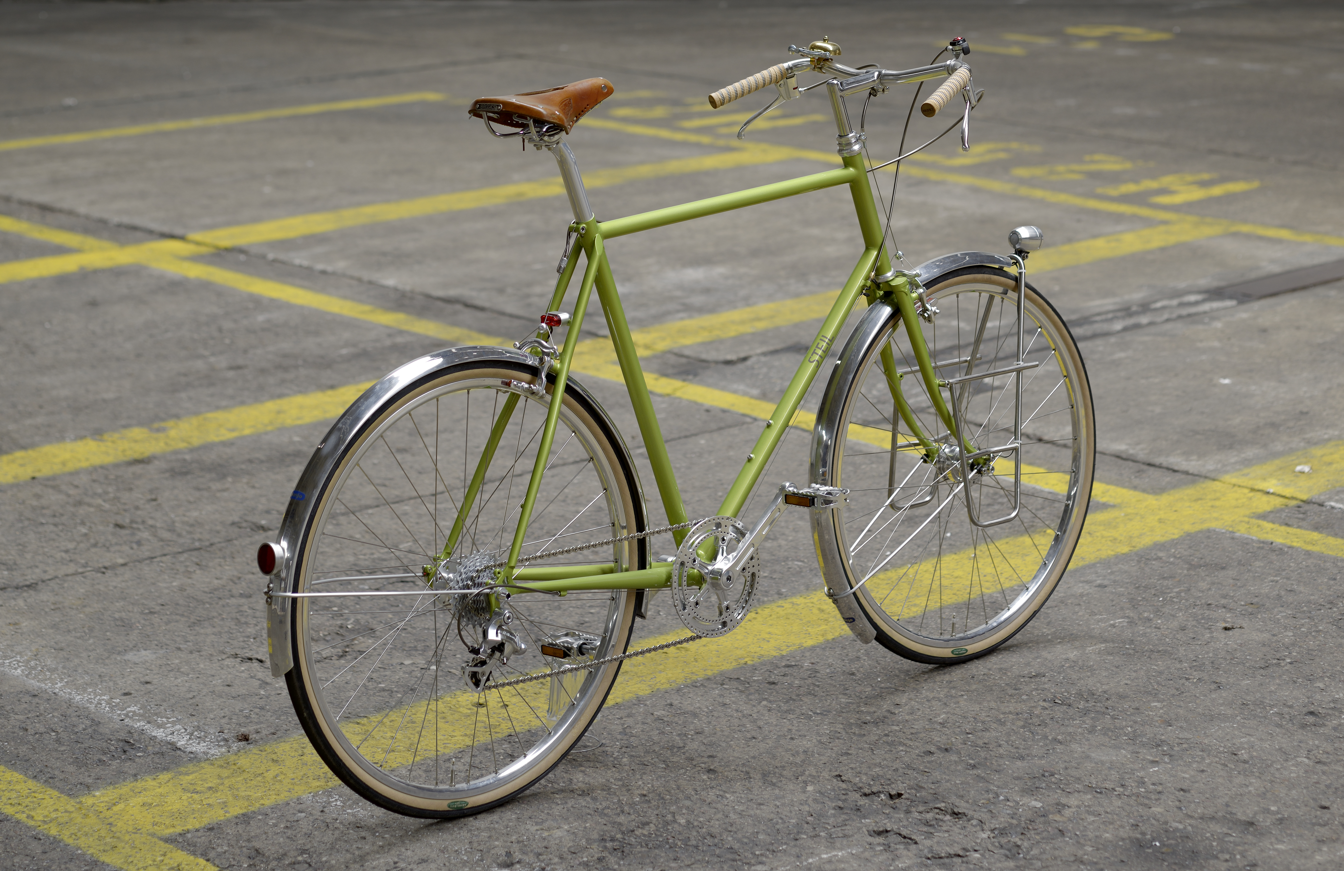 Bettina’s Roadster is ‘a roadster for urban everyday life and small tours for a tall woman with very long legs. Equipped with 650B wheels, brazed-on centre-pull brakes and a custom lowrider. And many special details from the headlight mount to the perforated trouser guard ring and the then exclusive rear light to the home-made reflector.’