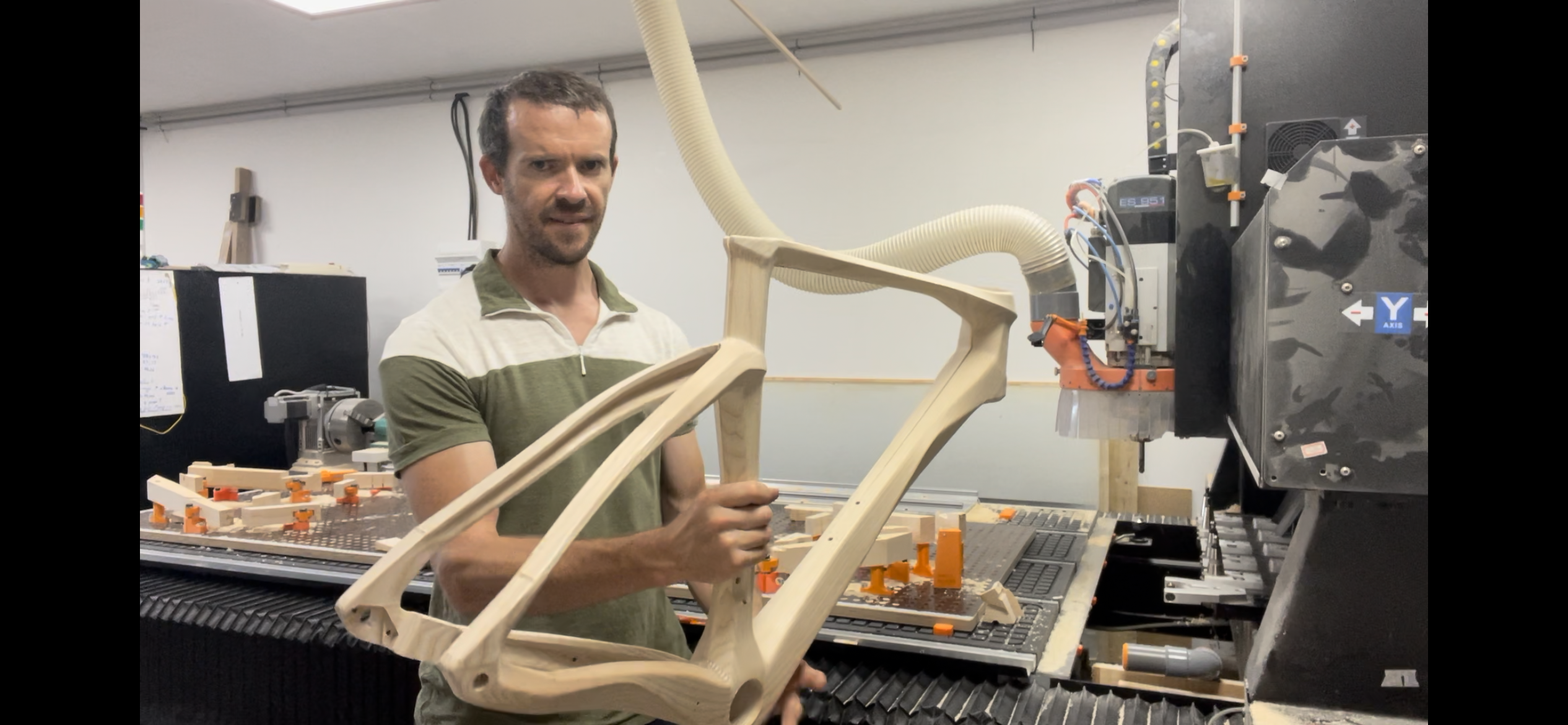 All parts are glued with epoxy glue. The two half-shells (yes, the frame is hollow), perfectly symmetrical right down to the wood grain, are machined using a numerically controlled machine with a precision of a tenth of a millimetre before being glued together, sanded, then varnished.