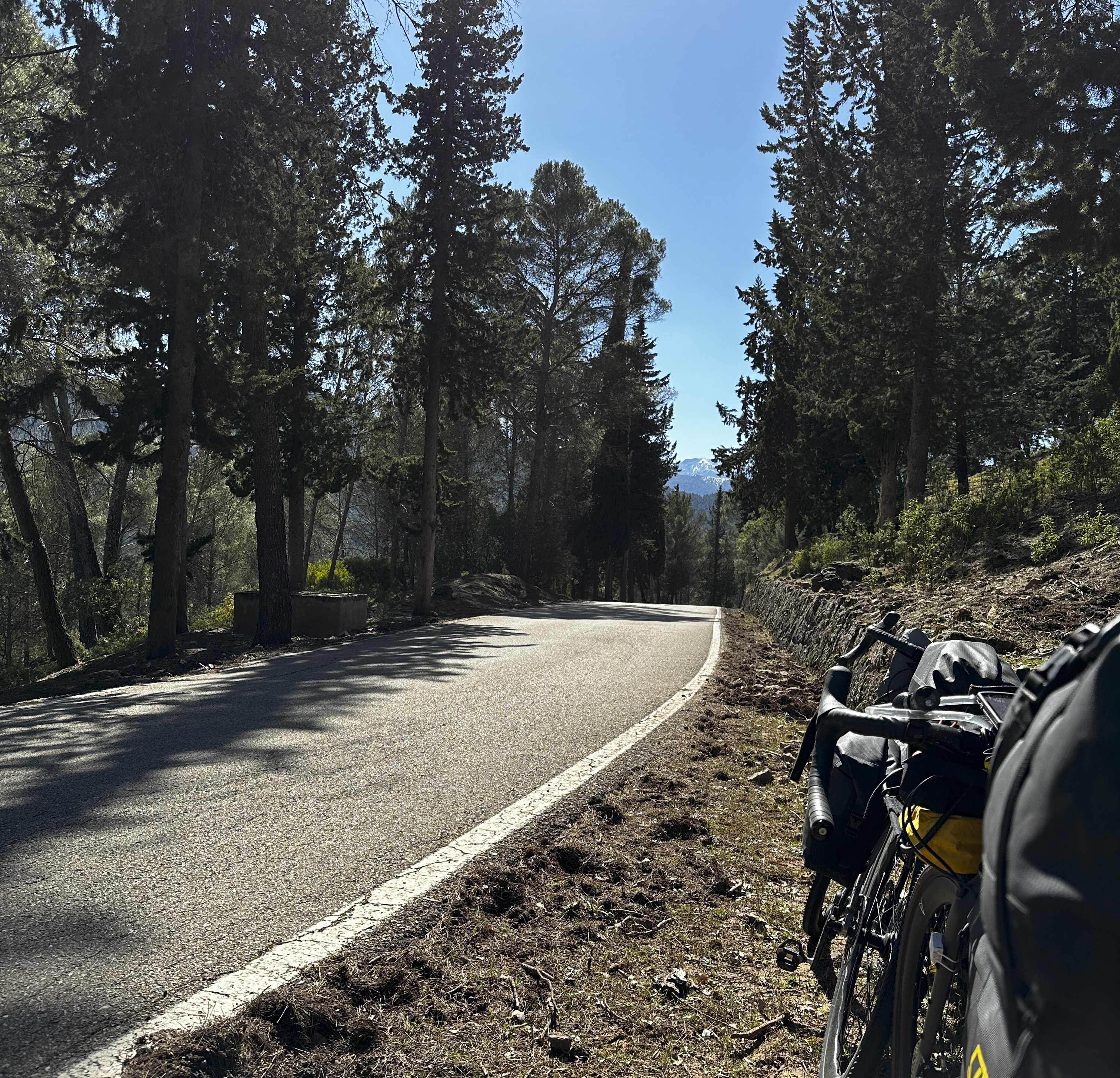 The aforementioned hill that we’re going up and over to get to Quesada is quite well signposted, as it’s more than just a hill. The Puerto de las Palomas is a road through two mountains inside the Sierra de Grazalema Natural Park with a summit of 1,241m. To my surprise, and no doubt Rhys’, I’m quite excited to pedal up this one. The energy in Arroyo Frio has given me a secure feeling, as if we’re in the right place and doing the right thing for the first time in days. To add to that, just as we set off on the climb there’s two bikepackers coming down with huge grins on their faces.