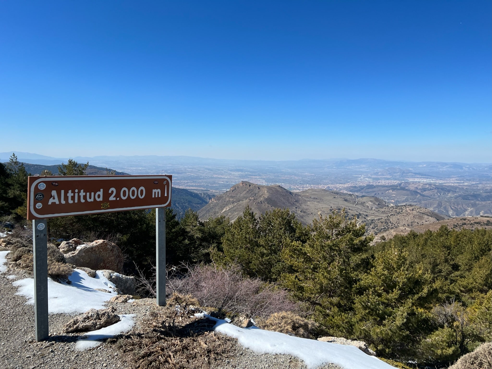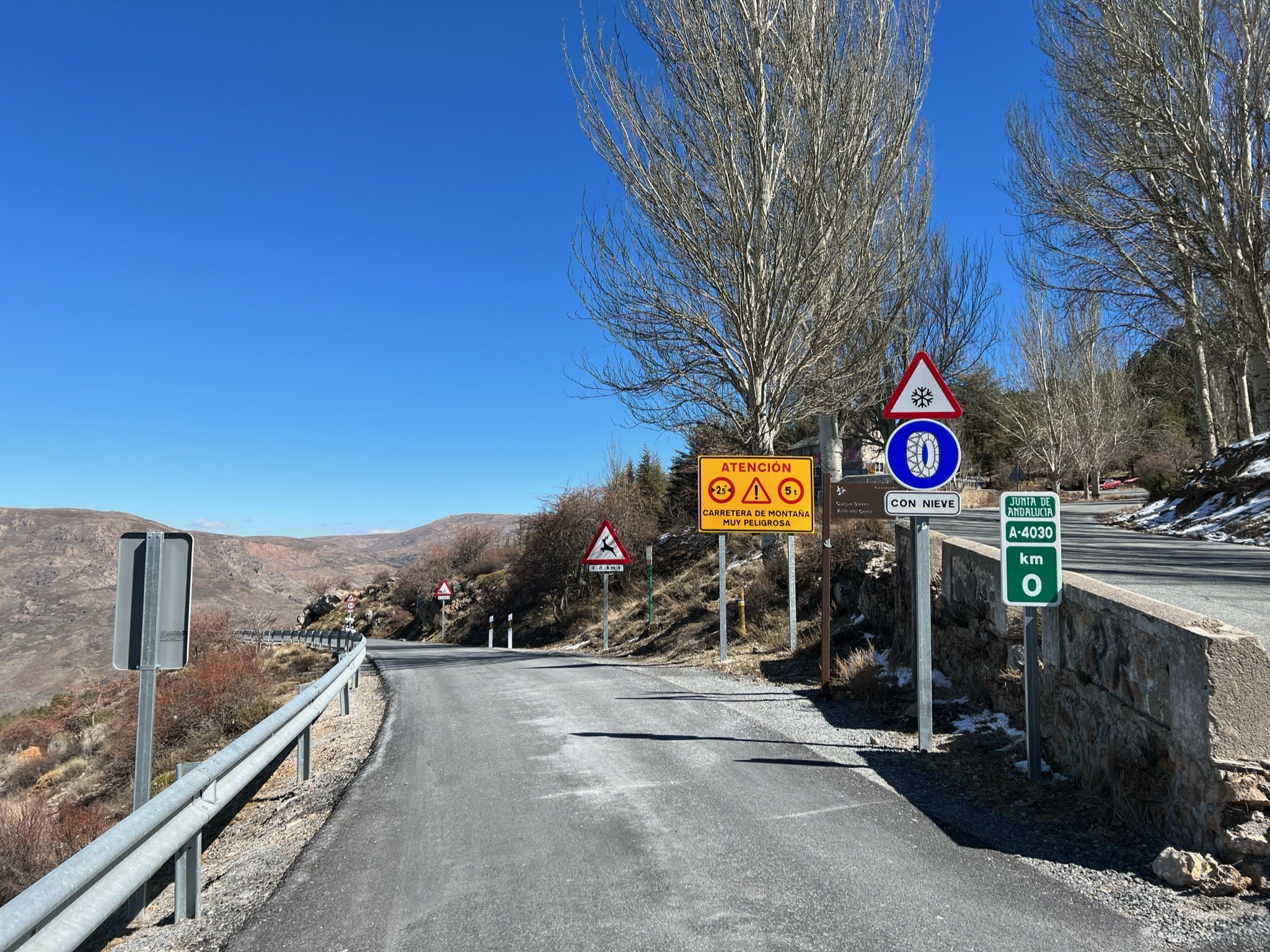 The route I chose was naturally the hardest one available; via the savagery that is the Haza Llanas climb. A brute in its own right with 7km averaging 10% gradient, let alone in the middle of a much larger climb to the snow barrier at Hoya de la Mora. I breathed, sweated, struggled and churned my way up Hanza Llanas, topping out at 2200m where the air was getting cold and thin. Things were easier from here, 7% feeling flat compared to the brutality below. I rejoined the main road and shared the sunshine with daytripping families and their cars decorated with skis…