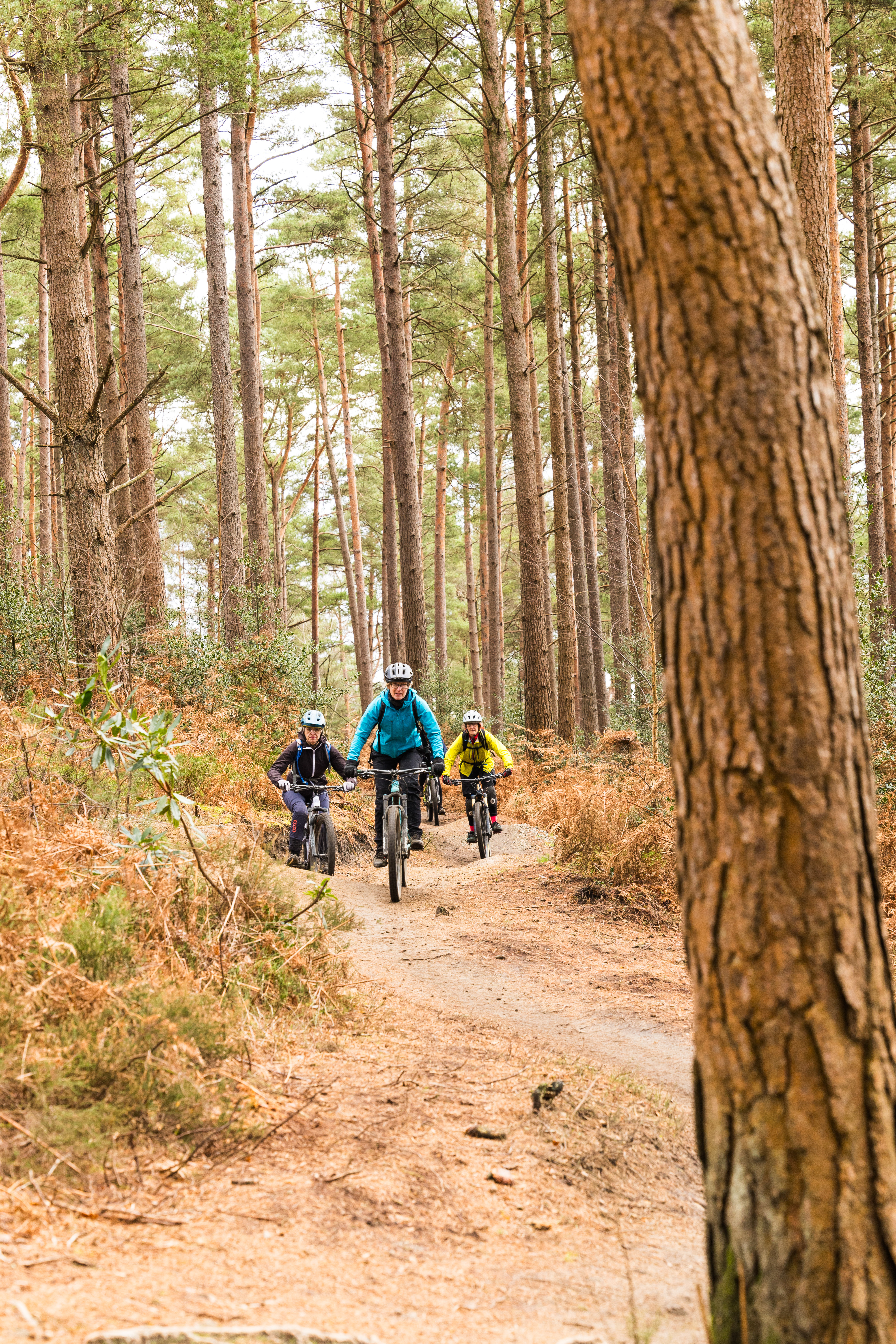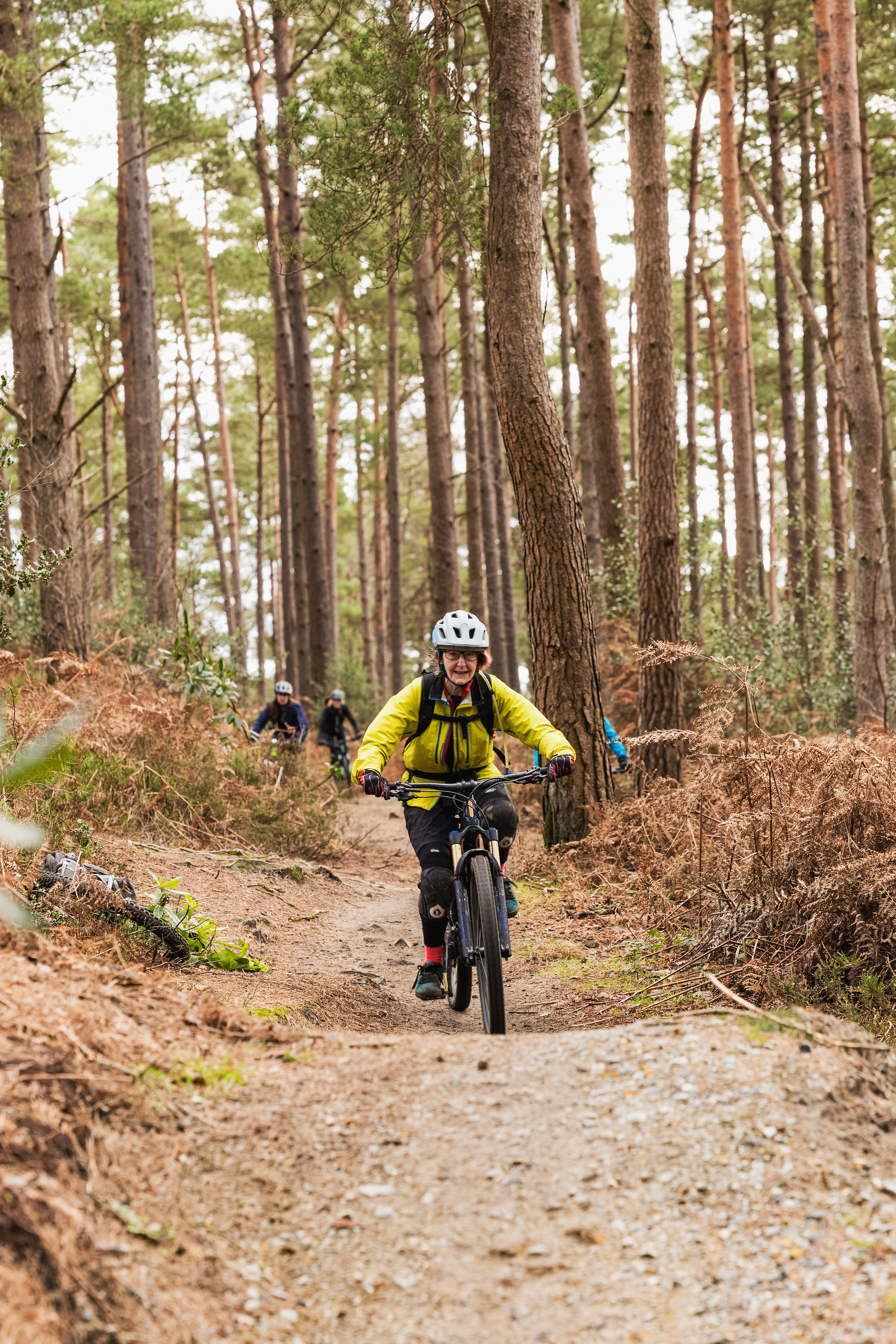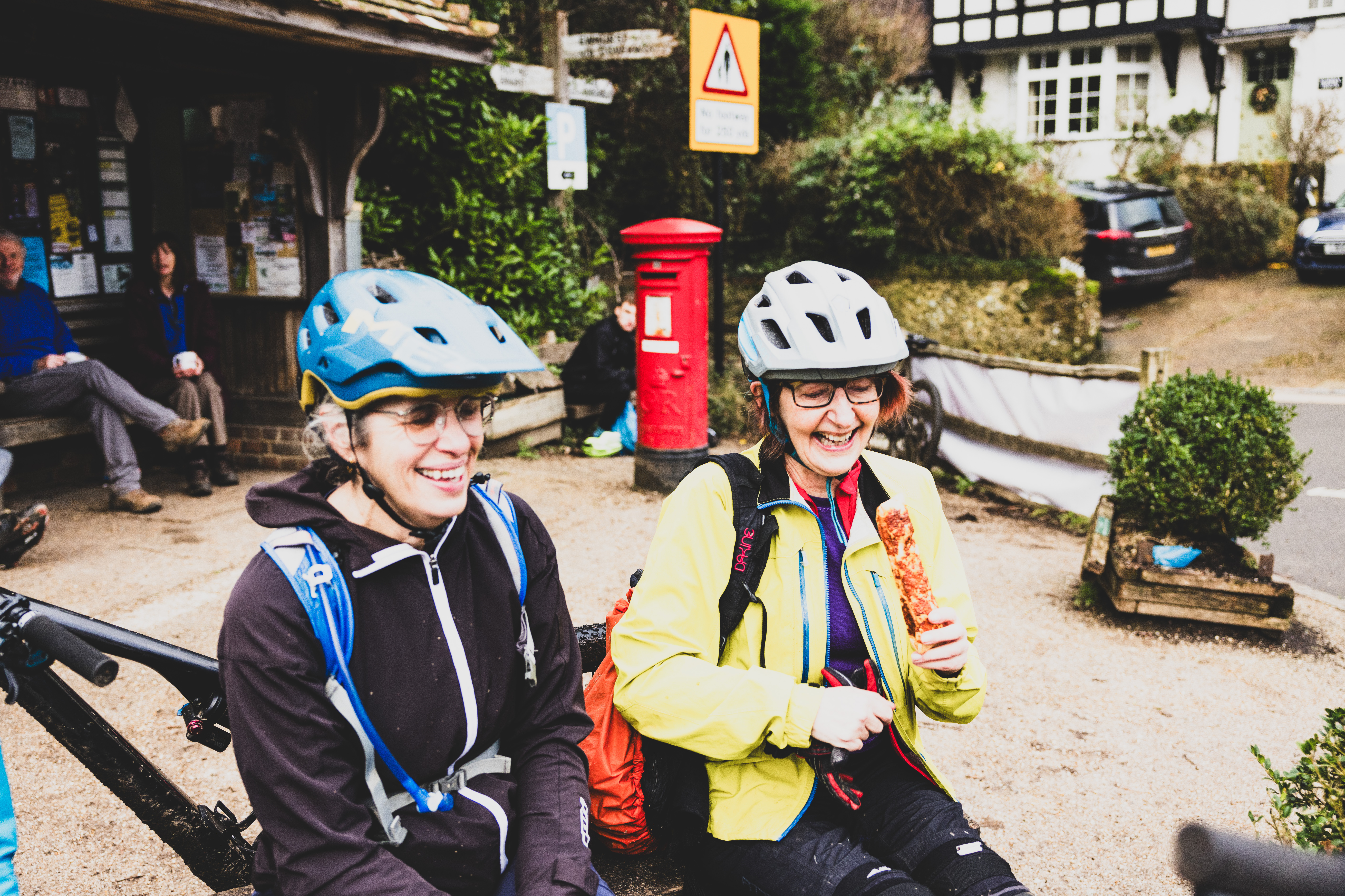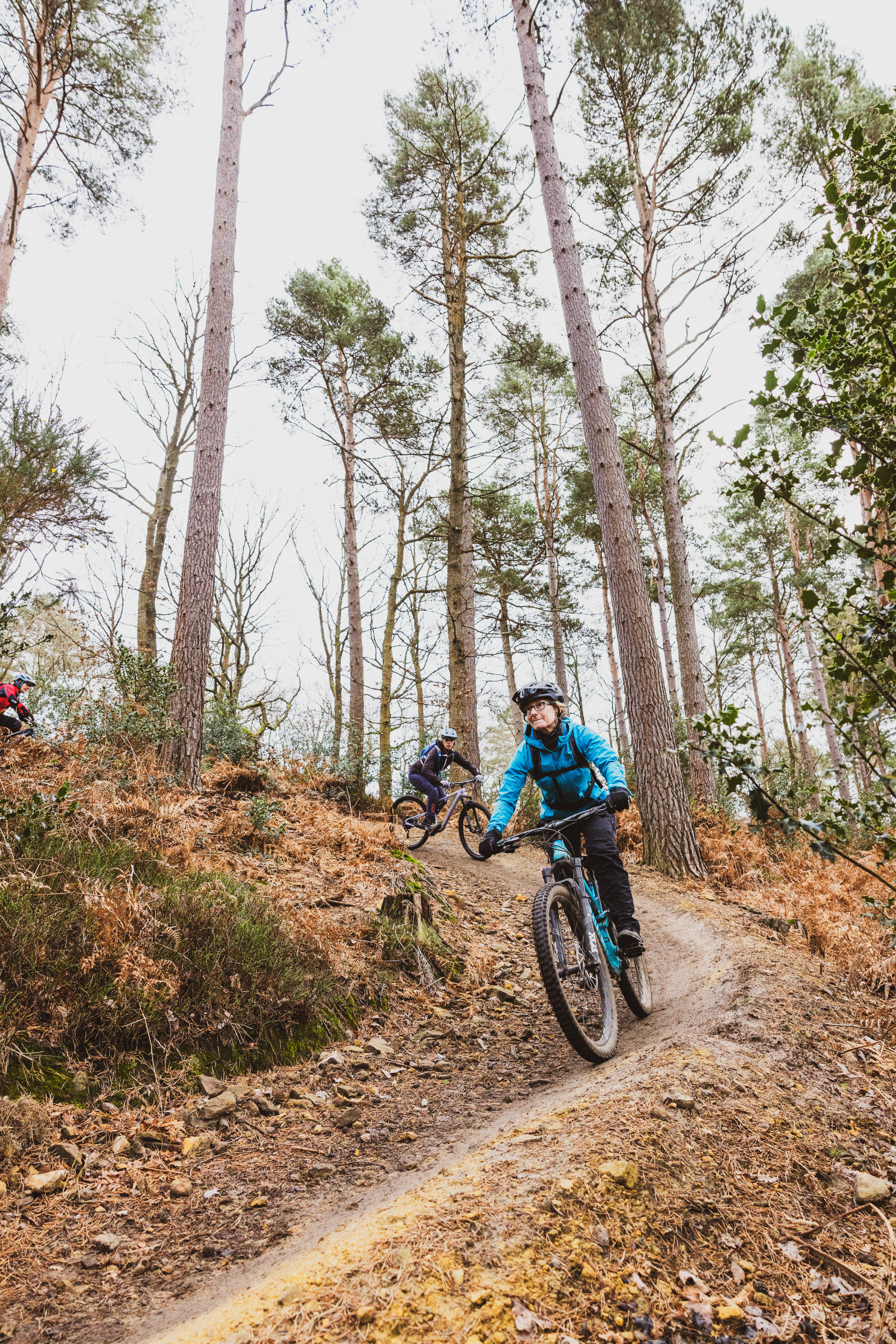 Sally is a long-time group member. She’s generally fearless and was the first of us to conquer the infamous and frankly rather challenging Jacobs Ladder descent on a recent ‘girls’ trip’ to the Peak District (next time we might just opt for a nice sensible city break in Barcelona like normal women do). Mel is new to the group but not a new rider: she’s ridden in the Surrey Hills for ten years and used to travel down from London before realising it was easier to just move here. She recently recovered from breast cancer and is riding an e-bike but, being a good sort, resists the temptation to leave us for dust on the hills. Jack is the newest rider (though she’s been a good friend for years). She’s on a hardtail and prefers to avoid the more sketchy descents. None of the trails are long so there’s no danger of newer riders being left behind, but neither are the trails graded or inspected. Plus, pedestrians have the right to roam, so there’s every chance you will meet one on the trails. In other words, you never know what’s around the corner so it’s always best to ride within your limits.