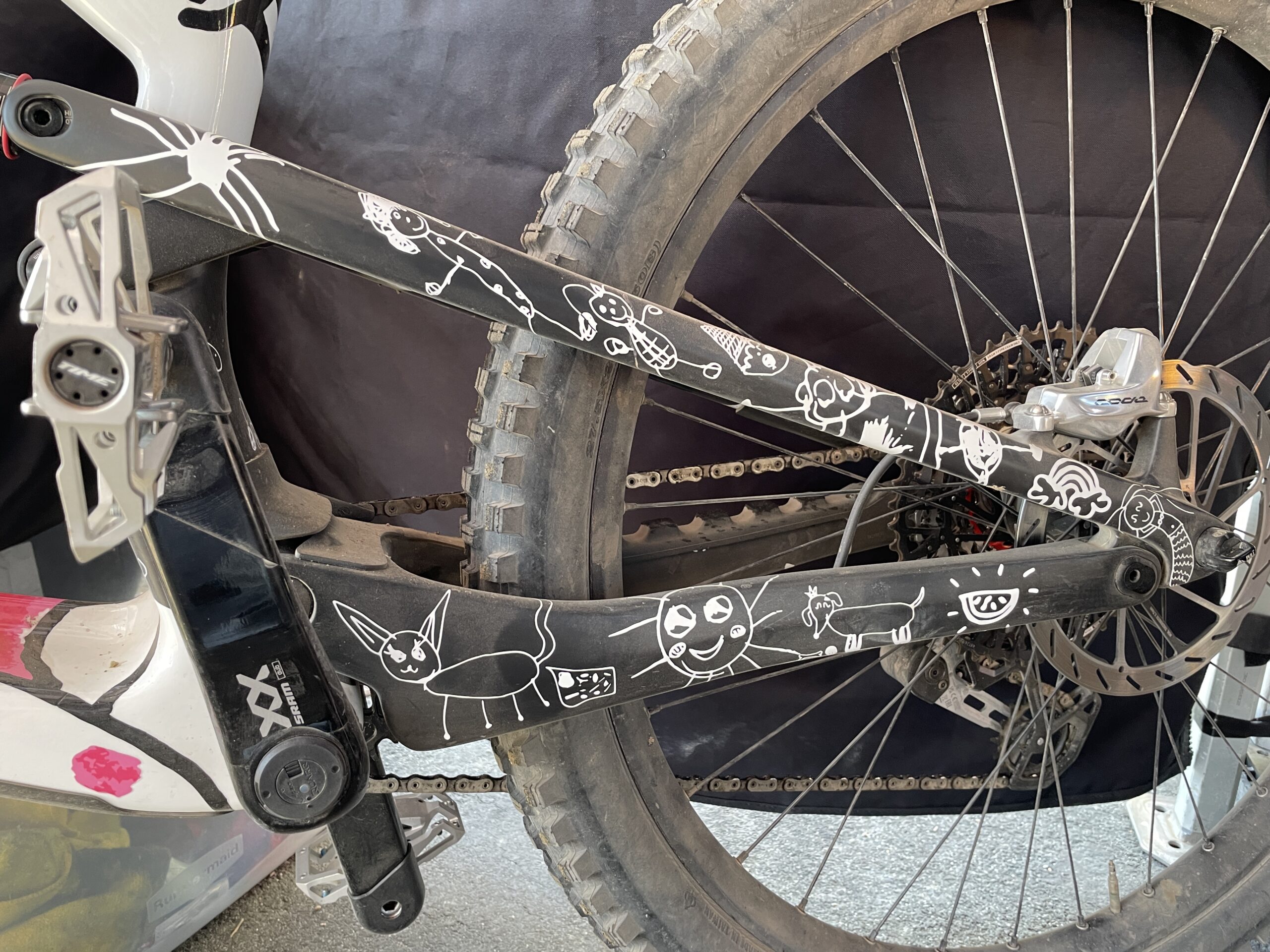 Canyon is just amazing, and they, you know, wanted to make me something special, just because they, I guess, appreciate me, and I was very honoured. My wife sent over some photos of the drawings that our daughters would draw on the kitchen table, and it was kind of piling up in the pantry, on the pantry shelves. She just laid them out, took pictures and sent them over. And then they put it together and painted a special bike up and here it is.