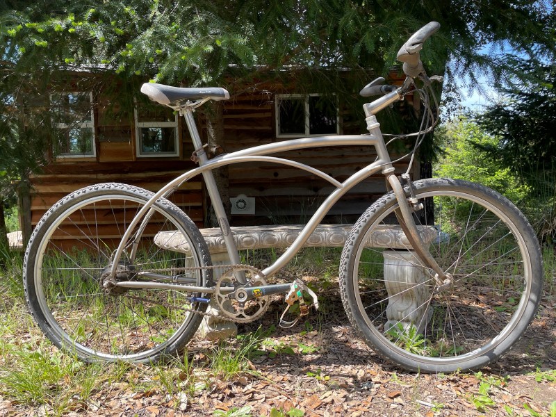 I went to a couple more races. The bottom bracket on those stock bikes is about seven inches off the ground and it’s got a one-piece crank and you can’t put a good set of forks on. I go ‘What if?’ I have my welding shop, that’s always where I made stuff and I was a welder, and so I said ‘We need to change this bike, so it’ll take a good set of forks. And take a good set of cranks. And so the chainstays are the right length… with adjustable dropouts, the works.’ So I went down to a bike shop, Pullins Cyclery in Chico. I said ‘Hey, you got any old junk mountain bikes?’ He goes back to something in the dumpster. He reappears with whatever there was. Probably a first-year Bridgestone mountain bike frame. I took it home… we put the cruiser in a vice in my shop by the bottom bracket. There’s no jig, right? That hadn’t happened yet. To keep somewhat of some kind of geometry then, what I did was, I chopped out the downtube of the Bridgestone and brazed in the curved Schwinn one. Then I chopped out the straight top tube of the Bridgestone because the bottom tube kind of held it together and I put the curved tube of the Schwinn. Brazed them in, put the ‘beauty’ tubes on that go all the way down, brazed them in. Then I have some Ritchey forks, now I can take a beautiful one-inch headset. All the components could now be high-tech. And I had a high bottom bracket.