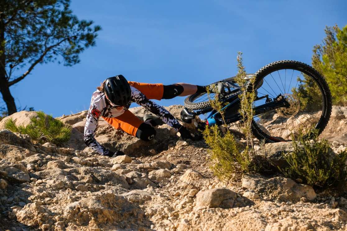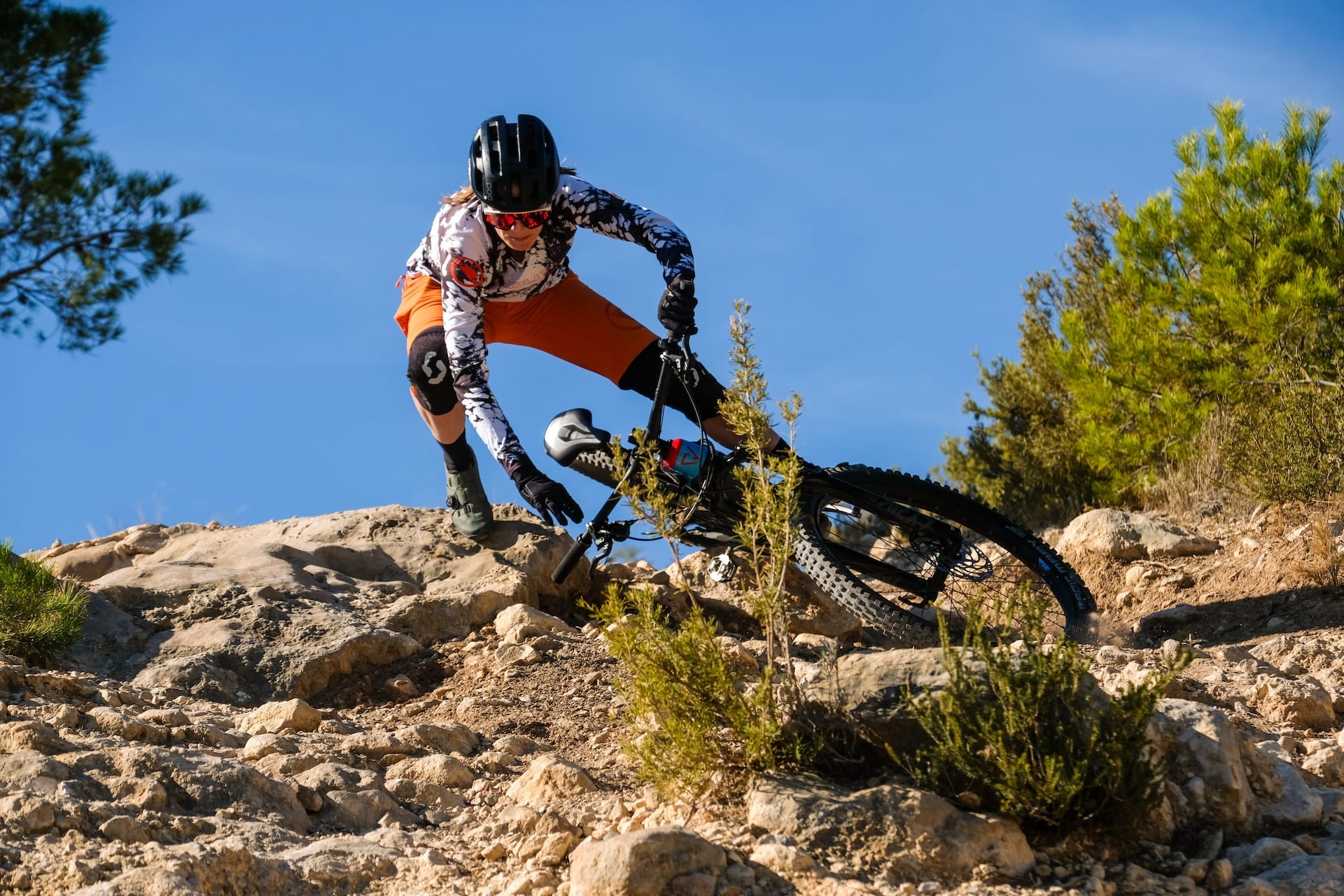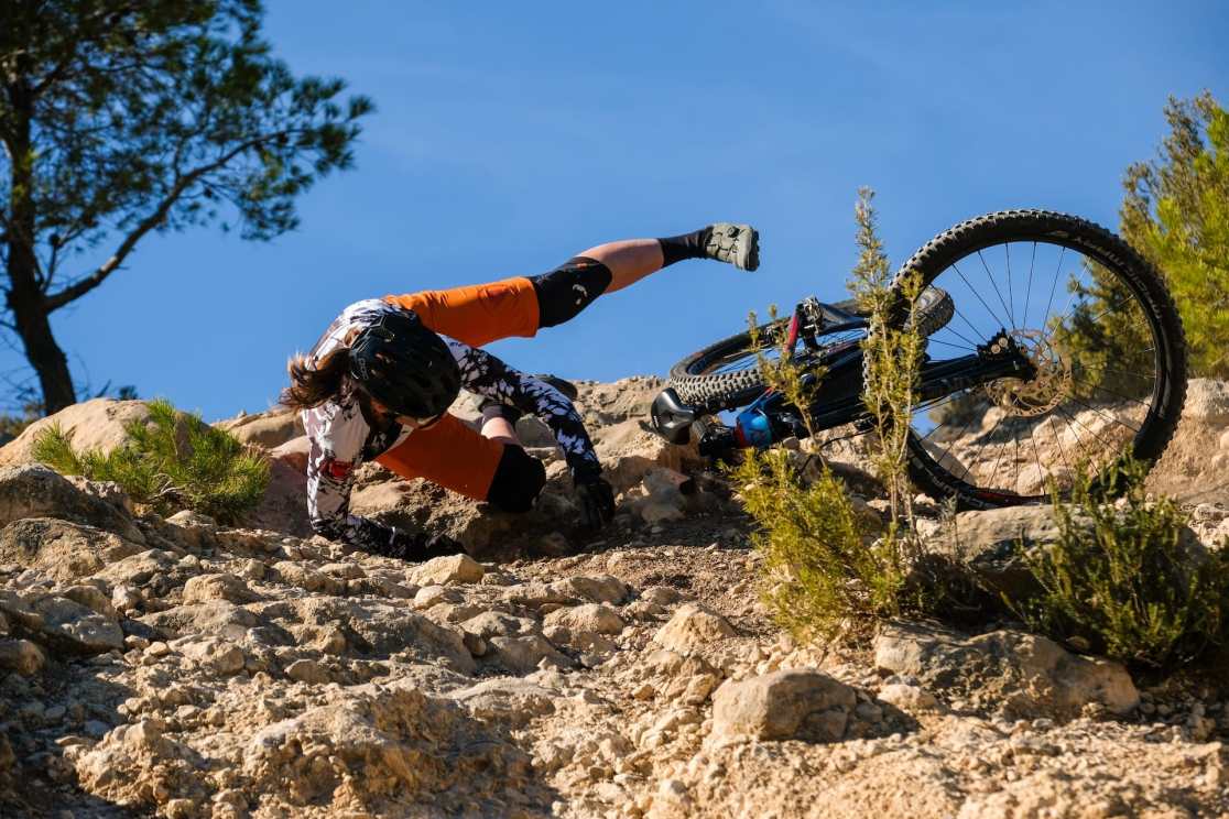 Our descents turn to climbs again and, even with epower, we struggle to keep a line on the rough, disintegrated trail surface. Although there are some bespoke mountain bike trails here, most are walking trails, old olive grove terraces or ways between villages. Don’t expect groomed trails and, unless you relish a challenge, never ask José if there’s anything steeper or more technical, as he’ll call your bluff and throw you into more steep and loose stuff than you might want to handle. We briefly lose Cristina to one of the descents, but she recovers with an agile stuntwoman roll, ready to take on the next section.